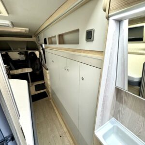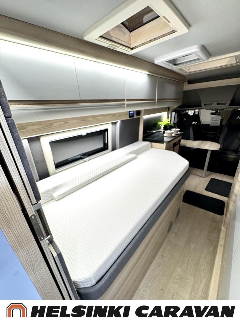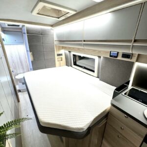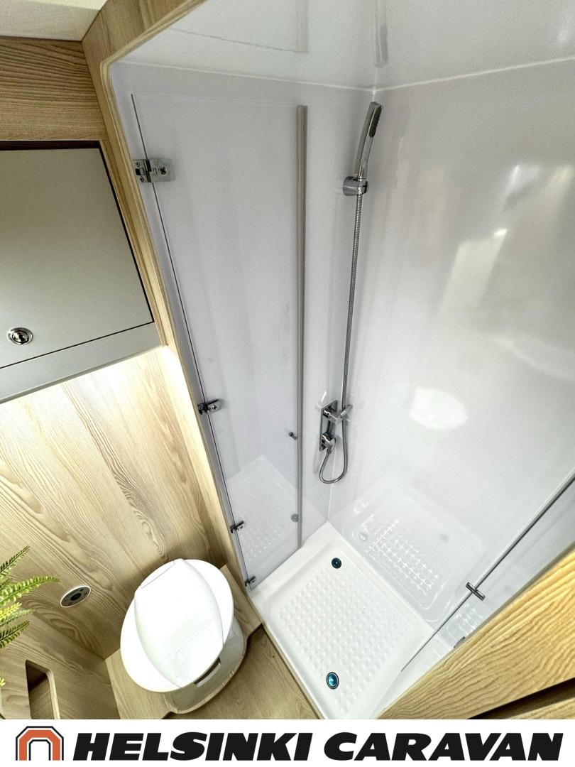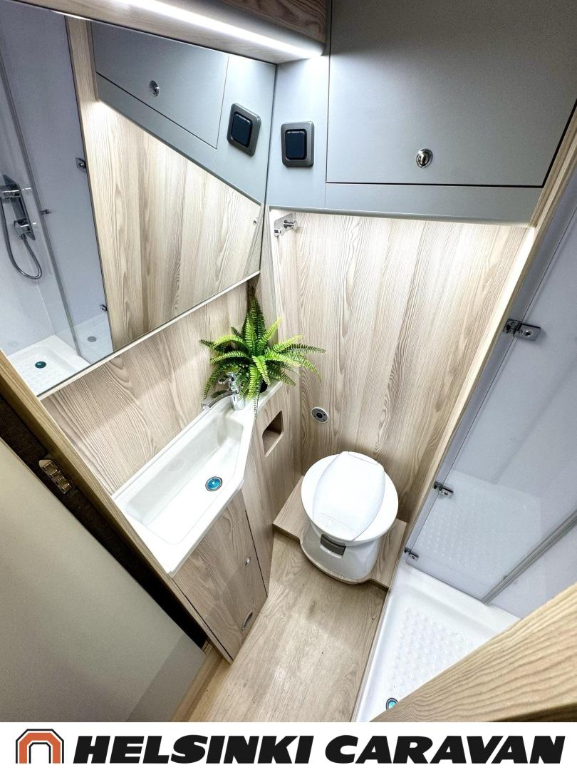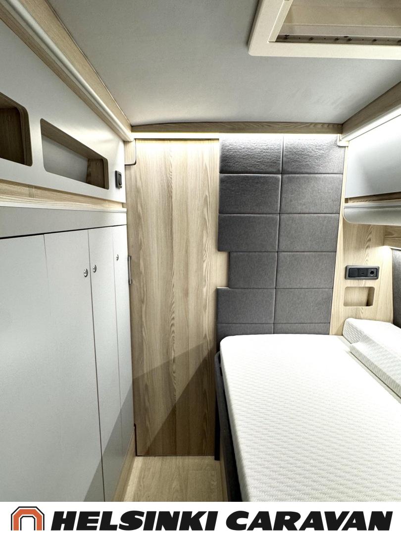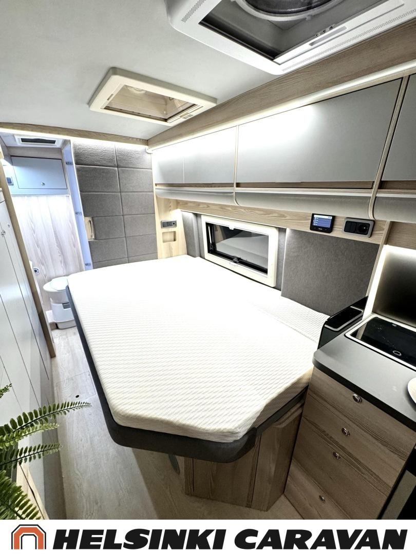 Käytännölliset tilaratkaisut: Keskellä autoa sijaitsee leveä parivuode ja takana tilava kylpyhuone, jossa on erillinen tilava suihkukaappi, ja joka lisää mukavuutta etenkin pidemmillä matkoilla.