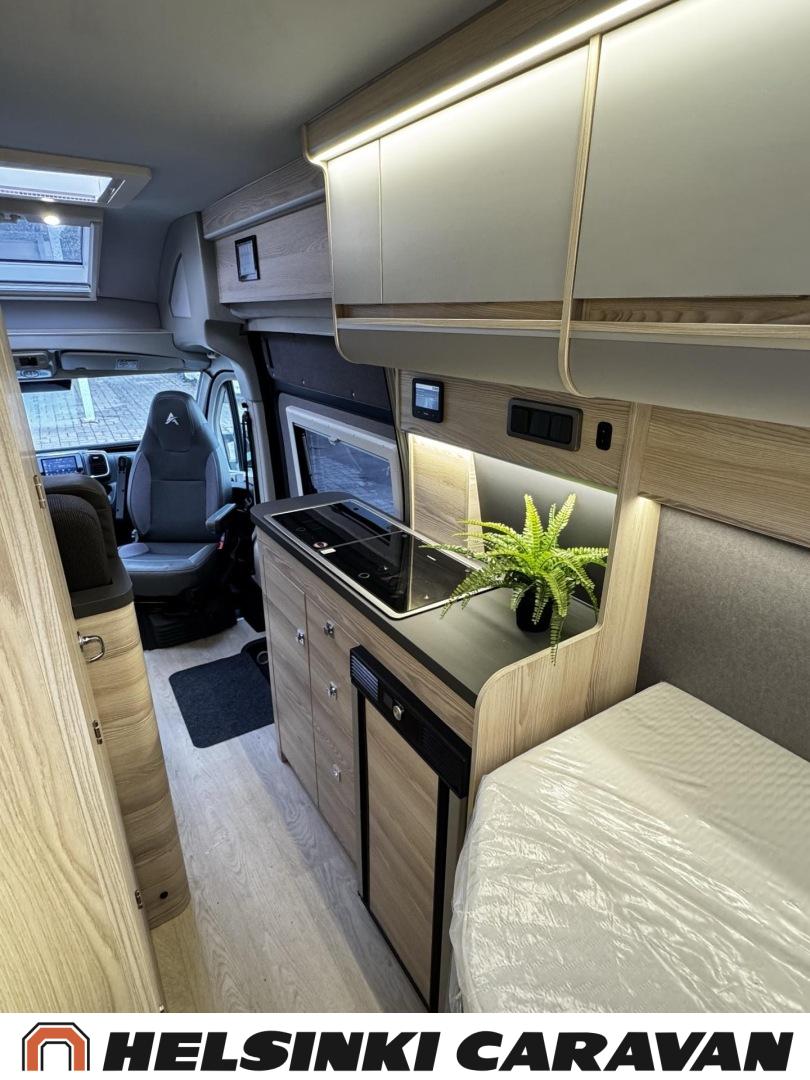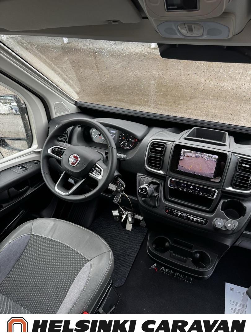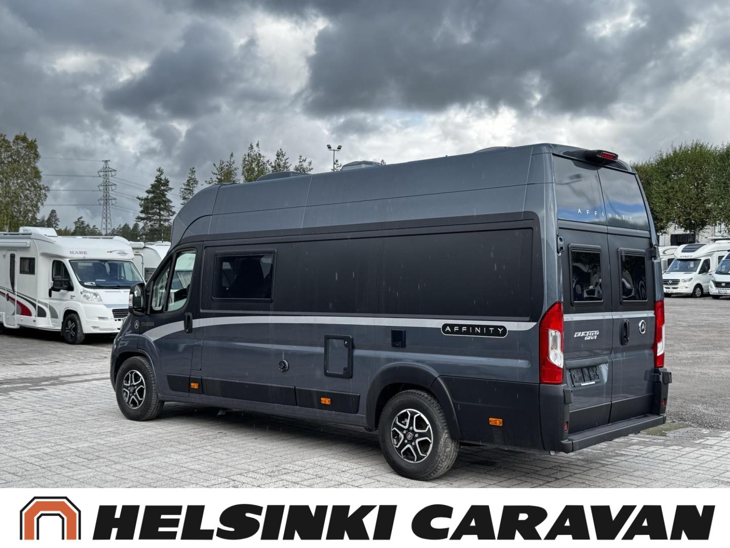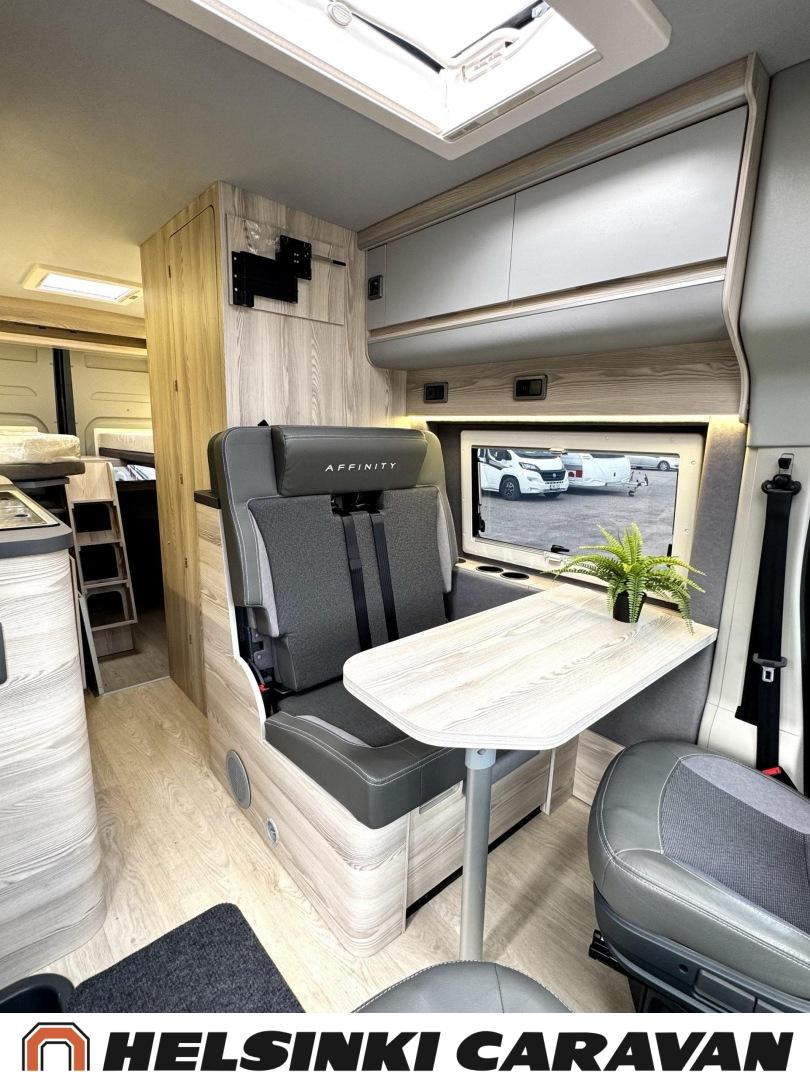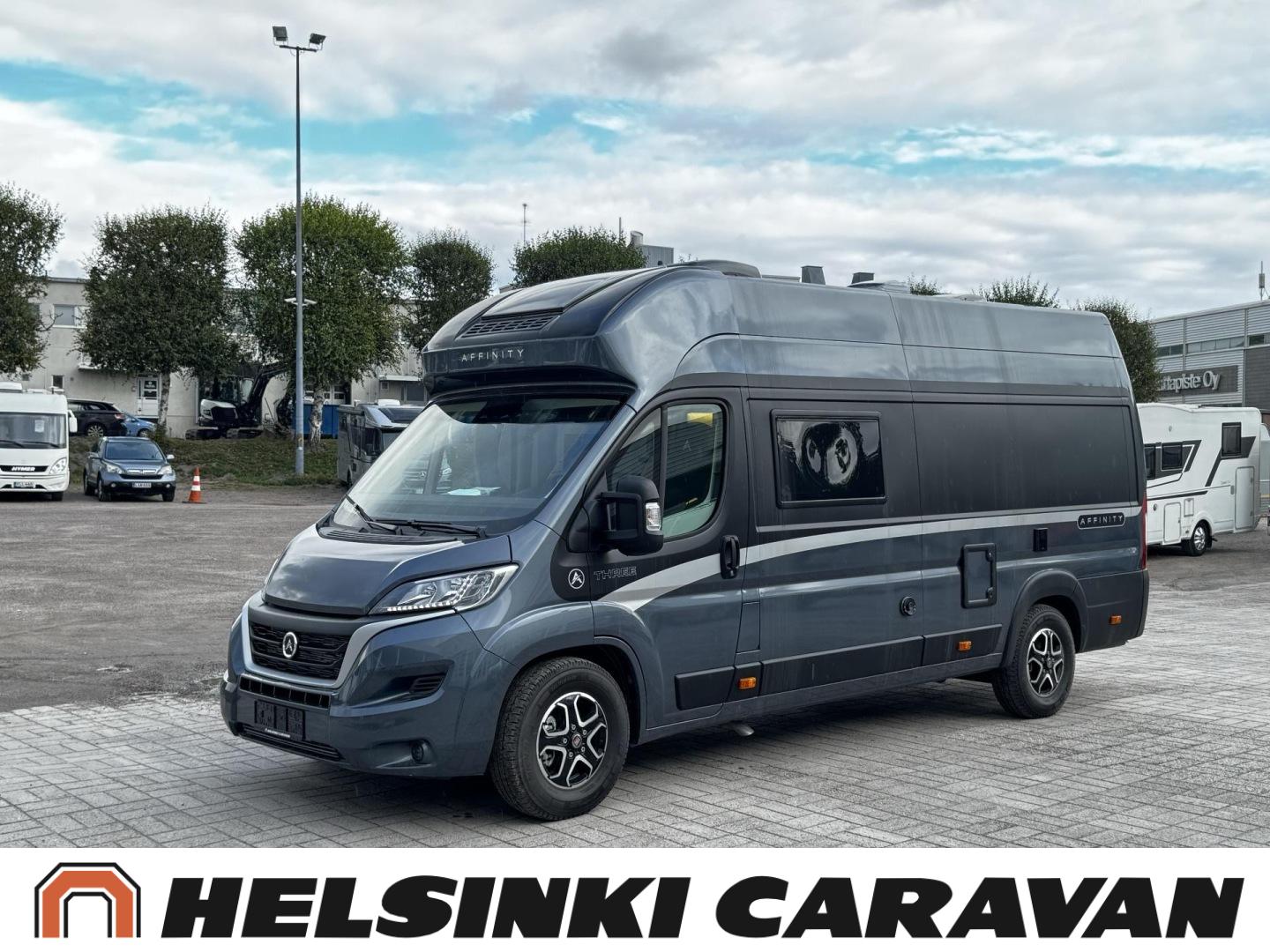 Säästä ajamattomasta esittelymallista nyt lähes 8 000€! Huipputyylikäs Affinity vaativaankin makuun! Affinity Three on aktiiviselle pariskunnalle tai 2+1-perheelle suunniteltu matkailuauto, joka tarjoaa hyvät tilat liikkumiseen ja leiriytymiseen. Kaksi aikuista ja lapsi mahtuvat siihen mukavasti. Sen sisätiloissa viihtyy ja pystyy toimimaan normaalisti myös pitkillä matkoilla. Seinäkaappien suorat linjat sekä jääkaapin ja vaatekaapin sijoittaminen silmien korkeuden alapuolelle laajentavat sisätilaa visuaalisesti ja saavat sen tuntumaan kokoaan suuremmalta. Hyvin valituilla teknisillä yksityiskohdilla on saatu lisää ”senttejä” niin auton sisäleveyteen kuin -korkeuteenkin, mikä tekee asunto- osasta poikkeuksellisen avaran.