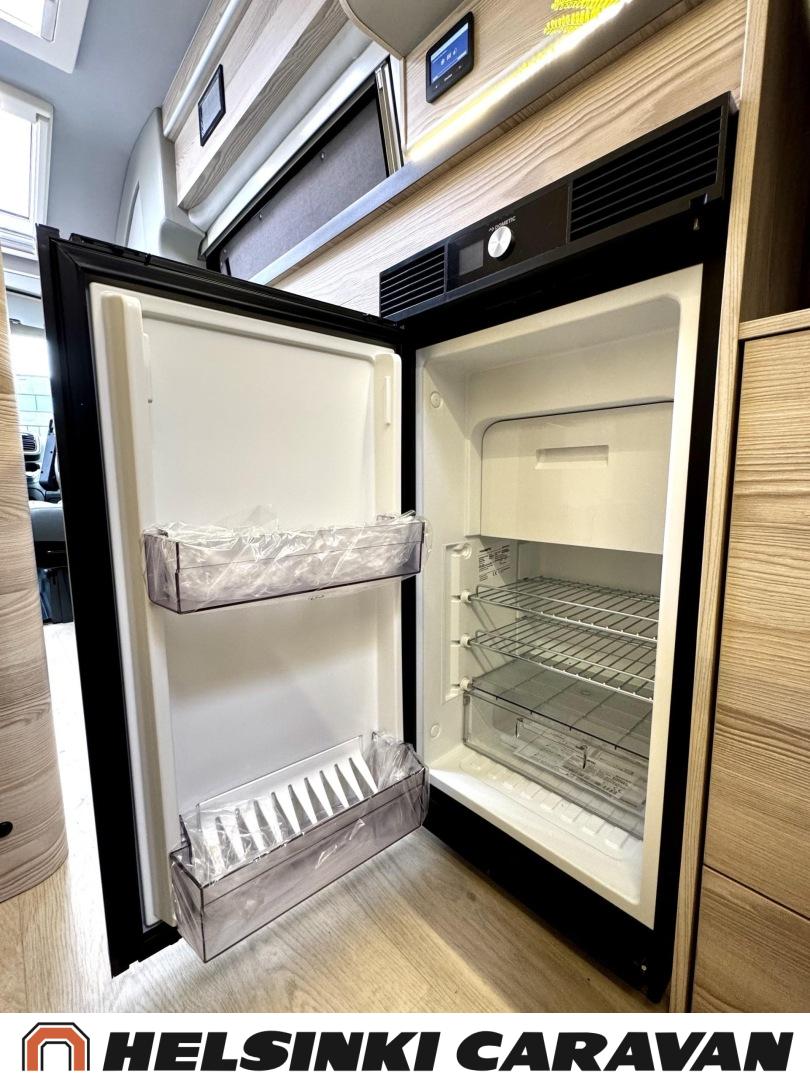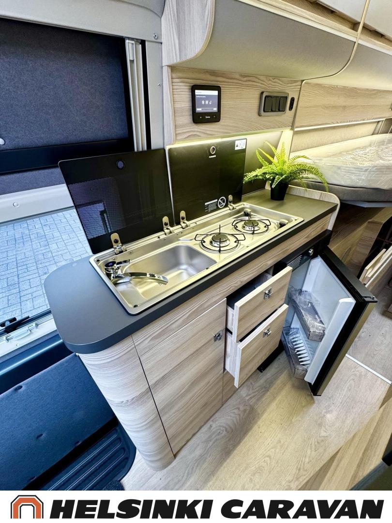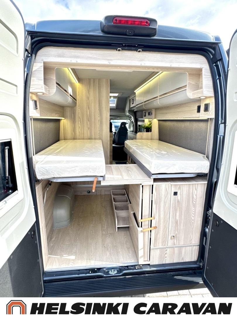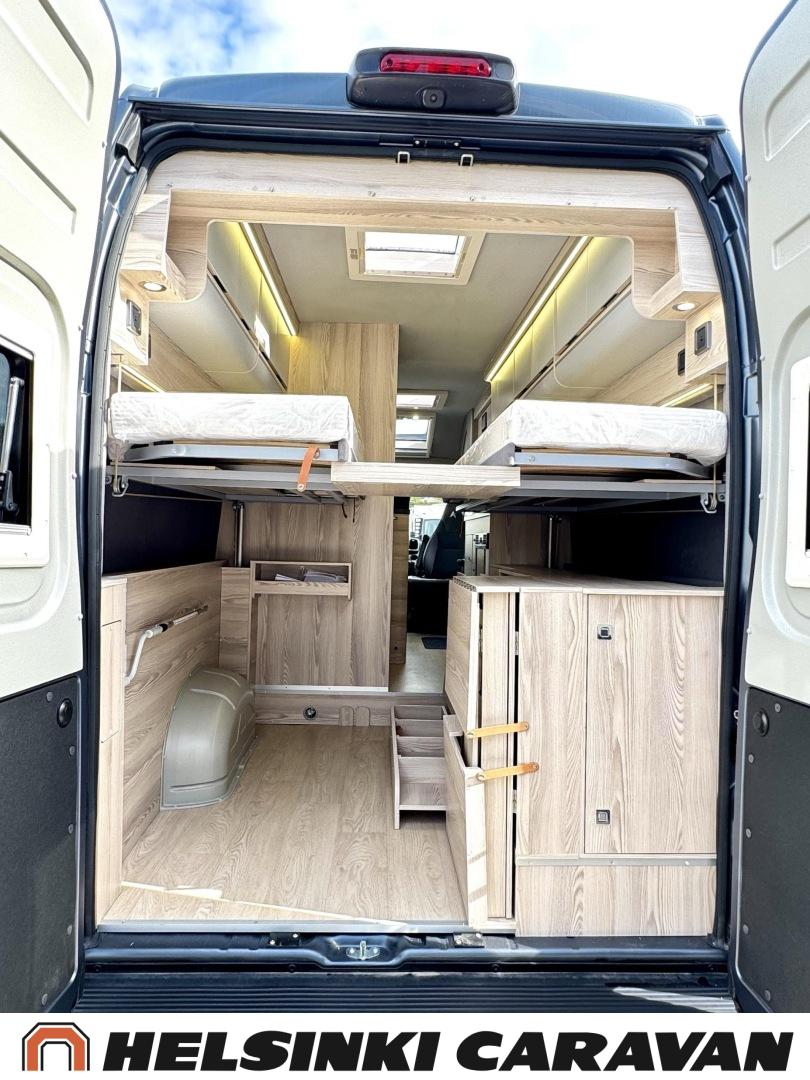 Keskeltä autoa löytyy hulppea L- keittiö, joka tarjoaa mahtavasti laskutilaa useimpiin muihin retkeilyautoihin verrattuna. Jääkaappi on Dometicin innovatiivista molemminpuolin avattavaa mallia. Keskellä on myös on pesuhuone/ WC ja takana sähköisesti korkeussäädettävät leveät erilliset vuoteet, joiden välissä helppo liikkua. Sähköisesti ylösnostettava vuode mahdollistaa esimerkiksi polkupyörien kuljettamisen auton takatilassa. Myös muut säilytystilat ovat retkeilyautojen eliittiä ja auto tarjoaakin erikokoista laatikkoa ja kaappia lähes hengästyttävän määrän.
