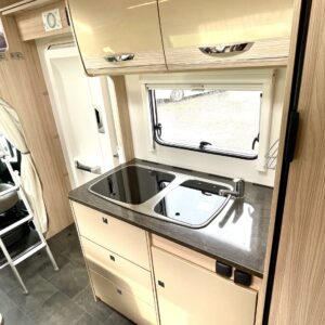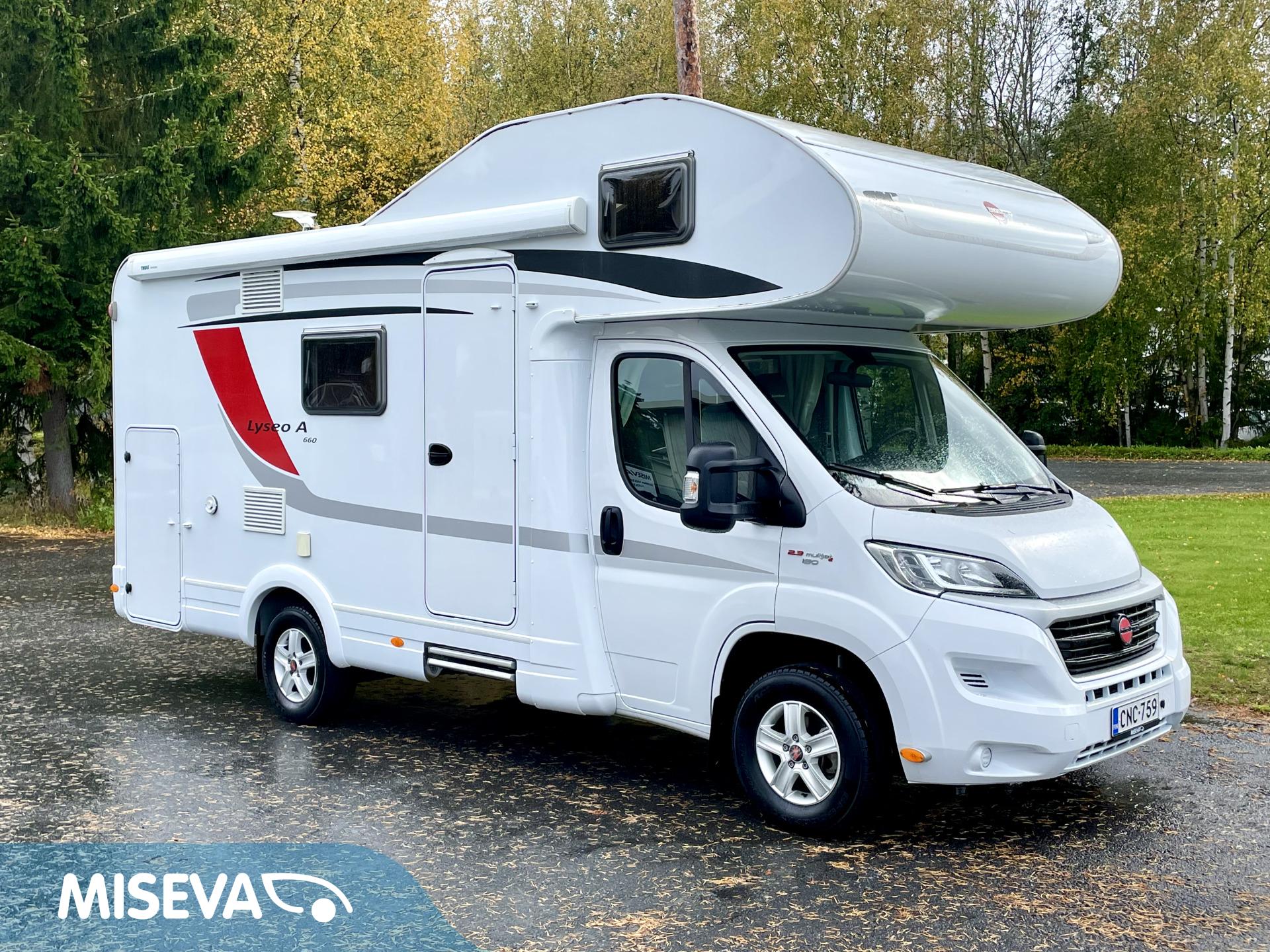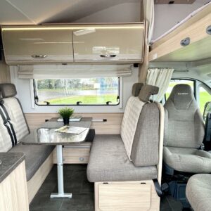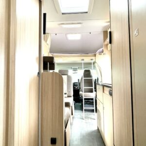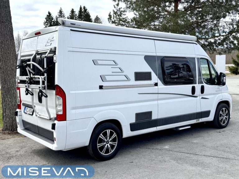 Jos meidän autoja sanotaan siistiksi, niin tämä on kyllä supersiisti. Valoisa ja avara perhematkailuauto kuudelle yöpymiseen. Kerrosvuoteet takana ovat omassa rauhassa ja tarvittaessa alasängyn saa myös nostettua ylös, jolloin takatallin tila kasvaa. WC- ja suihkutilassa jatkuu sisustan tyylikkyys ja kaappitilaa löytyy hammasmukeille ja vanulapuille. Keittiössä kaappitilaa on samoiten ja isoon jääkaappiin mahtuu kaikkien eväät. Ruokaryhmästä saa tarvittaessa sängyn ja turvavyöthän löytyy tästä kaikille matkustajille. Alkovista os suorastaan ruhtinaallinen tila siellä nukkuville. Tästä huippu siisti matkakumppani.