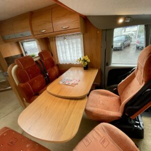 Viihtyisä ja avara pohjaratkaisu: Auton etuosassa on pöytäryhmä, jonka ympärille mahtuu kääntyvien etuistuinten ja sivusohvan ansiosta jopa kuusi henkeä. Ohjaamon päälle laskeutuva nostovuode tuo lisää vuodepaikkoja käden käänteessä.