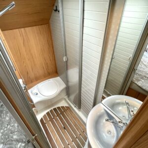 Auton peräosassa on pitkittäinen parivuode ja mukavan avara pesuhuone/ WC. L- keittiö isolla jääkaappi- pakastimella varustettuna on keskellä autoa.