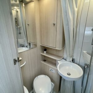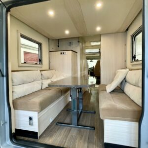 Harvoin on tarjolla tällaista monikäyttöpeliä ja vieläpä näin hienossa kunnossa. Auton takaosasta löytyy vastakkain istuttava sohvaryhmä ja sen yläpuolelta laskeutuu alas parivuode. Vuoteen ollessa ala-asennossa sohvapenkit tarjoilevat vielä 150x60cm vuoteet esim. lapsille. Keskelle autoa on sijoitettu WC-tilat ja keittiö. Edessä on pöytäryhmä minne yhdistyvät kääntyvät ohjaamon penkit ja sisäänkäynnin vieressä oleva pikkupenkki. Auton erikoisuushan on koko takaseinän mitalla ylös avautuva takaluukku. Tähän saa alle näppärästi vaikka pienen pöytäryhmän aamukahvittelua varten. Jos enemmin katettua tilaa haluaa pihan puolelle, niin tokihan tästä löytyy myös markiisi. Lämmitysjärjestelmänä on nopeasti lämpöä tuottava Trumatic ilmakeskuslämmitys ja sähkövastuksilla varustettuna. Sähkön omavaraisuudessa auttaa katolle sijoitettu aurinkopaneeli. Ohjaamossa kuljettajaa hellii automaattivaihteisto, vakkari ja automaatti-ilmastointi. Todella monikäyttöinen kokonaisuus, kannattaa tulla tutustumaan paikan päälle.
