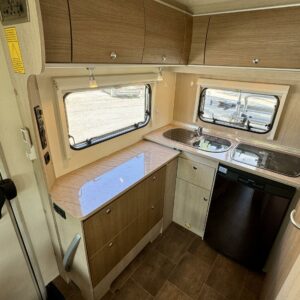Auton takaoasasta löytyy runsaasti laskutilaa tarjoava keittiö ja tilava pesuhuone/ WC.