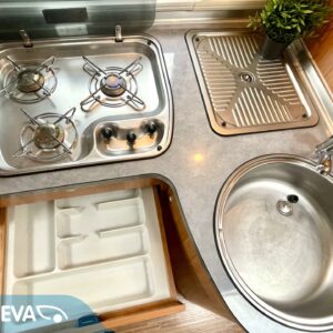 Edessä tilava istuinryhmä jopa kuudelle, auton keskiosassa keittiö ja ylös nostettu reilun kokoinen jääkaappi, takaosassa WC ja pitkittäinen parivuode. Autosssa on lisäksi invertteri, lattiassa sähköinen lämmitys ja katolla aurinkopaneeli.