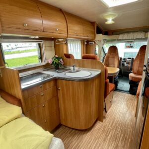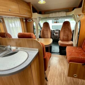 Avara pohjaratkaisu; Auton etuosassa on viihtyisä istuinryhmä. Sivusohvan ja kääntyvien etuistuntein ansiosta pyödän ympärille mahtuu mukavasti 6 henkeä tulevia seikkailuja suunnittelemaan.
