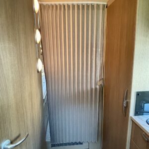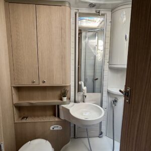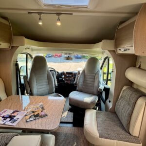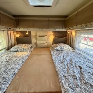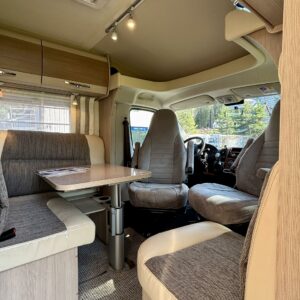 Hämmästys on suuri, kun astuu autoon sisään. Miten tässä onkin näin paljon tilaa? Neliöt on toden totta autossa käytetty fiksusti. Takaa löytyy erilissänky, mistä saa takaosan kokoisen sängyn lisäpaloilla. Sänkyjen alla on säilytystilaa takatallin muodossa, sekä kätevät vetolaatikot sukille ja muille pitsialkkareille. Vaatekaappi on suorastaan valtava, eikä iltaleninlejä tarvitse jättää kotiin tällä autolla matkustaessa. Wc- ja suihkutilassa löytyy siirreltävä lavuaari, jolla tilaa saa muunneltua käytön mukaan. Neliöitä on tosiaan ajateltu tässä autossa fiksusti. L-muotoinen keittiö kuuluu myös varustukseen. Eikä kaappitila lopu sielläkään kesken. Keittiöstä löytyy myös iso jääkaappi ja erillinen pakastin. Auton penkit on tottakai kääntyvää malli ja etuosa muuntuukin käden käänteessä kivaksi ruokailutilaksi. Ruokailupöydässä on teleskooppi ominaisuus, millä pöydän saa muutettu sängyksi. Kokonaisuuden viimeistelee vaaleat asuintilan matot, joilla on mukava tepsutella viileälläkin kelillä.