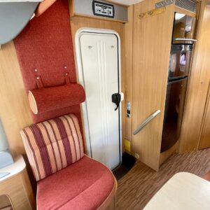 Auton etuosassa on viihtyisä L- pöytäryhmä lyhyellä sivusohvalla. Kääntyvien etuistuinten ansiosta pöydän ympärille mahtuu kivasti kuusikin henkilöä menneitä muistelemaan.