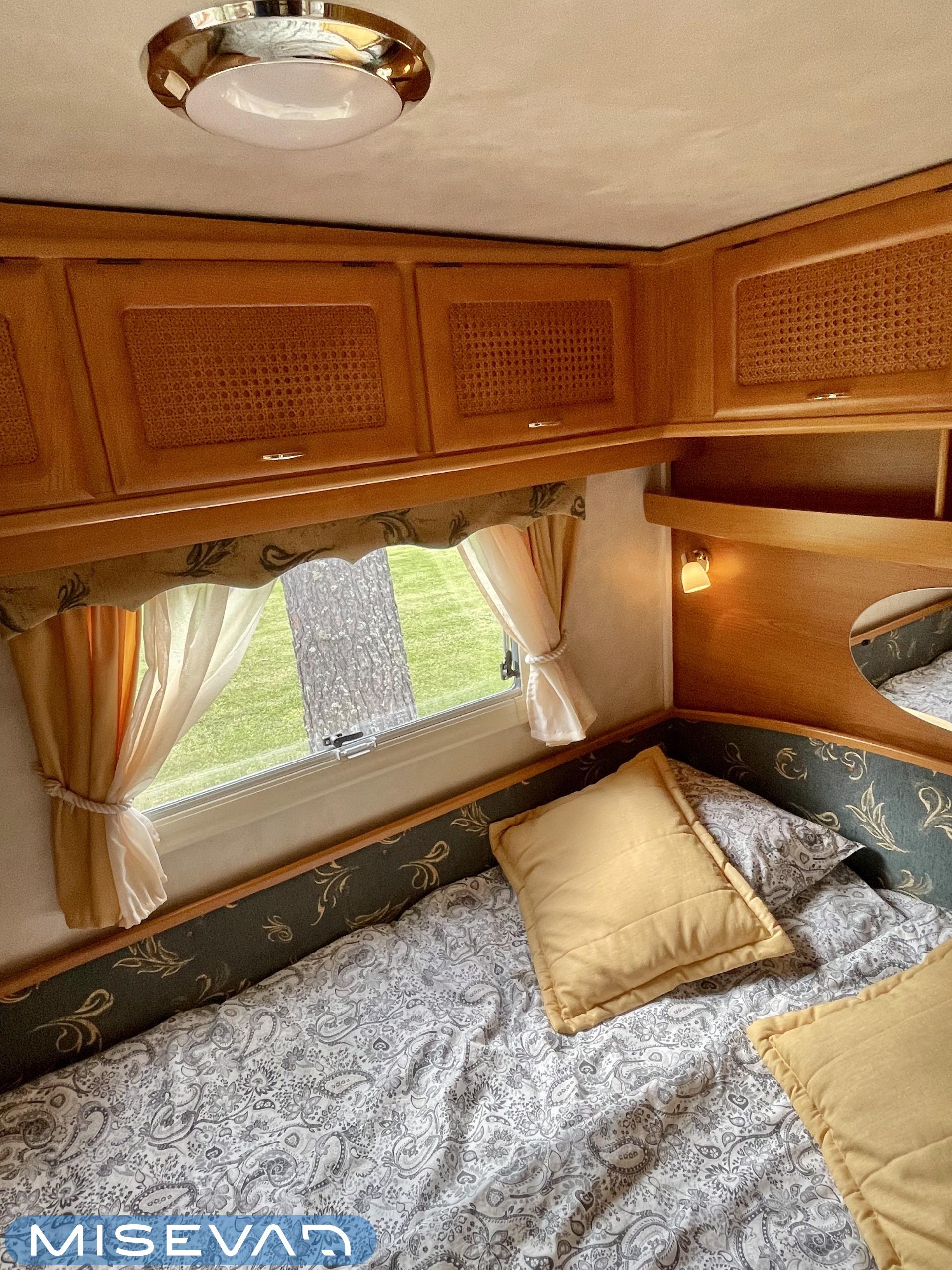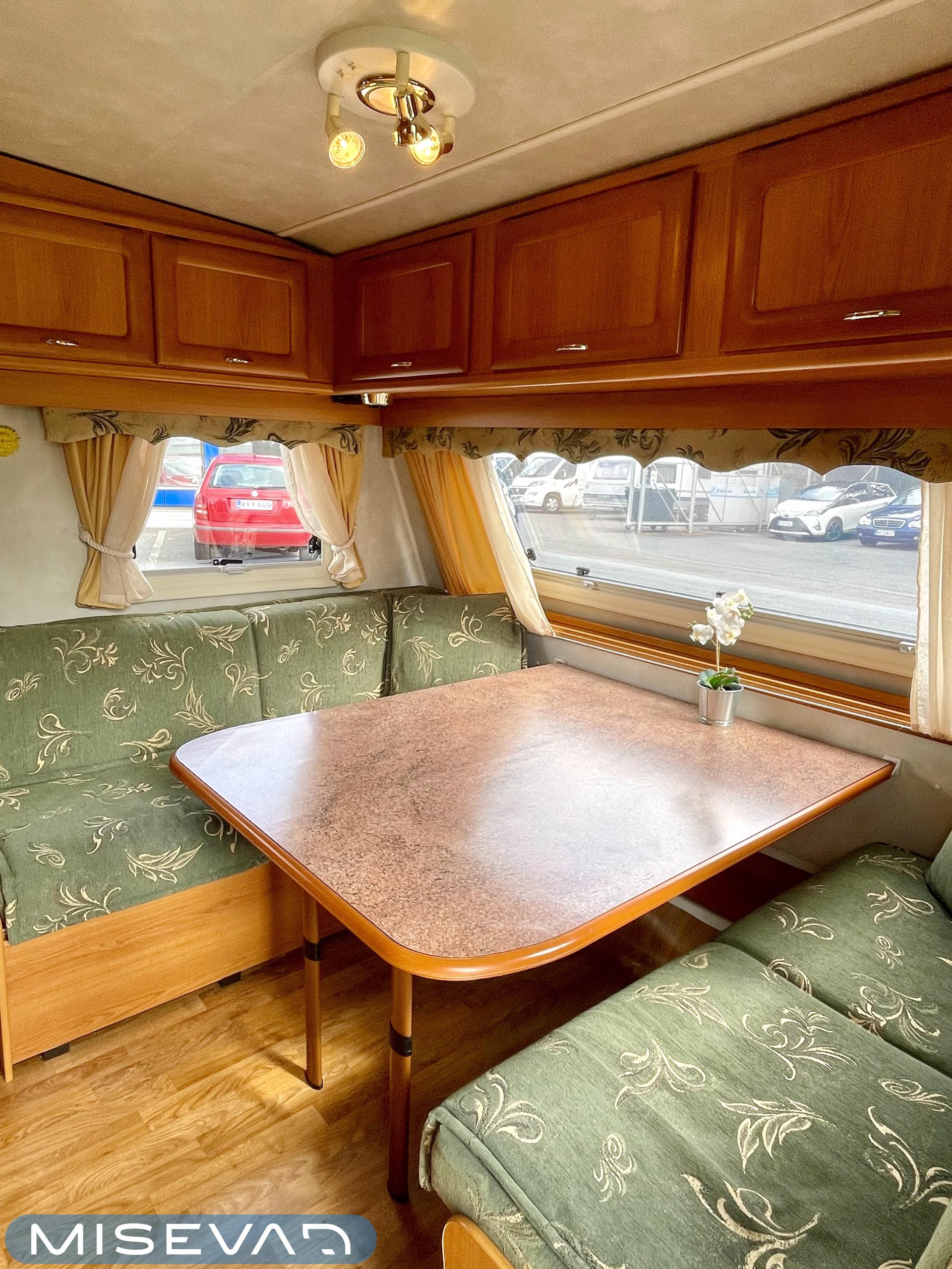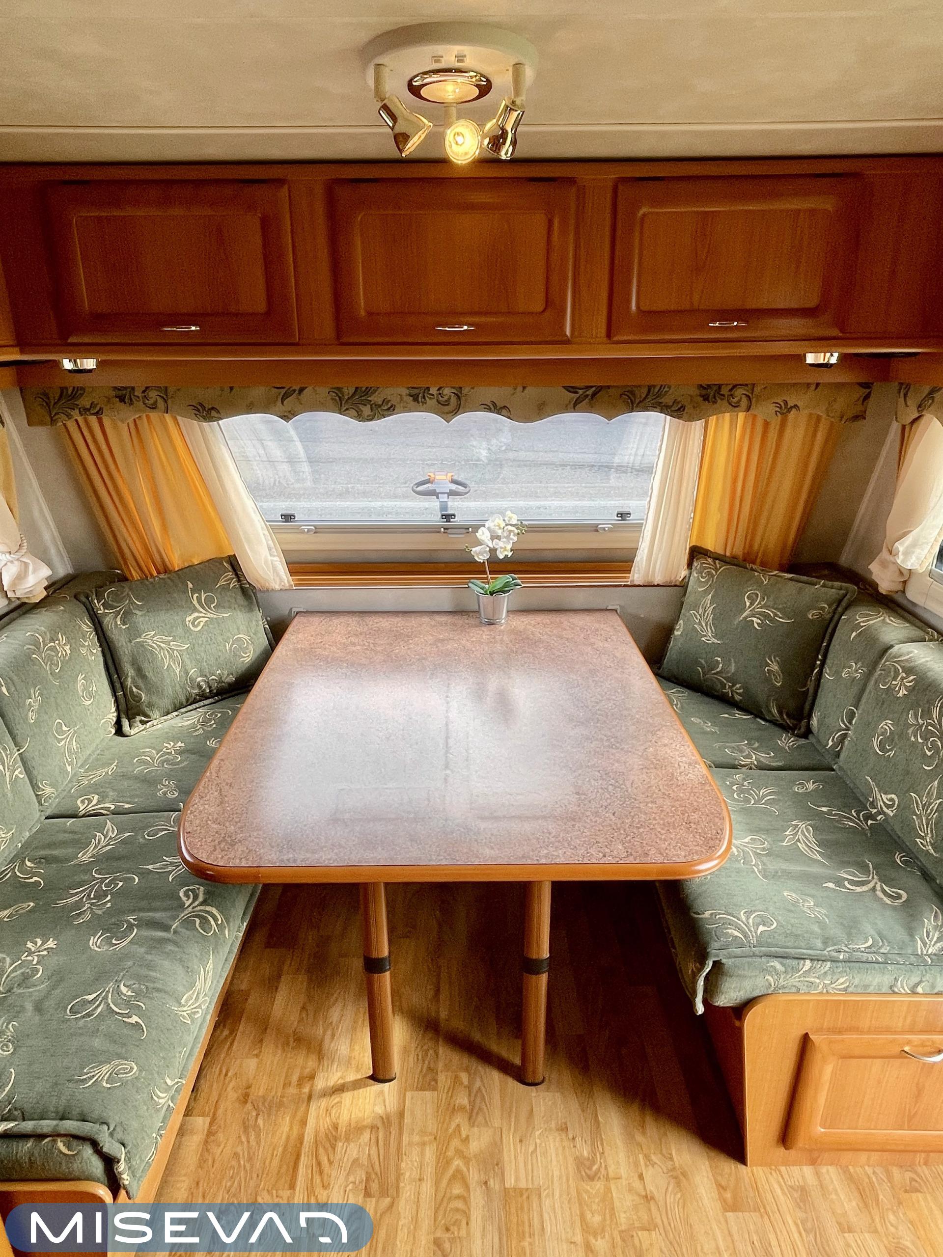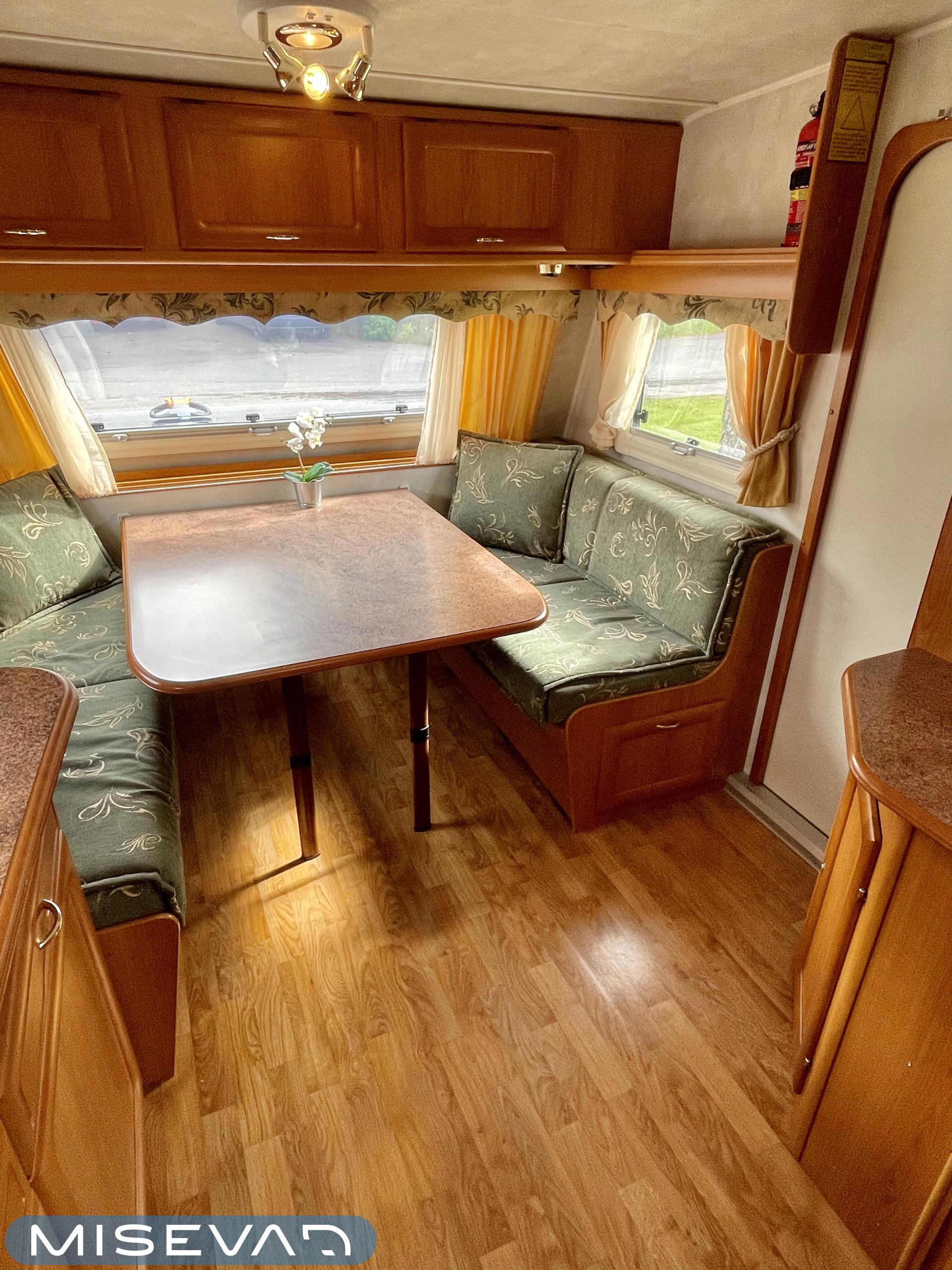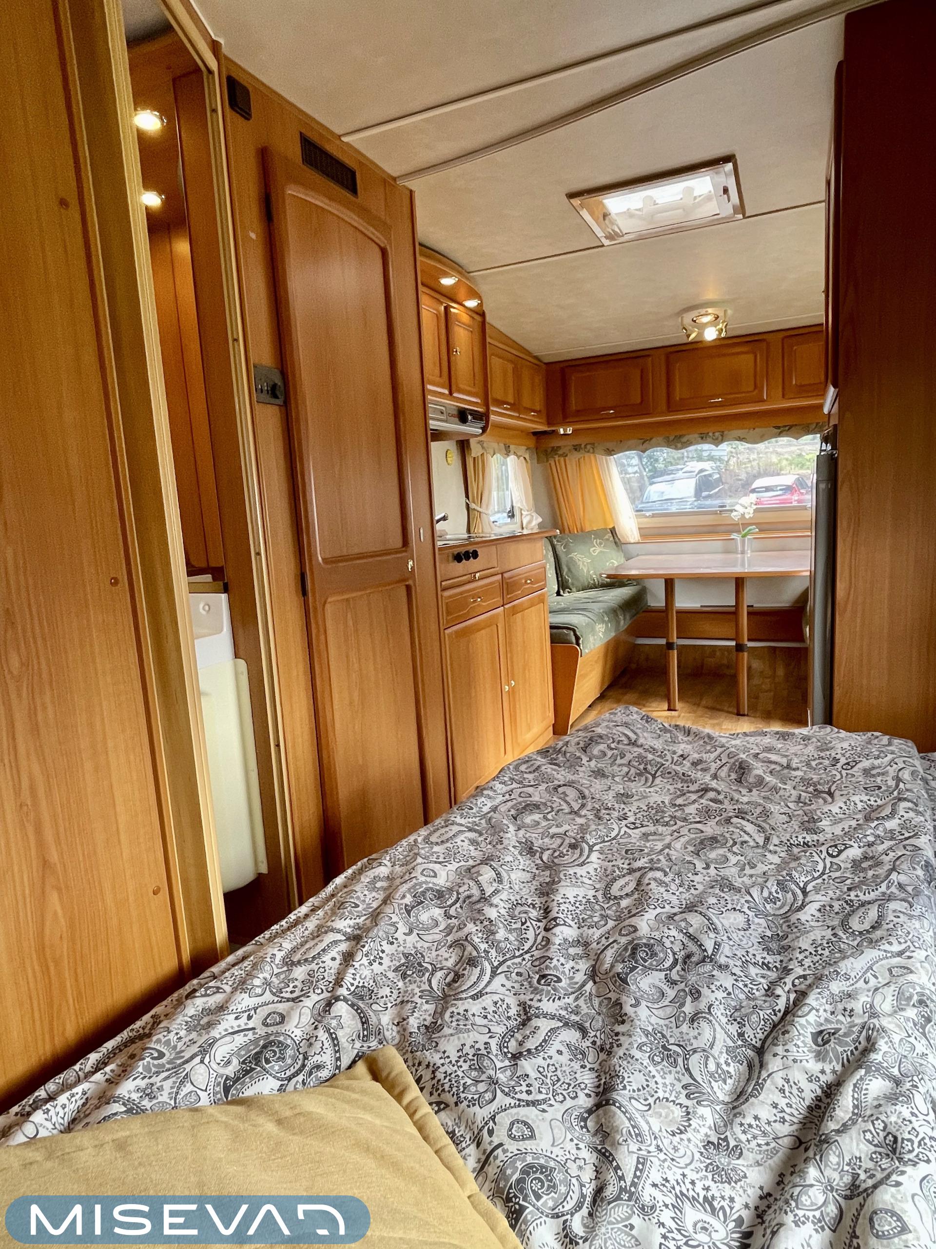 Tästä vaunusta on pidetty huolta. Ajan hammas ei ole päässyt nakertamaan sisäpuolta juuri ollenkaan. Ihan kuin aika olisi pysähtynyt vaunun sisällä, sen verran hienossa kunnossa kokonaisuus on. Iso pöytä hallitsee vaunun etuosaa ruokailuryhmän muodossa. Ja tarvittaessa se muuntuu tietysti sängyksi. Toinen petipaikka löytyy vaunun takaosasta ja majoittaa helposti kaksi sikeä unista. Takana on myös reilun kokoinen wc-tila suihkulla. Keittiö löytyy vaunun keskiosasta ja kokin selän takana jääkaappi pakastinlokerolla. Keittiön vieressä on vaatekaappi ja vaunussa säilytystilaa kaapistojen muodossa ympäri vaunua. Säilytystilaa löytyy myös sängyn alta. Vaunu lämpiää nestekirtoisella Aldella. Tämä pitää nähdä omin silmin, tule Misevalle tutustumaan.