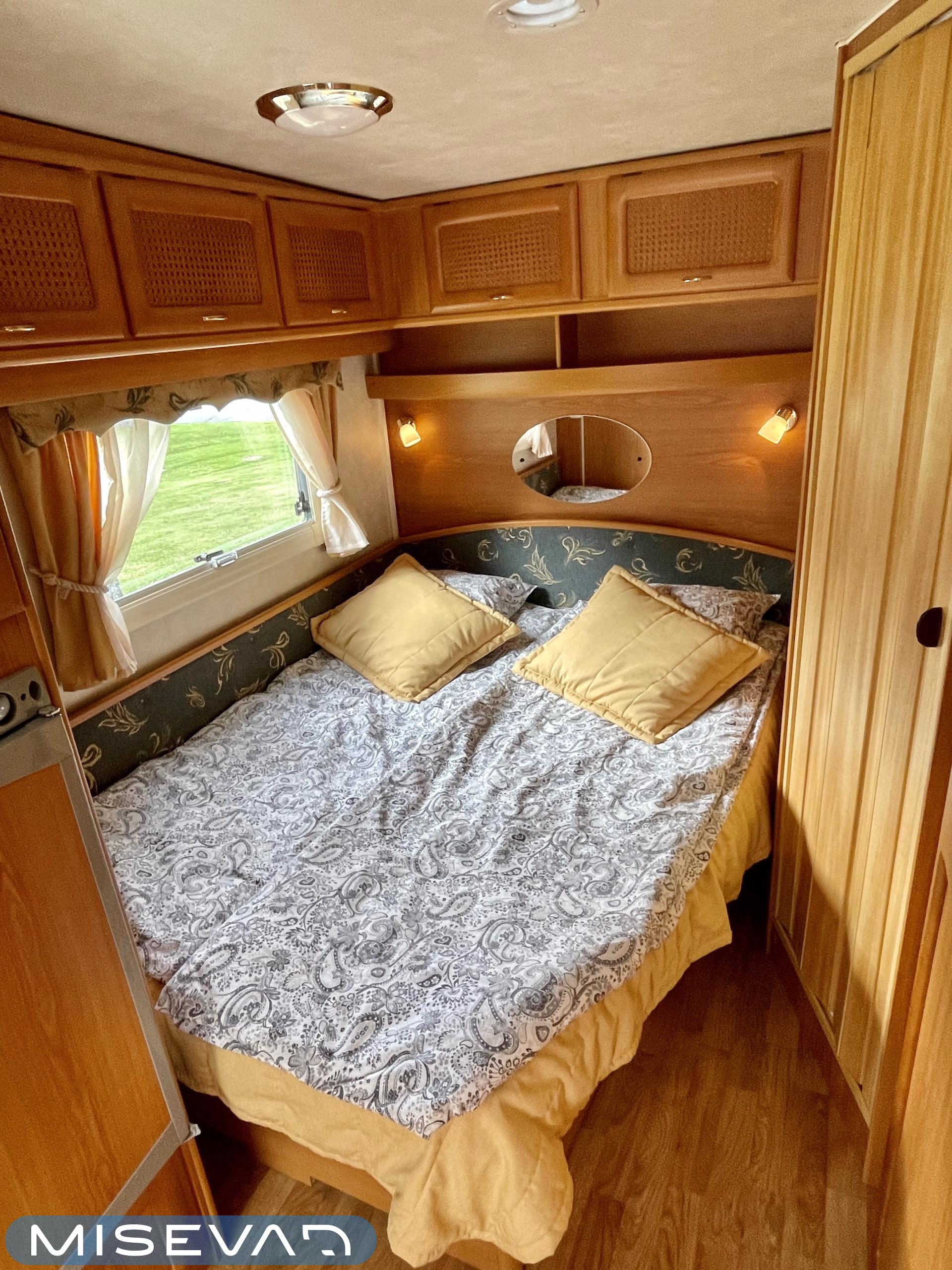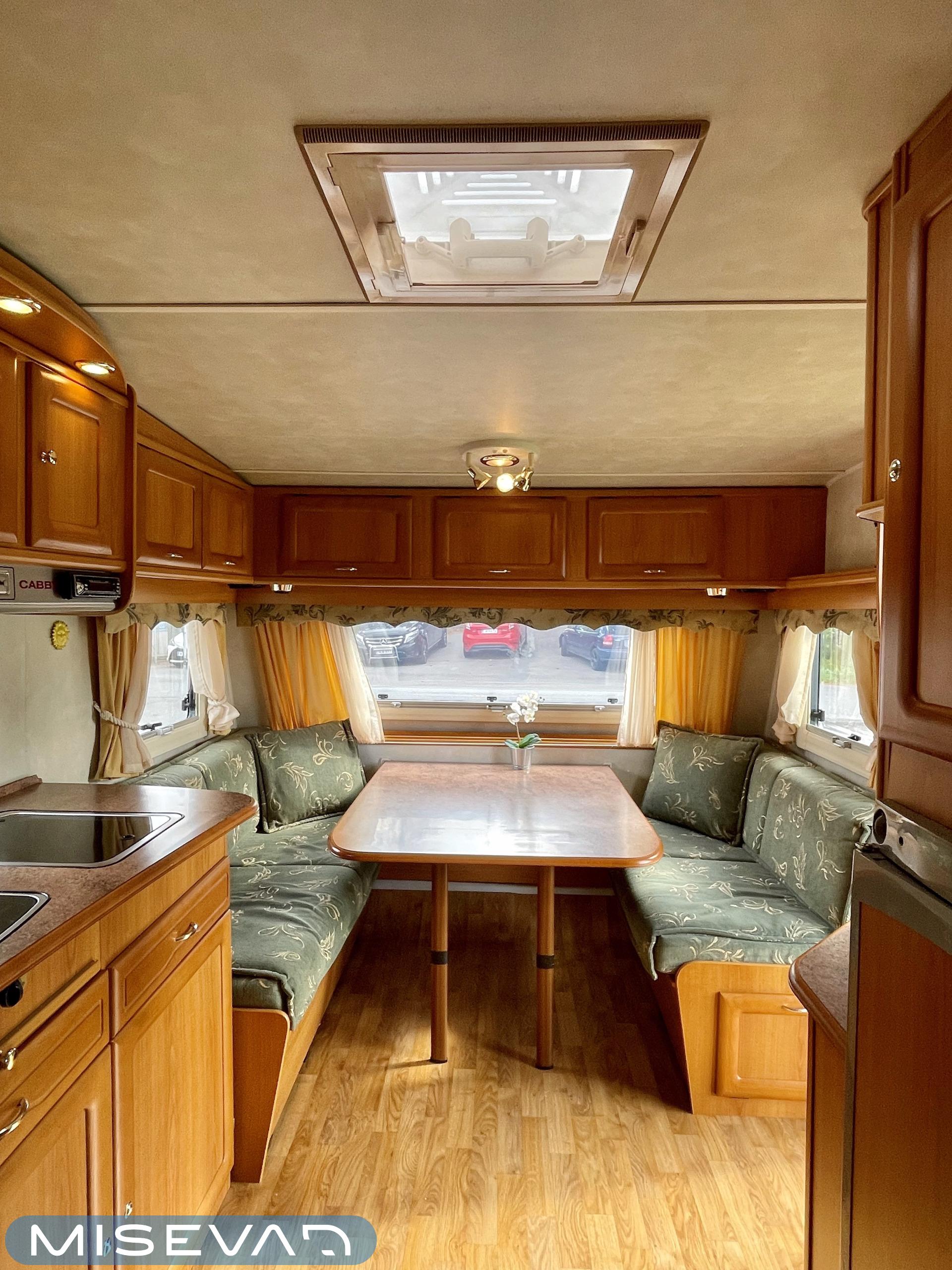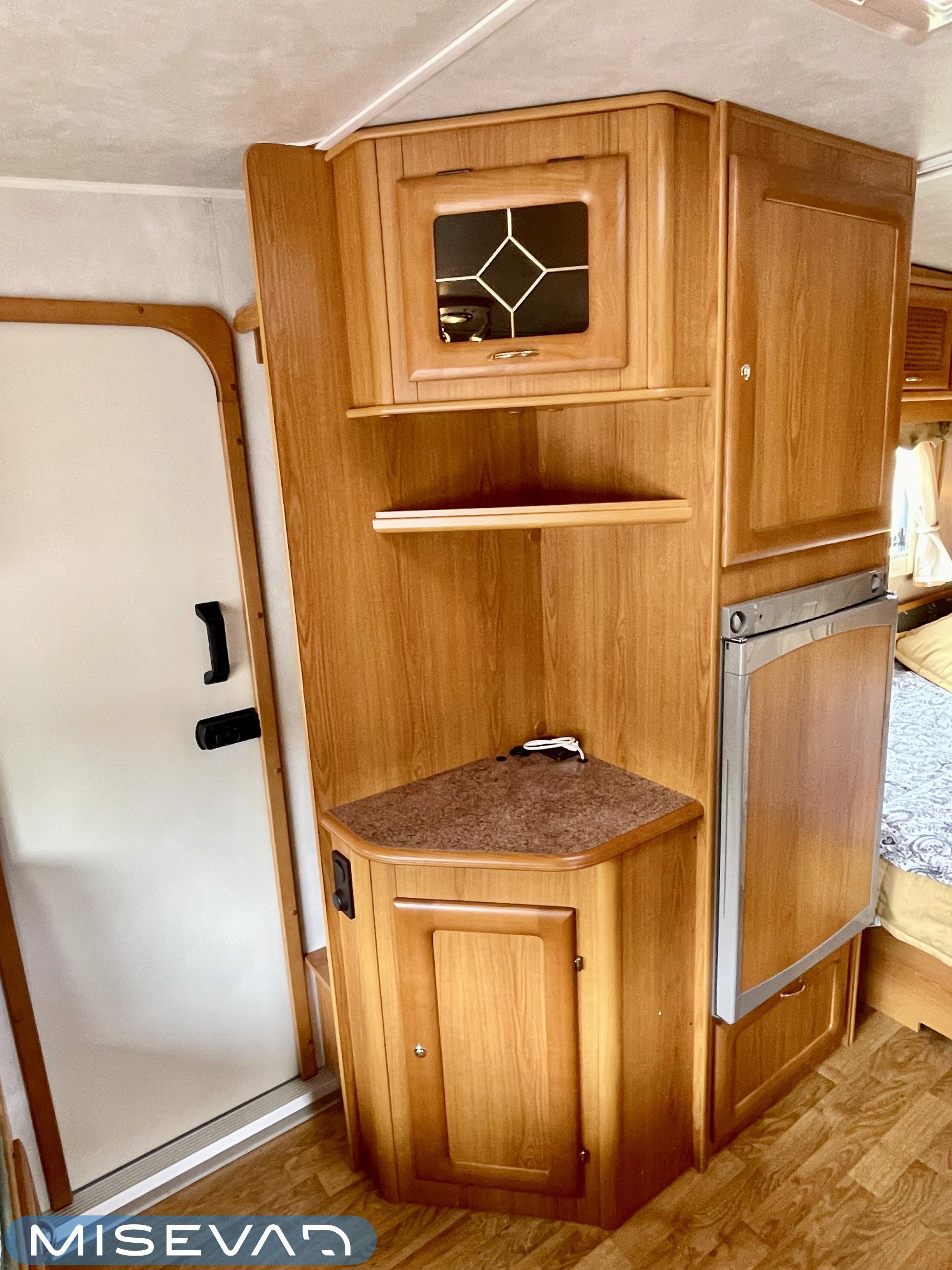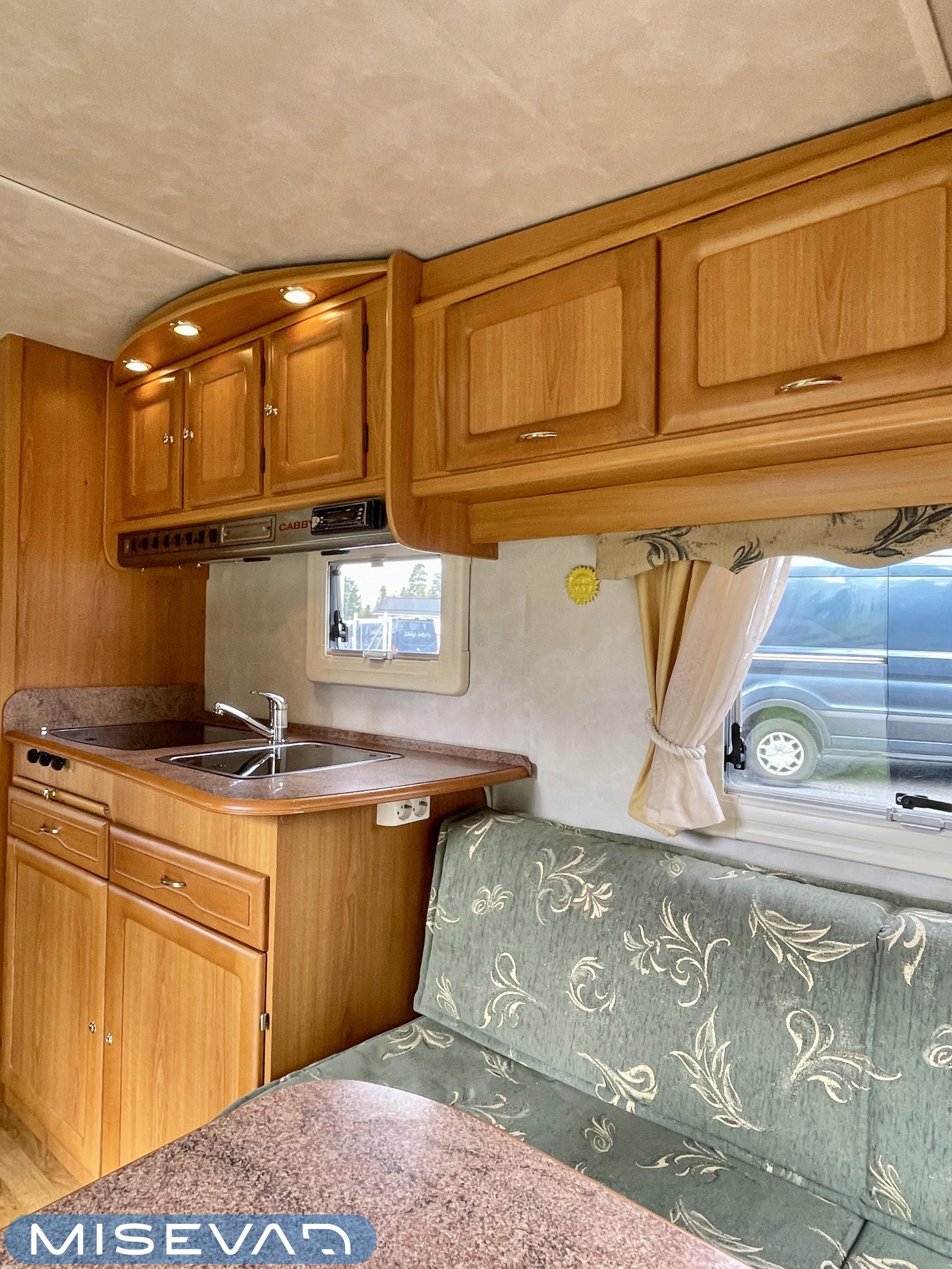 Tästä vaunusta on pidetty huolta. Ajan hammas ei ole päässyt nakertamaan sisäpuolta juuri ollenkaan. Ihan kuin aika olisi pysähtynyt vaunun sisällä, sen verran hienossa kunnossa kokonaisuus on. Iso pöytä hallitsee vaunun etuosaa ruokailuryhmän muodossa. Ja tarvittaessa se muuntuu tietysti sängyksi. Toinen petipaikka löytyy vaunun takaosasta ja majoittaa helposti kaksi sikeä unista. Takana on myös reilun kokoinen wc-tila suihkulla. Keittiö löytyy vaunun keskiosasta ja kokin selän takana jääkaappi pakastinlokerolla. Keittiön vieressä on vaatekaappi ja vaunussa säilytystilaa kaapistojen muodossa ympäri vaunua. Säilytystilaa löytyy myös sängyn alta. Vaunu lämpiää nestekirtoisella Aldella. Tämä pitää nähdä omin silmin, tule Misevalle tutustumaan.