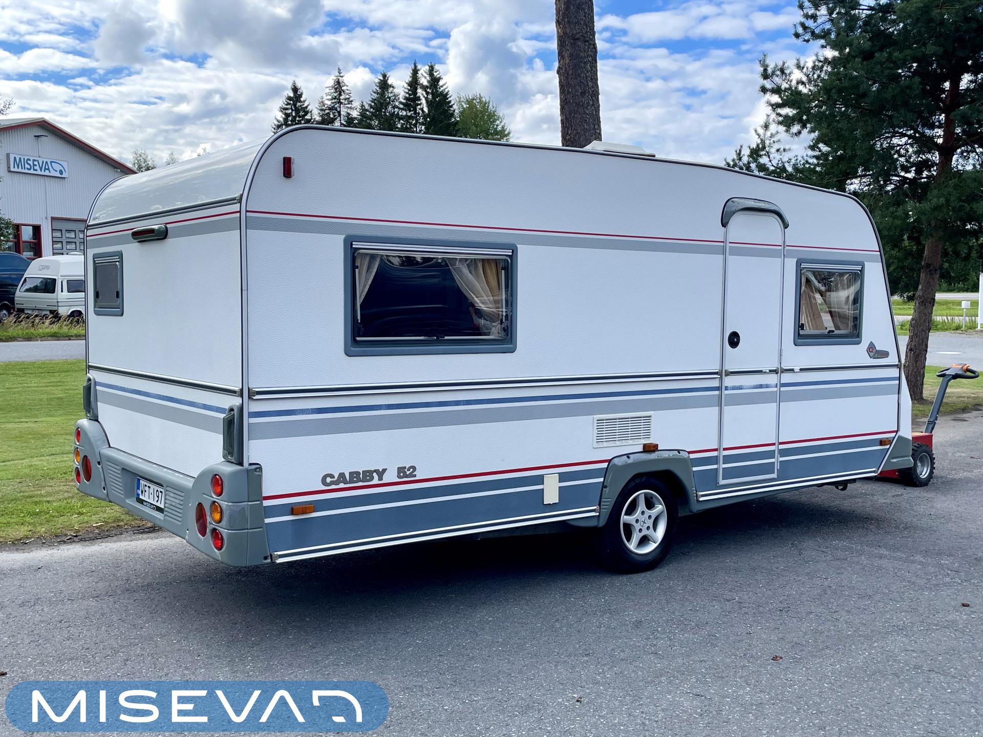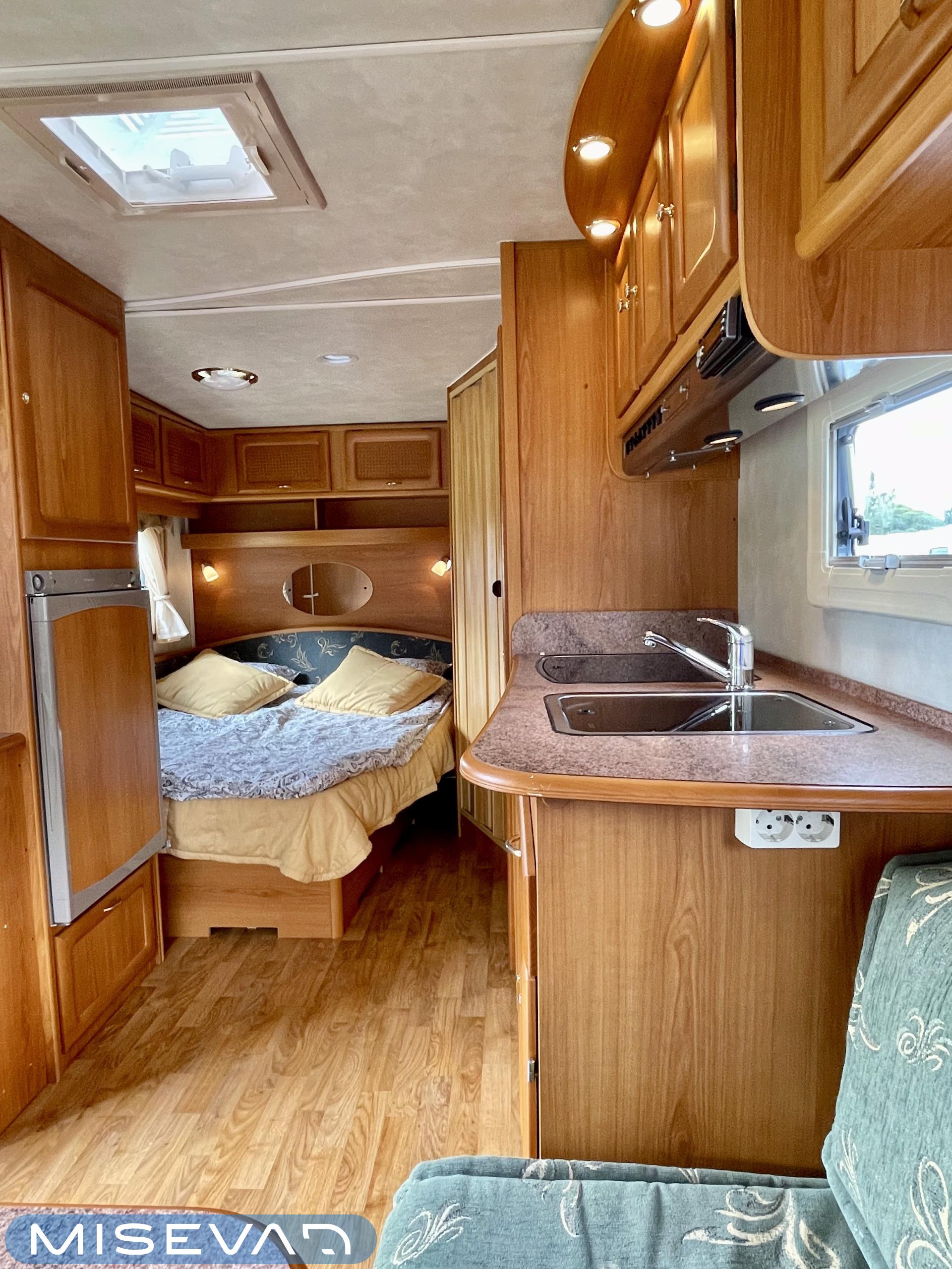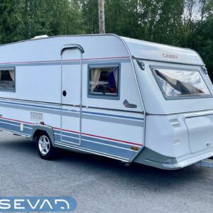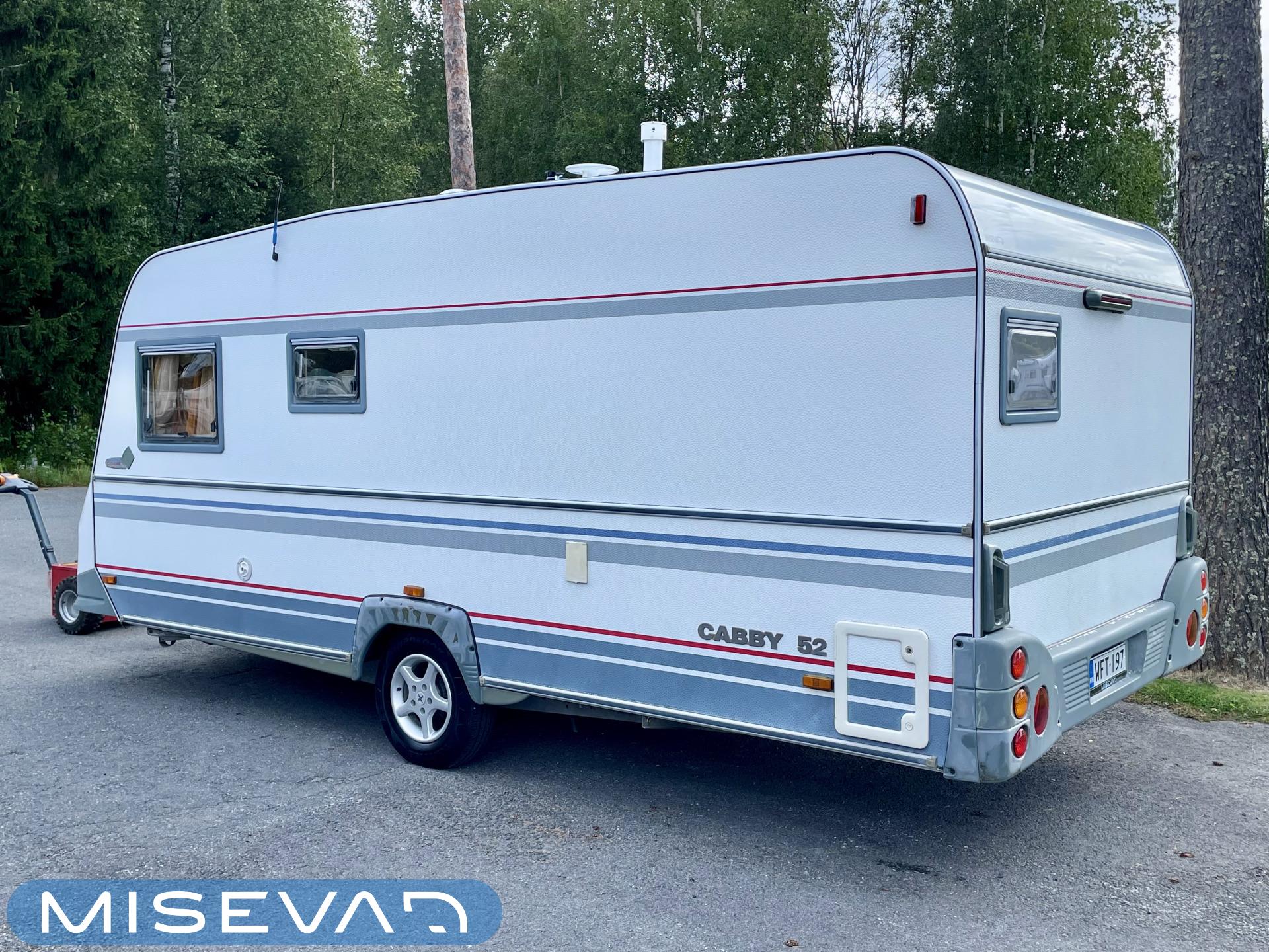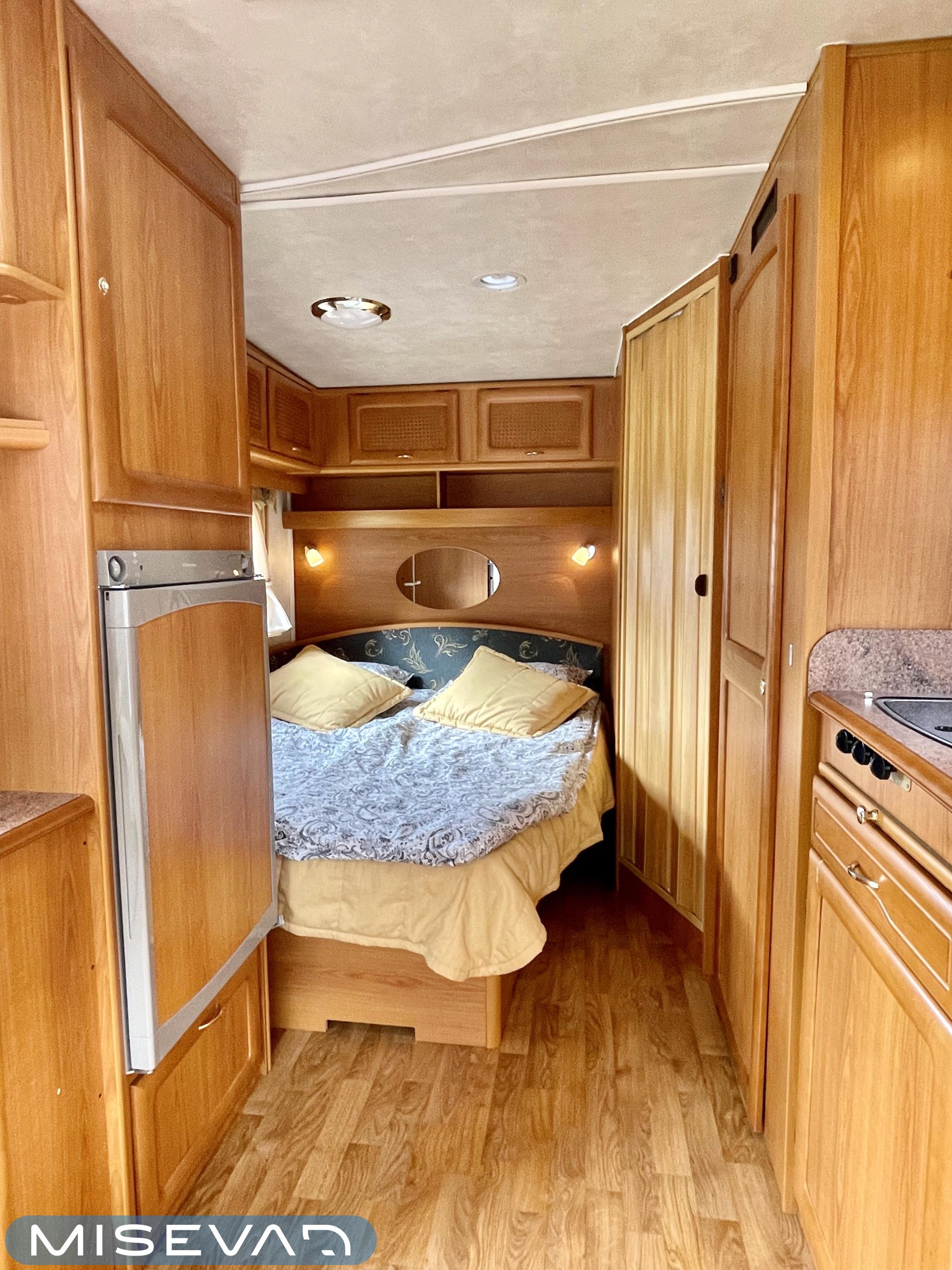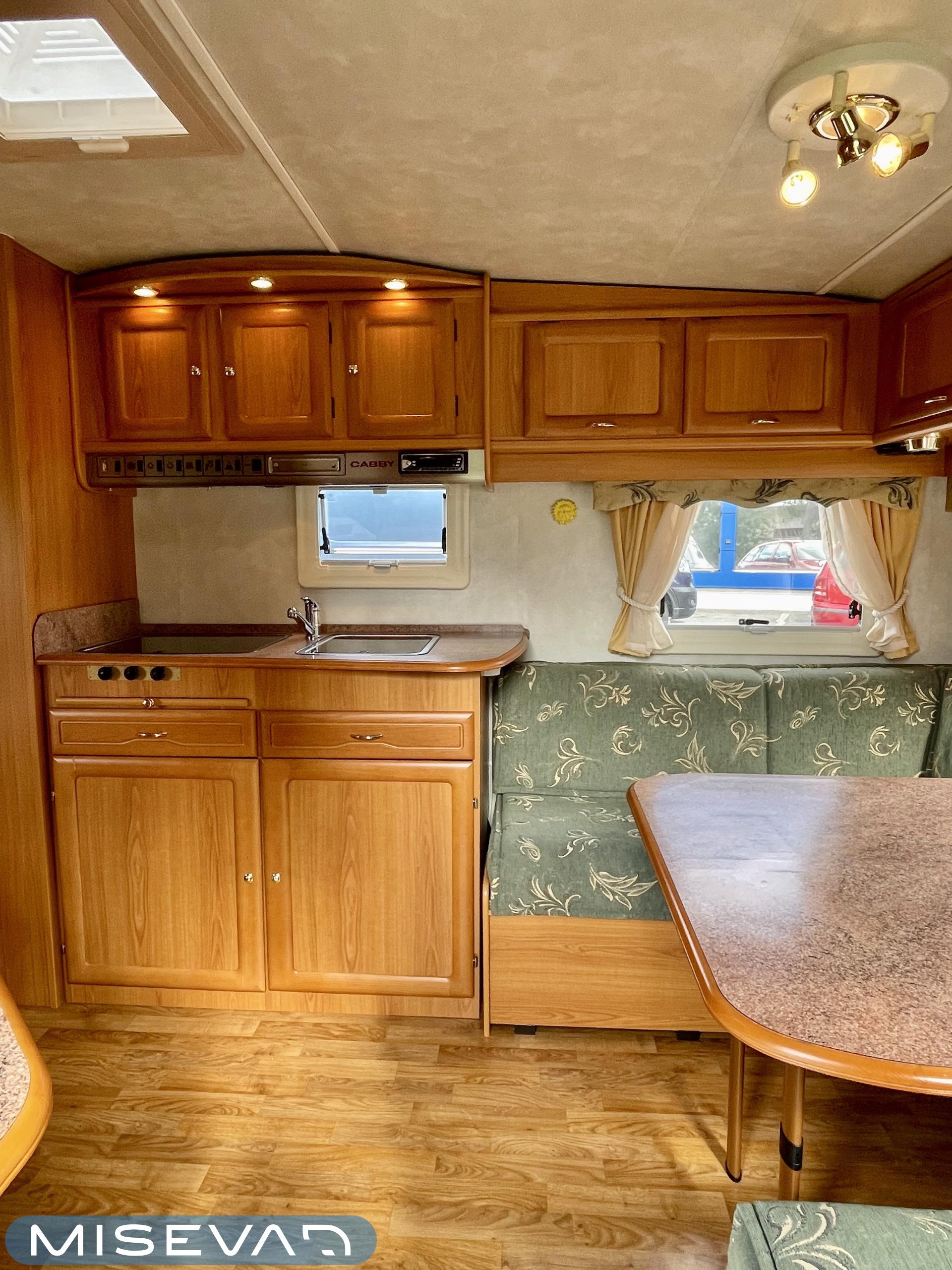 Tästä vaunusta on pidetty huolta. Ajan hammas ei ole päässyt nakertamaan sisäpuolta juuri ollenkaan. Ihan kuin aika olisi pysähtynyt vaunun sisällä, sen verran hienossa kunnossa kokonaisuus on. Iso pöytä hallitsee vaunun etuosaa ruokailuryhmän muodossa. Ja tarvittaessa se muuntuu tietysti sängyksi. Toinen petipaikka löytyy vaunun takaosasta ja majoittaa helposti kaksi sikeä unista. Takana on myös reilun kokoinen wc-tila suihkulla. Keittiö löytyy vaunun keskiosasta ja kokin selän takana jääkaappi pakastinlokerolla. Keittiön vieressä on vaatekaappi ja vaunussa säilytystilaa kaapistojen muodossa ympäri vaunua. Säilytystilaa löytyy myös sängyn alta. Vaunu lämpiää nestekirtoisella Aldella. Tämä pitää nähdä omin silmin, tule Misevalle tutustumaan.