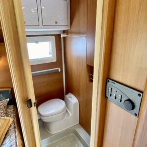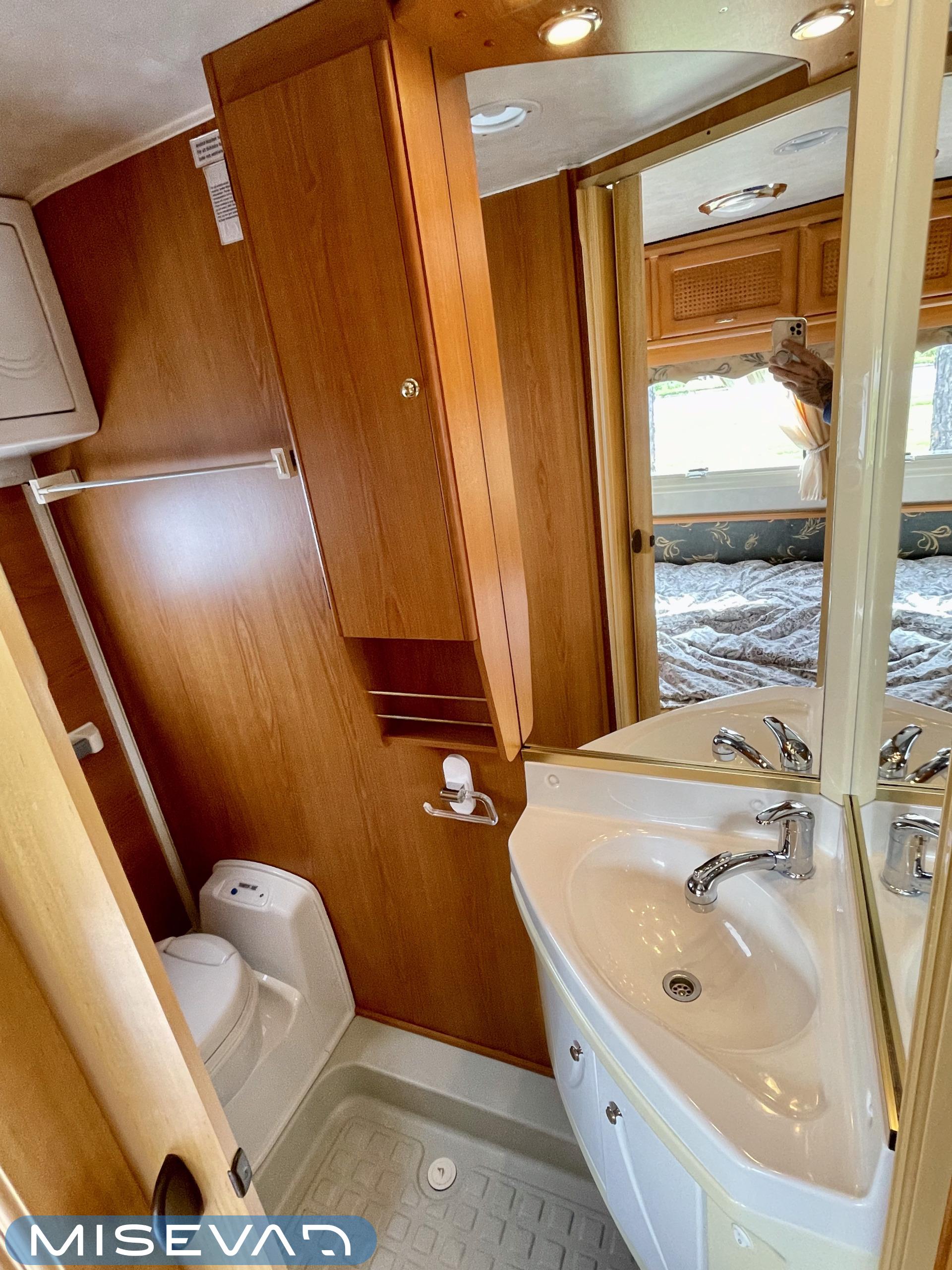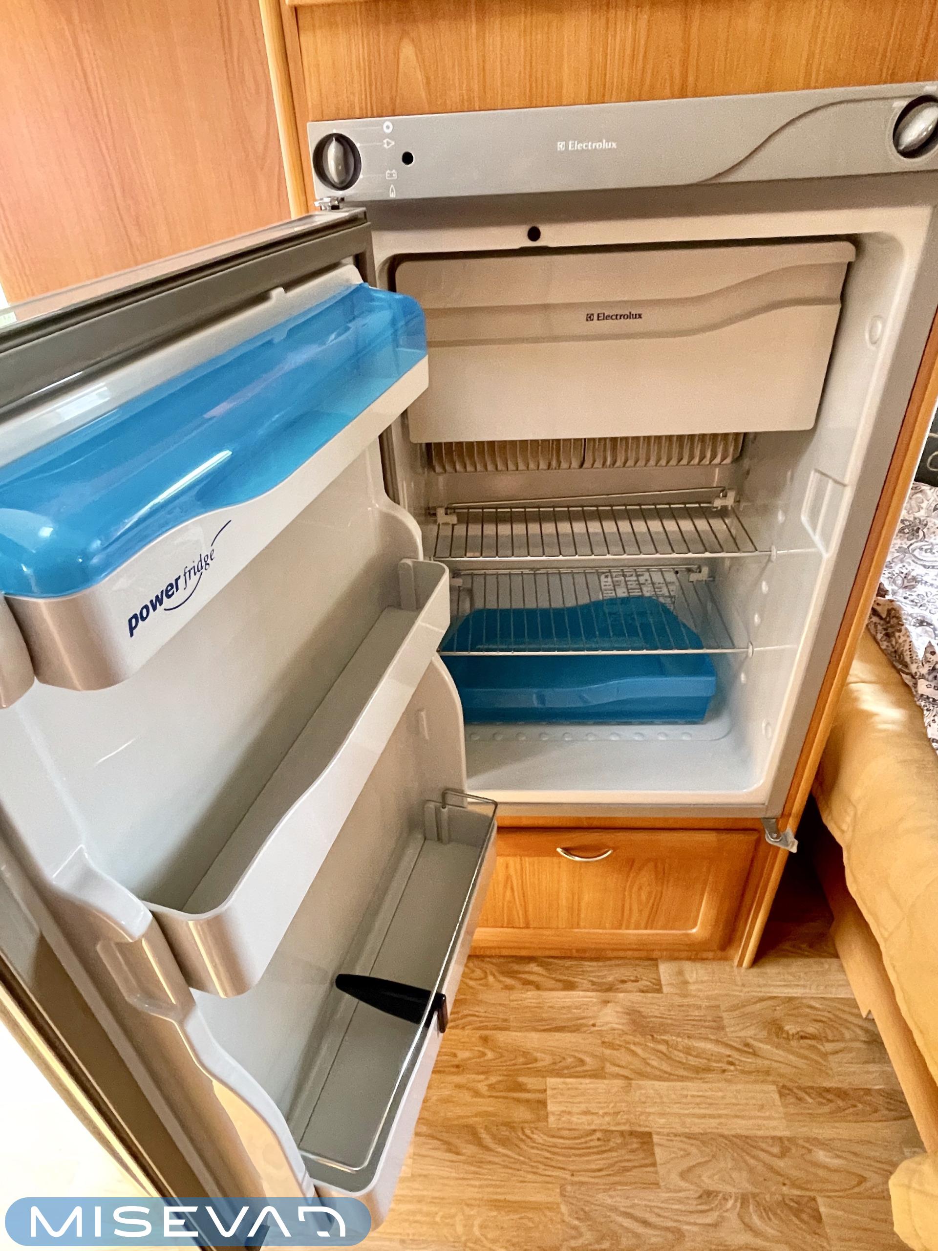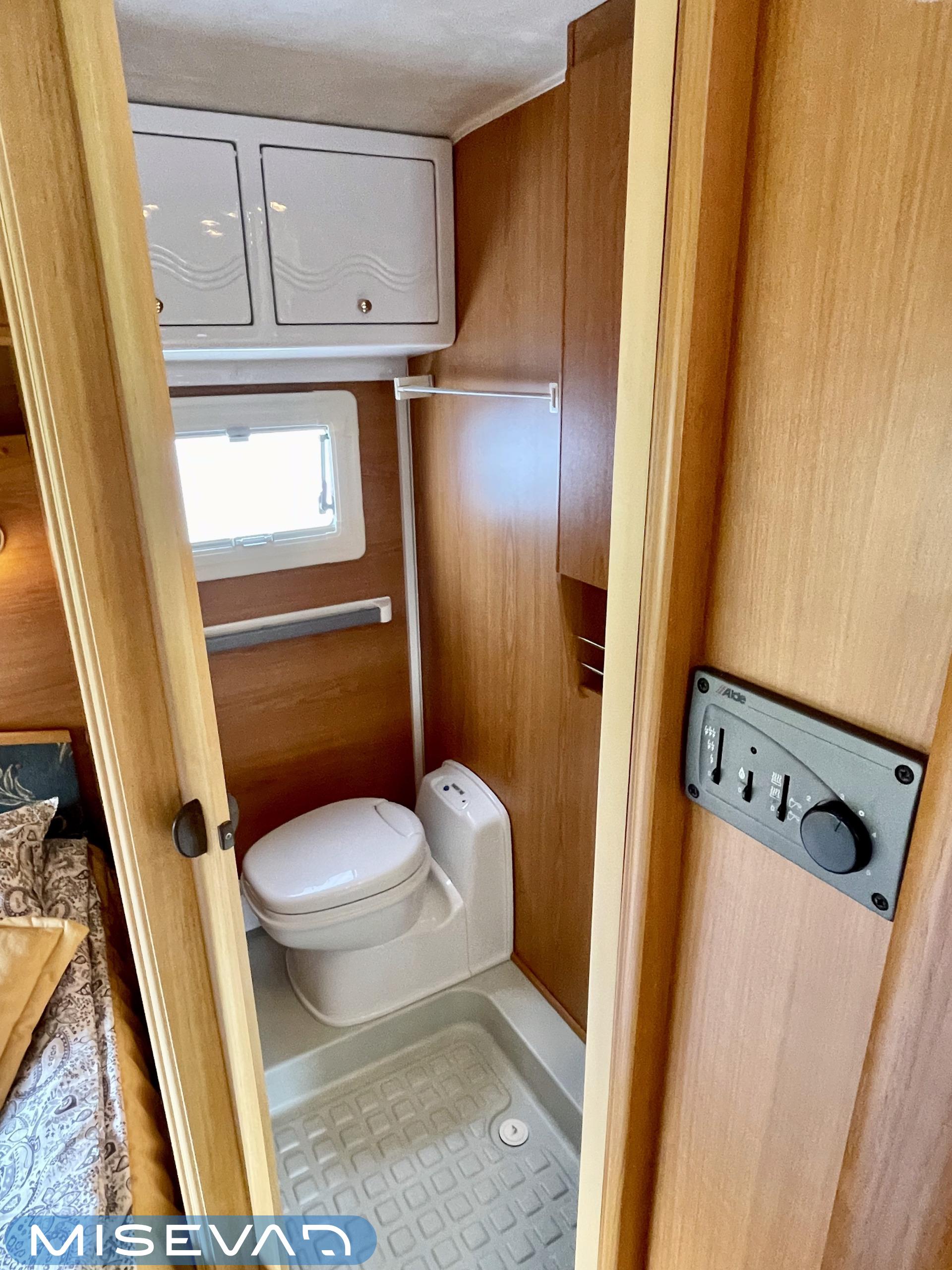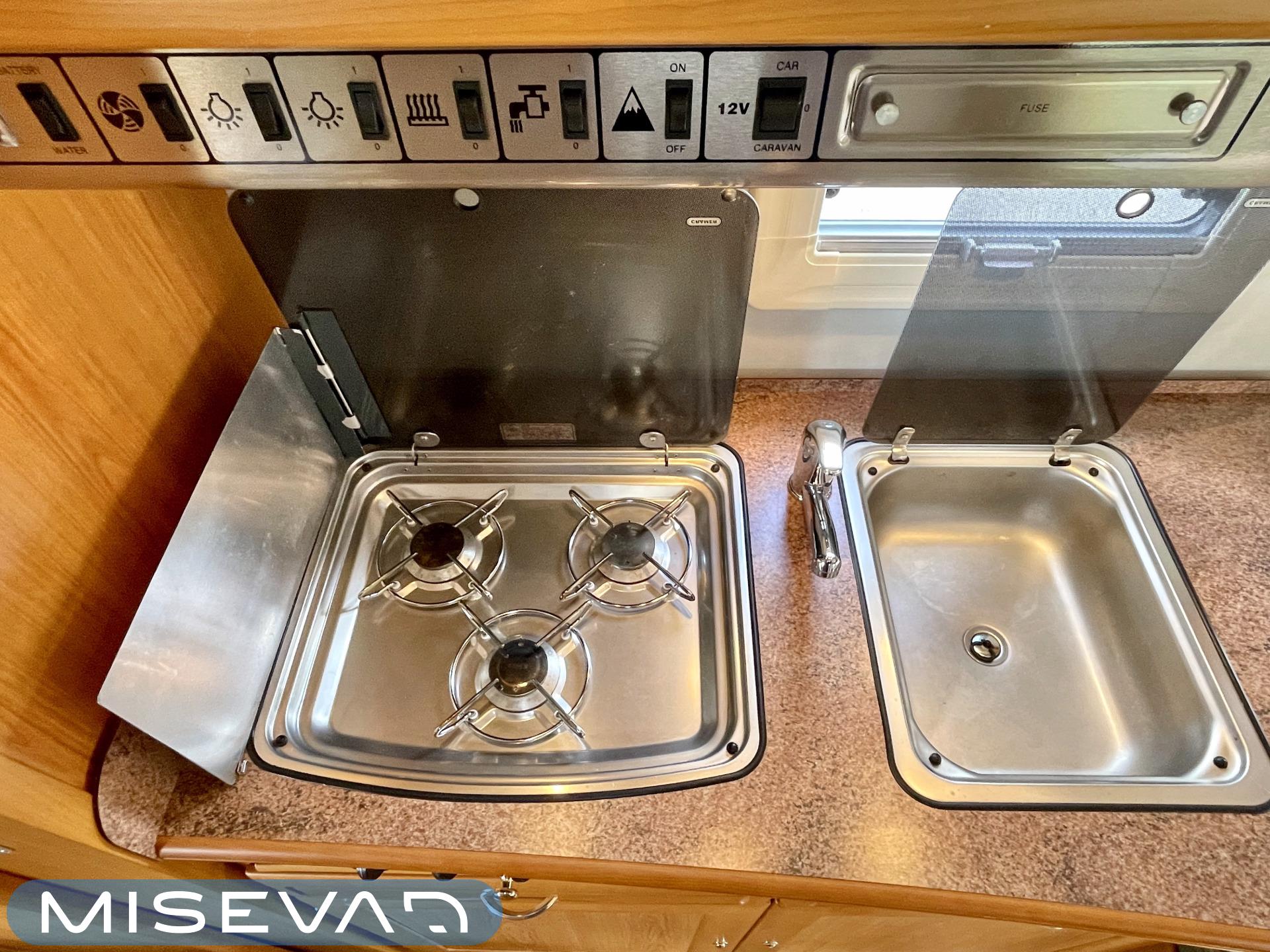Tästä vaunusta on pidetty huolta. Ajan hammas ei ole päässyt nakertamaan sisäpuolta juuri ollenkaan. Ihan kuin aika olisi pysähtynyt vaunun sisällä, sen verran hienossa kunnossa kokonaisuus on. Iso pöytä hallitsee vaunun etuosaa ruokailuryhmän muodossa. Ja tarvittaessa se muuntuu tietysti sängyksi. Toinen petipaikka löytyy vaunun takaosasta ja majoittaa helposti kaksi sikeä unista. Takana on myös reilun kokoinen wc-tila suihkulla. Keittiö löytyy vaunun keskiosasta ja kokin selän takana jääkaappi pakastinlokerolla. Keittiön vieressä on vaatekaappi ja vaunussa säilytystilaa kaapistojen muodossa ympäri vaunua. Säilytystilaa löytyy myös sängyn alta. Vaunu lämpiää nestekirtoisella Aldella. Tämä pitää nähdä omin silmin, tule Misevalle tutustumaan.