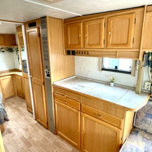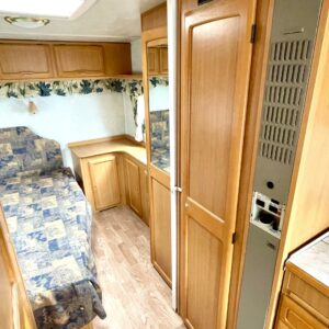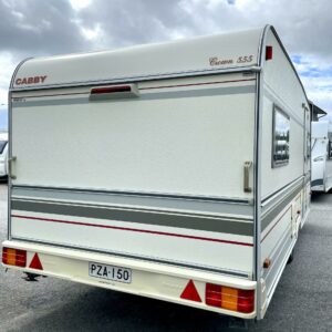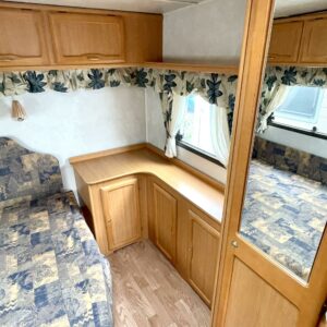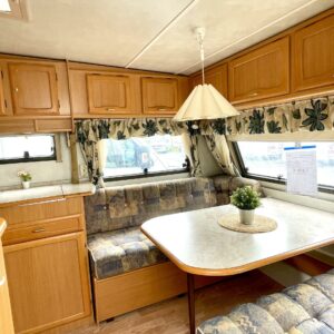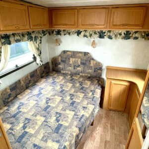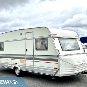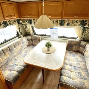 Siistikuntoinen matkavaunu Alde- nestekiertolämmityksellä edullisesti. Matala parivuode takana ja iso istuinryhmä edessä. Istuinryhmä sijattavissa isoksi parivuoteeksi.