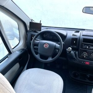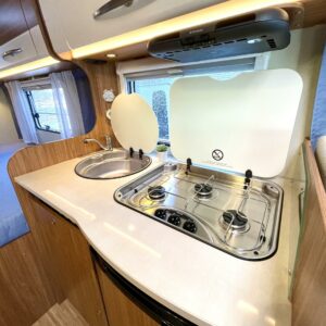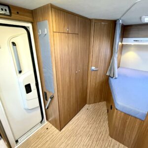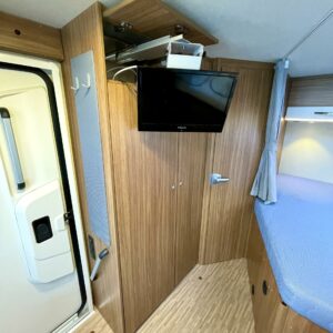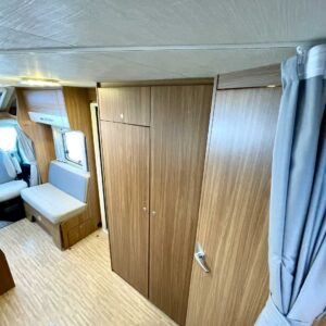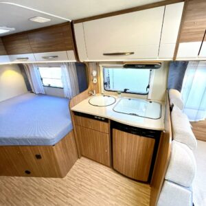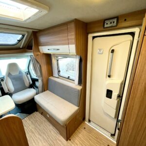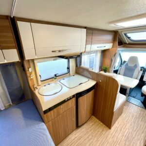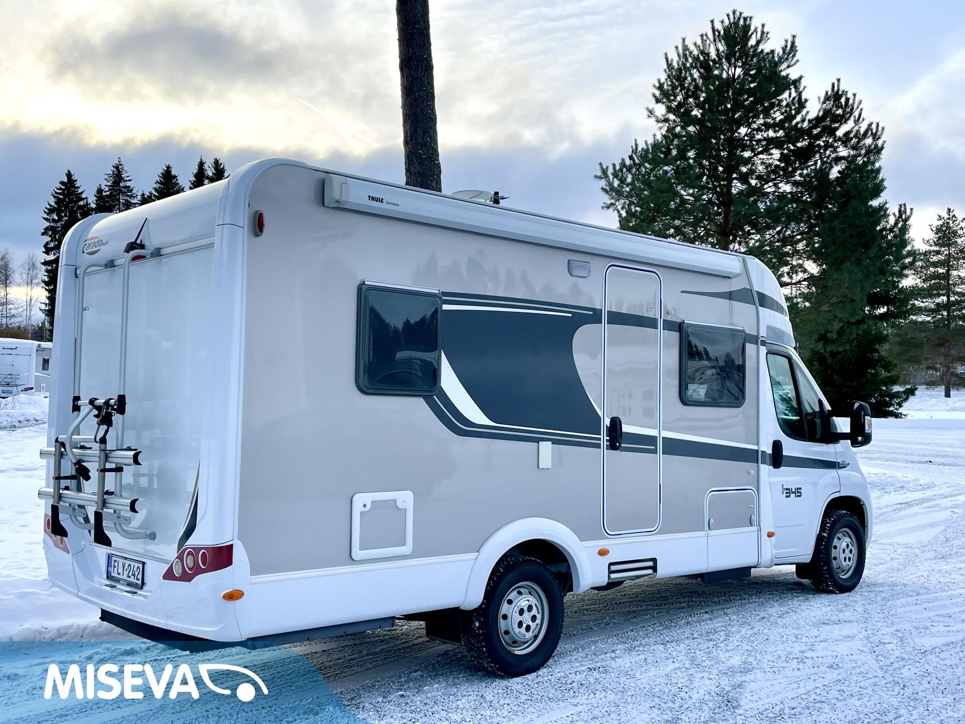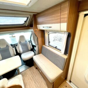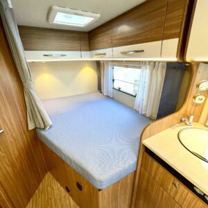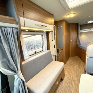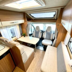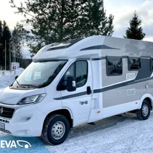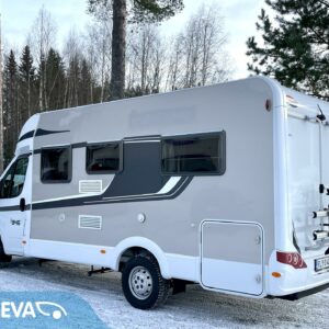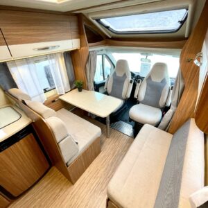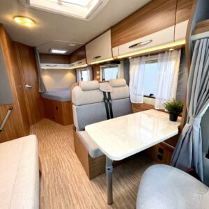 Auton etuosassa on viihtyisä pöytäryhmä sivusohvalla. Peräpäästä löytyy pitkittäinen parivuode ja pesuhuone/ WC.