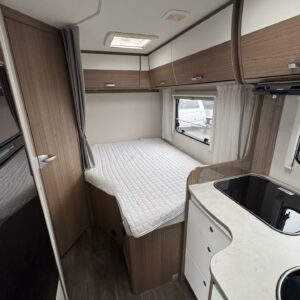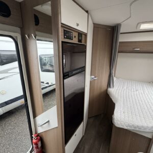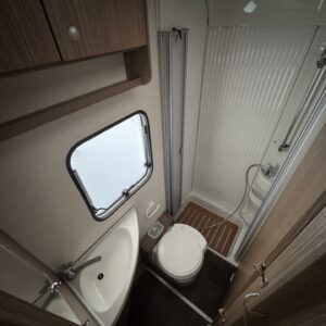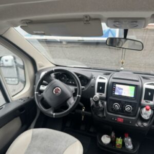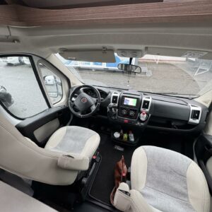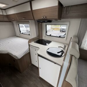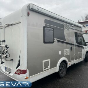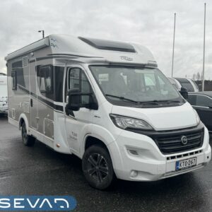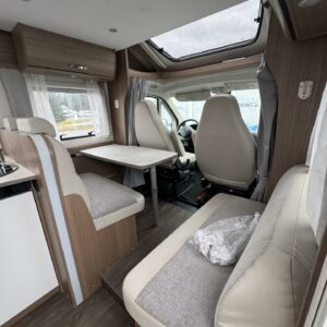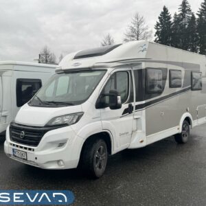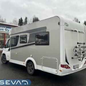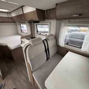 Siistikuntoinen ja avara matka-auto kahdella parivuoteella ja hyvillä varusteilla. Ranskalainen parivuode pitkittäin ja laskuvuode pöytäryhmän yllä.