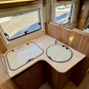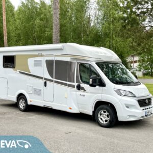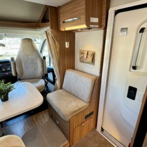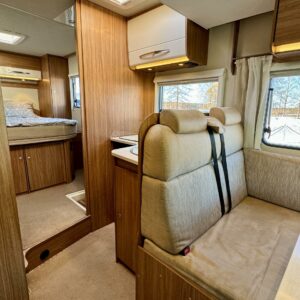 Haluttu saarekevuodemallin puoli-integroitu Carado laskuvuoteella. Eli neljälle matkustajalle kätevästi valmiit makuupaikat ilman stressavaa ”pöytäjumppaa”. Auton takaosaan on sijoitettu pitkittäissuuntaisesti saarekevuode ja sen alapuolelle jää runsaasti säilytystilaa takatallin muodossa. Talli on toimintojen kannalta ihanteellisesti läpilastattavaa mallia, eli ovet molemmilla sivuilla. Makuuhuoneen yhteydessä on WC/kylpyhuonetilat ja vasemmalta puolelta löytyy erillinen suihkutila. Keskiosaa hallitsee keittiö missä on iso jääkaappi erillisellä pakastinlokerolla. Auton etuosassa on pöytäryhmä minne yhdistyvät kääntyvät ohjaamon penkit, sekä sivusohva. Tähän mahtuu mukavasti isompikin ryhmä iltaa istumaan. Pöytäryhmän yläpuolella on alas laskettava vuode mistä saa kädenkäänteessä vuodepaikat kahdelle henkilölle. Ohjaamosta löytyy ilmastointi, sekä vakionopeuden säädin. Jos on tarve ottaa mukaan polkupyörät, niin ne matkustaa vaivattomasti omalla paikallaan takaseinälle sijoitetussa pyörätelineessä. Auton lämmitysjärjestelmänä on Trumaticin tehokkain (6kw) ilmakeskuslämmitys ja siinä lisäksi lämminvesiboileri. Kaikin puolin mallikas peli valmiina reissuun.
