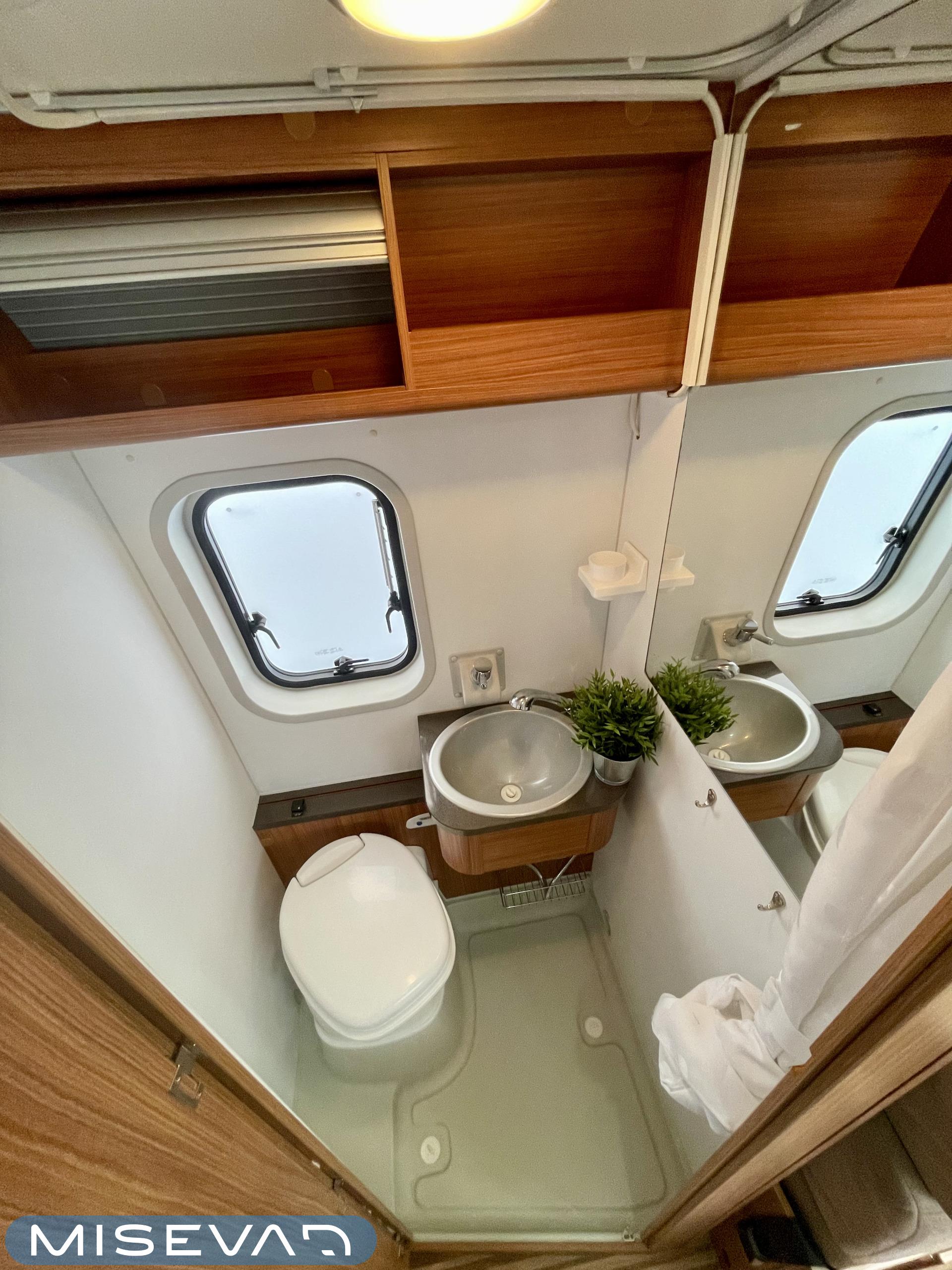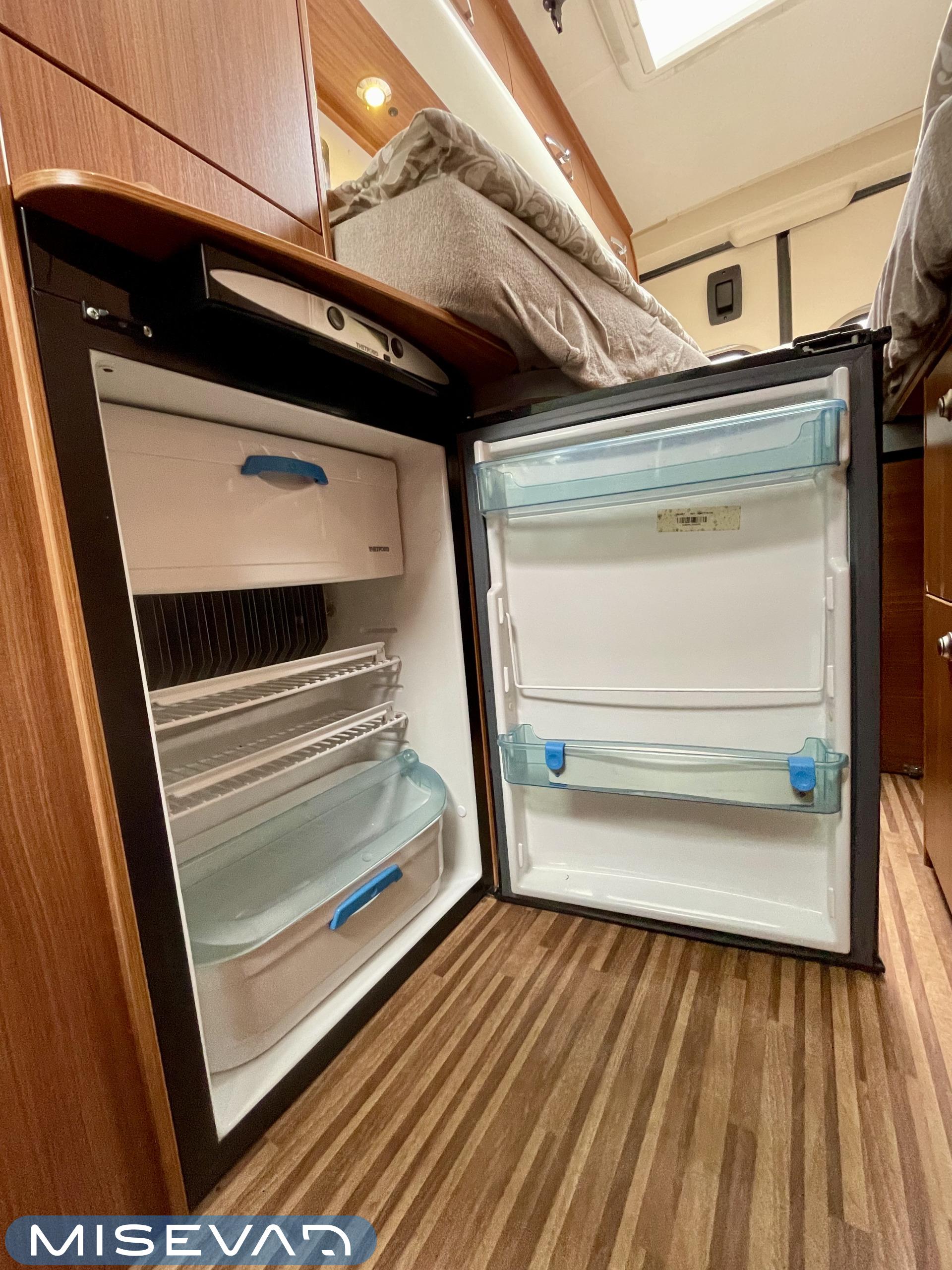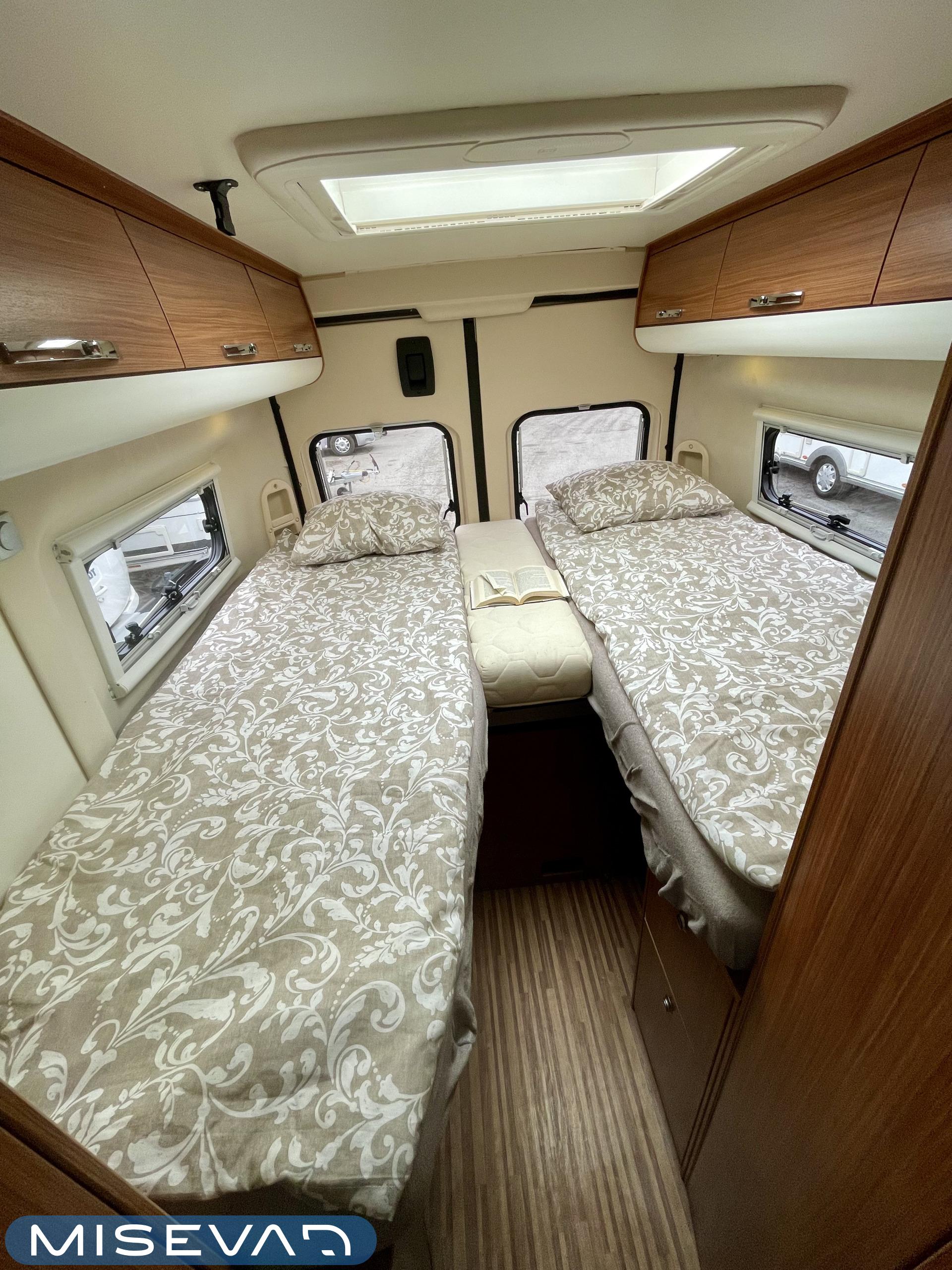 Sisätiloissa viihtyvyys on viety pitkälle. Kompressorijääkaappi pitää ruoat kylmänä, liesi mahdollistaa ruoanlaiton missä tahansa ja tilava ruokapöytä tekee oleskelusta mukavaa. Erillisvuoteet takaavat laadukkaat yöunet matkasi varrella.