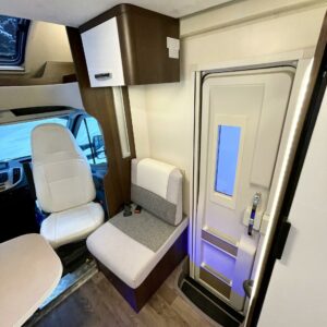 Etuosassa on avara sivusohvalla varustettu pöytäryhmä ja katosta sähköisesti laskeutuva nostovuode.