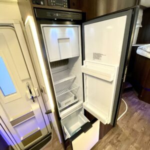 Auton keskellä olevan L-keittiön varustukseen kuuluu myös iso jääkaappi- pakastin.