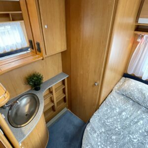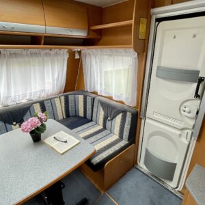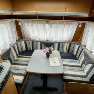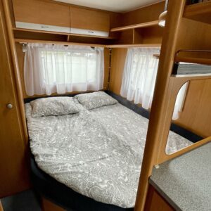 Vaunun takaosassa on pitkittäinen parivuode ja pesuhuone/ WC.