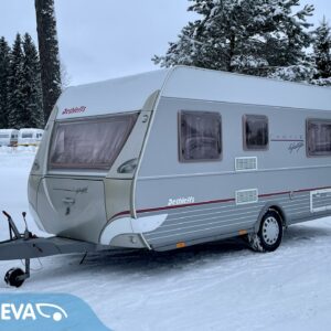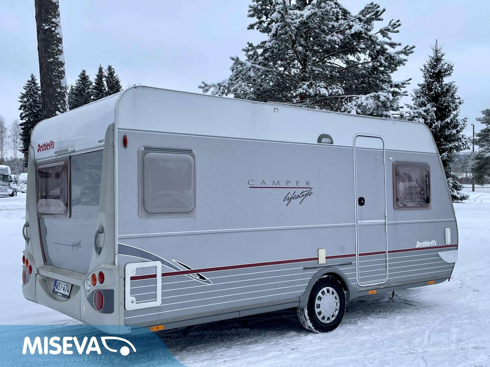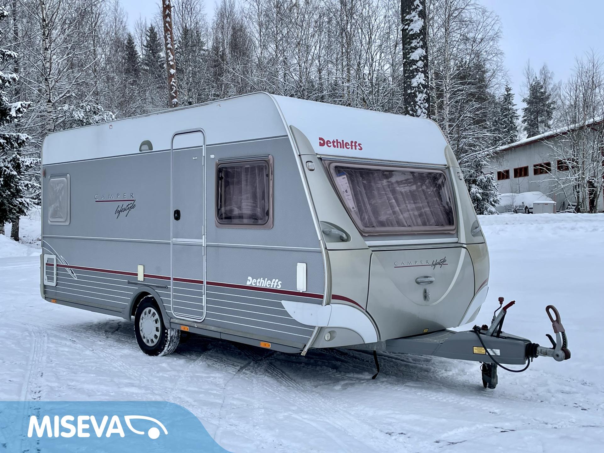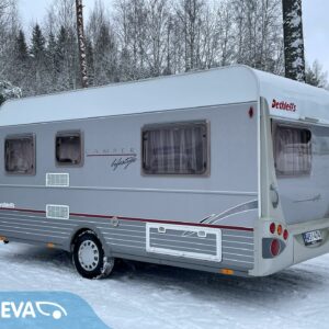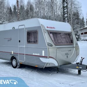 Näppäränkokoinen, kokonaispainoltaan vain 1 200- kiloinen Dethleffs nestekeskuslämmityksellä.