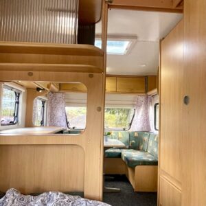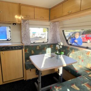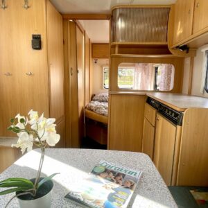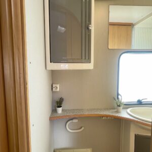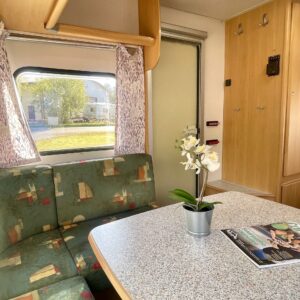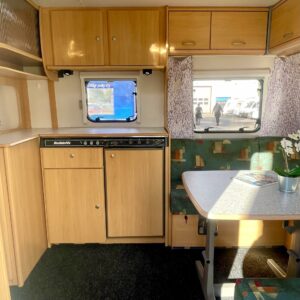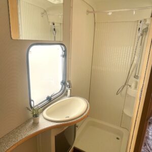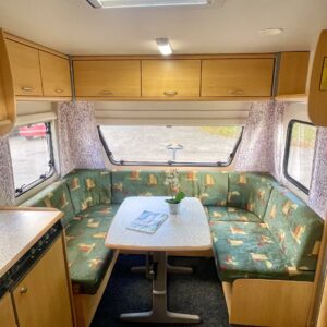 Näppäränkokoinen vaunu varustettuna tehokkaalla ja tasaisen lämmön tuottavalla Alden vesikeskuslämmityksellä. Lisäksi löytyy vielä erillisenä mukavuusvarusteena sähköinen lattianlämmitys. Avara keittötila normaalilla keittiövarustuksella. Edessä U-ryhmä mistä saa sijattua parivuoteen kahdelle henkilölle. Keskellä avara keittiötila. Takana pitkittäinen parivuode ja reilun kokoinen WC/kylpyhuonetila erillisellä suihkutilalla.