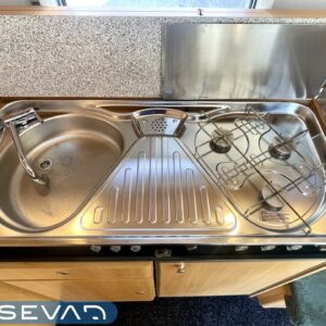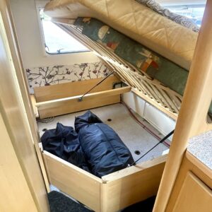 Alde, Jääkaappi, Kasetti WC, Lattialämmitys, Liesi, Lämminvesiboileri, Nestekiertolämmitys, Parivuode, Sähköpatruuna, Tukijalat, Kattoluukku, Pakastelokero, Pesuallas, Suihku, kaasun ulosotto, Kasettiverhot