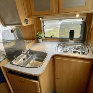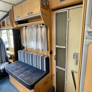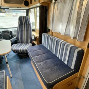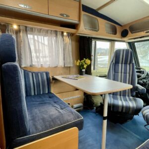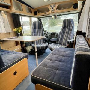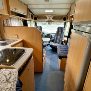 Auton etuosasta löytyy superavara pöytäryhmä sivusohvalla. Keskellä autoa on nykyiaikainen L- keittiö isolla jääkaappi- pakastimella varustettuna.