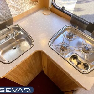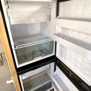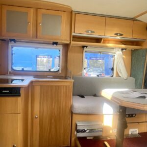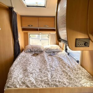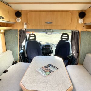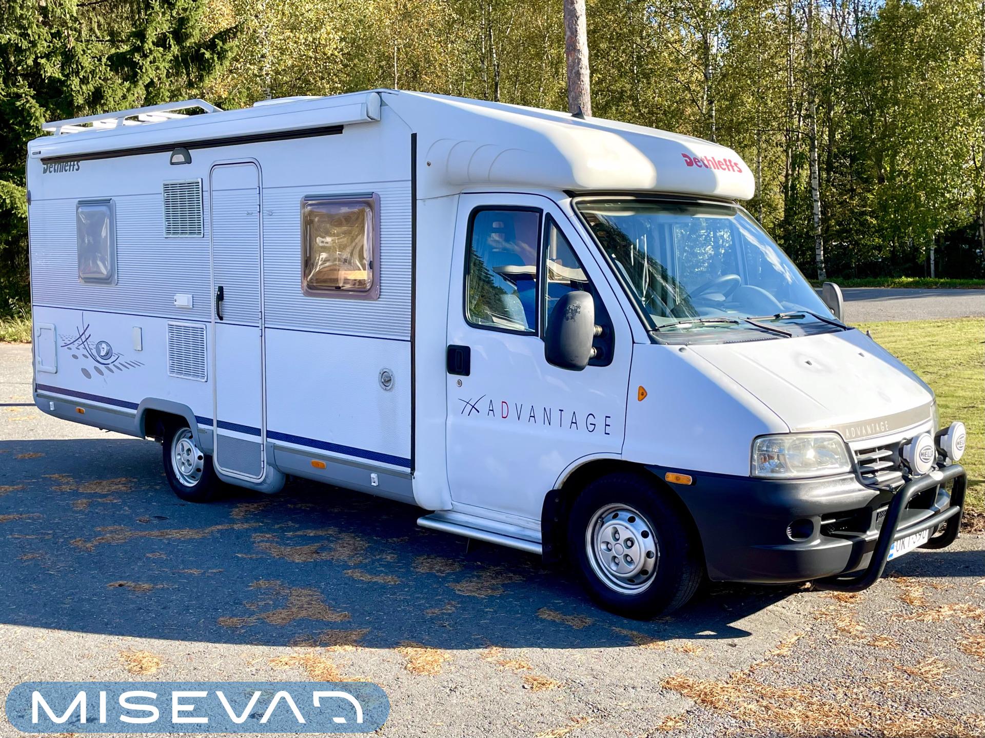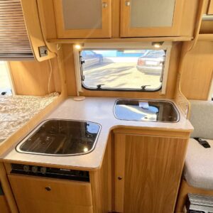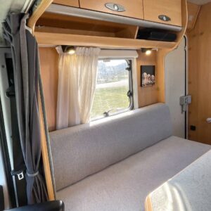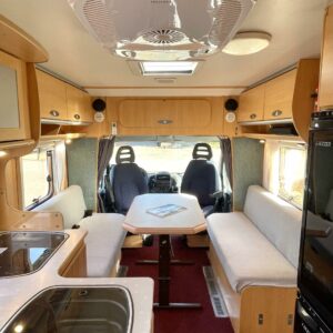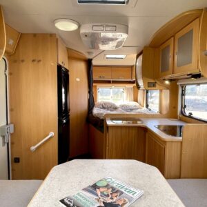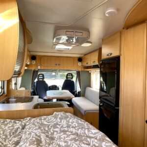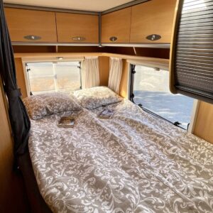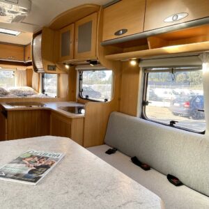 Tässä Dethleffsissä riittää varusteita. Asuinosaa on tuotu tähän päivään myös asentamalla kaksi kompressorikaappia keittiöön. On sinun päätettävissä käyttääkö reissuissa molempia vai pärjääkö vain yhdellä. Tilaa ruoansäilytykseen on reilusti. Keittiö itsessään on myös L-muotoinen, joten kokilla on oma rauha kokkailuun. Altaan ja lieden väliin jääkin loistava laskutila ruoanvalmistusta varten. Etuosassa autoa on iso ruokailutila neljälle ja kun edessä olevat penkit kääntää, niin pöydän ympärille mahtuu kuusikin henkilöä. Takaa löytyy vaatekomeron lisäksi wc- ja suihkutila. Ulkosuihku onnistuu myös kylpyhuoneen ikkunan kautta. Makuupaikat löytyy pehmeältä parisängyltä. Jonka alla on lisäksi vielä säilytystilaa takatallin muodossa. Tavaroita pääsee noukkimaan nostamalla sängyn tai ulkoluukun kautta. Oli kesä tai talvi, tämä auto on varustettu molempia vuodenaikoja ajatellen. Alde lämmittää ja Klarstein viilentää.