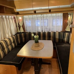 Erittäin kotoisa matkailuvaunu isolla parisänky ratkaisulla, joka ei vaadi kiipeilyä ja antaa todellista tilan tuntua.