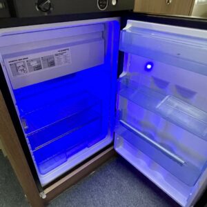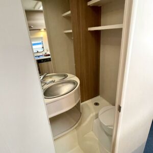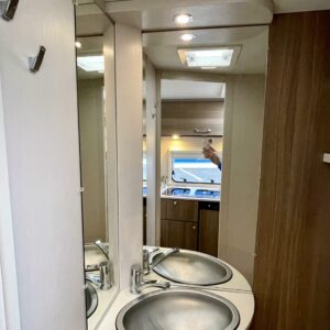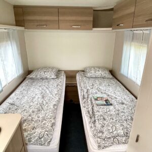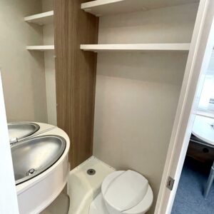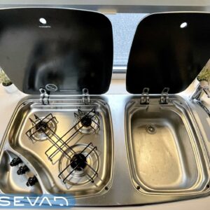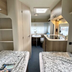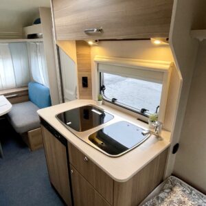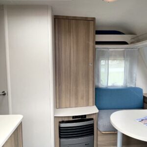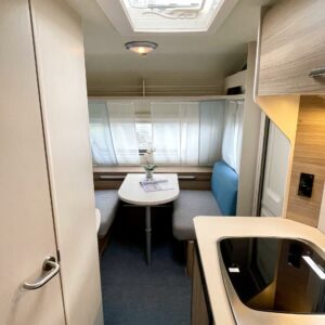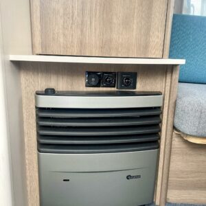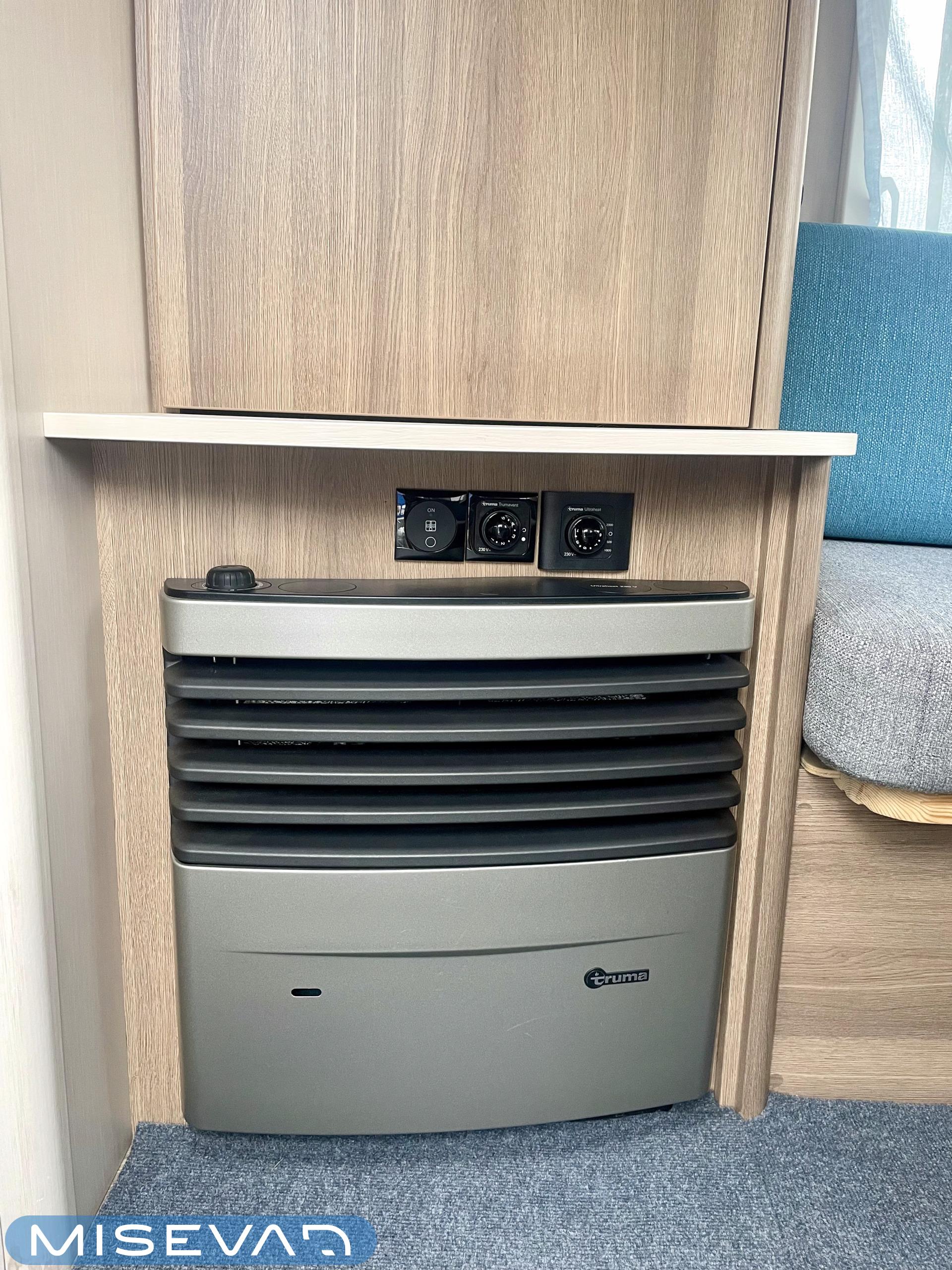 Trumatic- ilmapuhalluslämmitys, Truma, Sähköpatruuna, Erillisvuoteet, Jääkaappi, Kasetti WC, Kasettiverhot, Kattoluukku, Liesi, Lämminvesiboileri, Markiisi, Pakastelokero, Pesuallas, Tukijalat, Asuinosan hyttysovi/verho