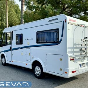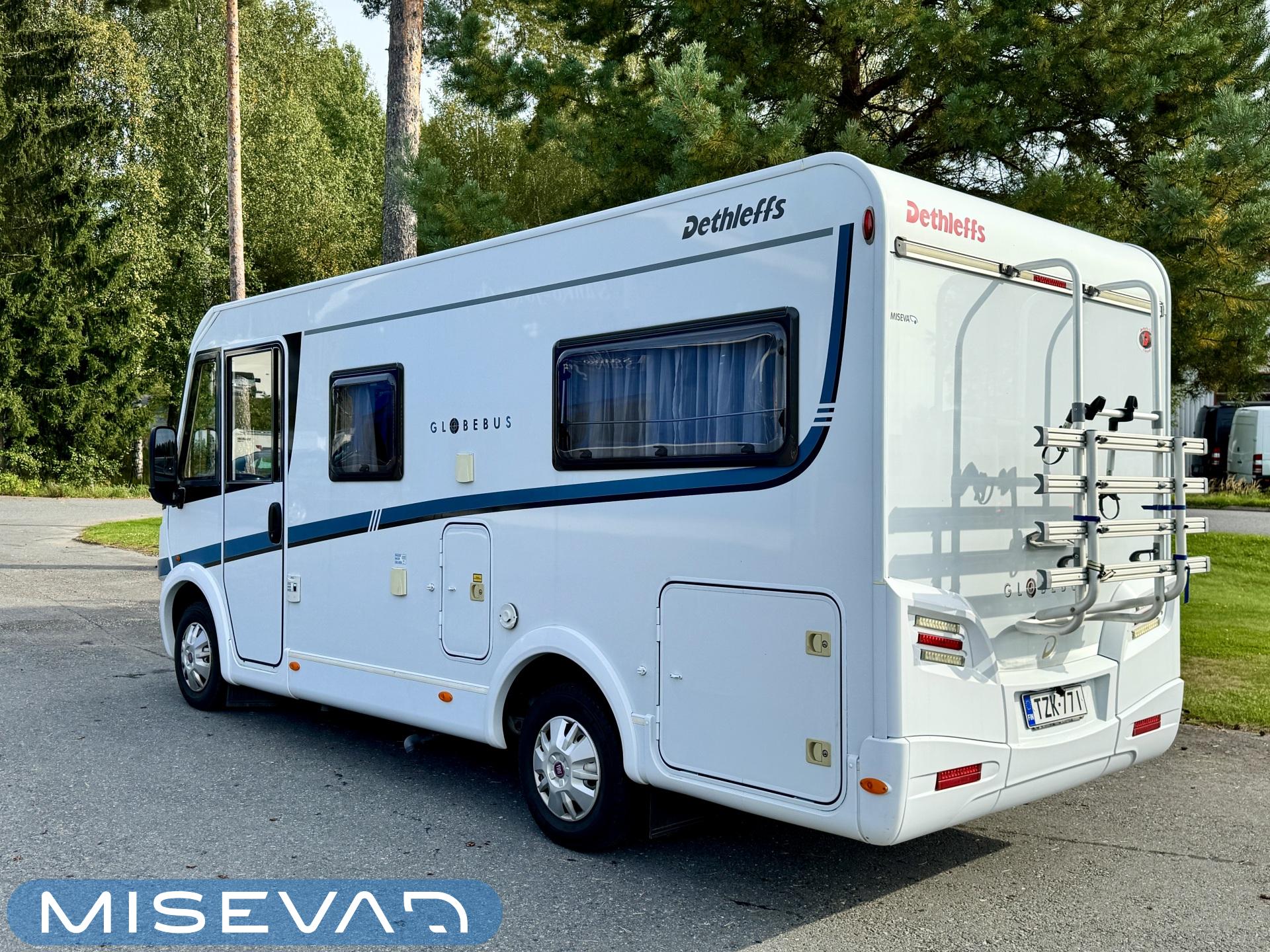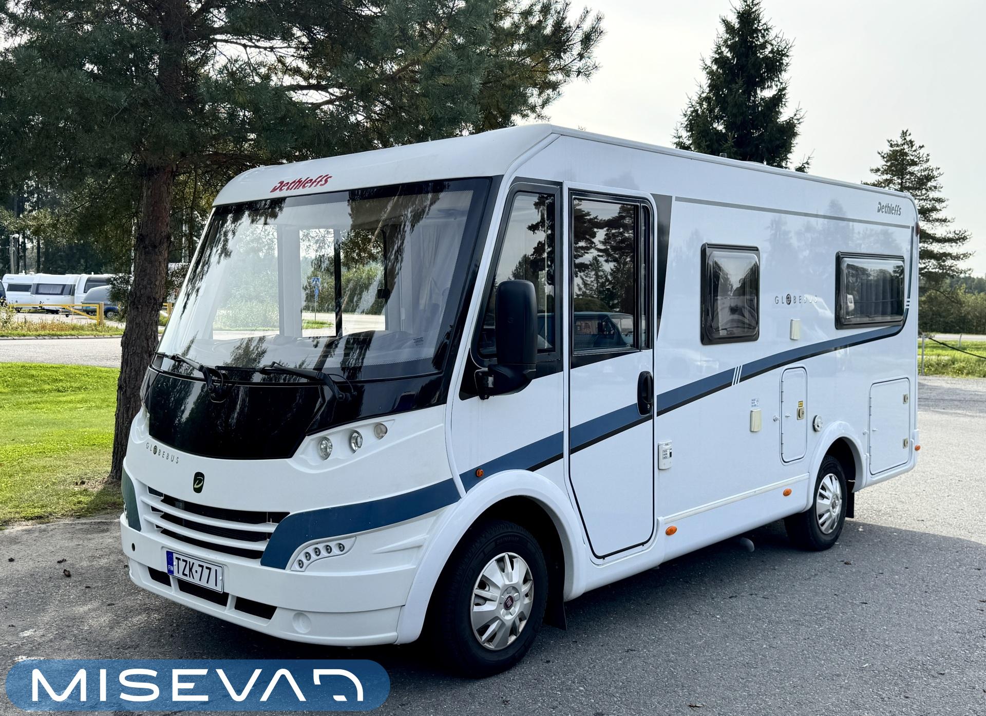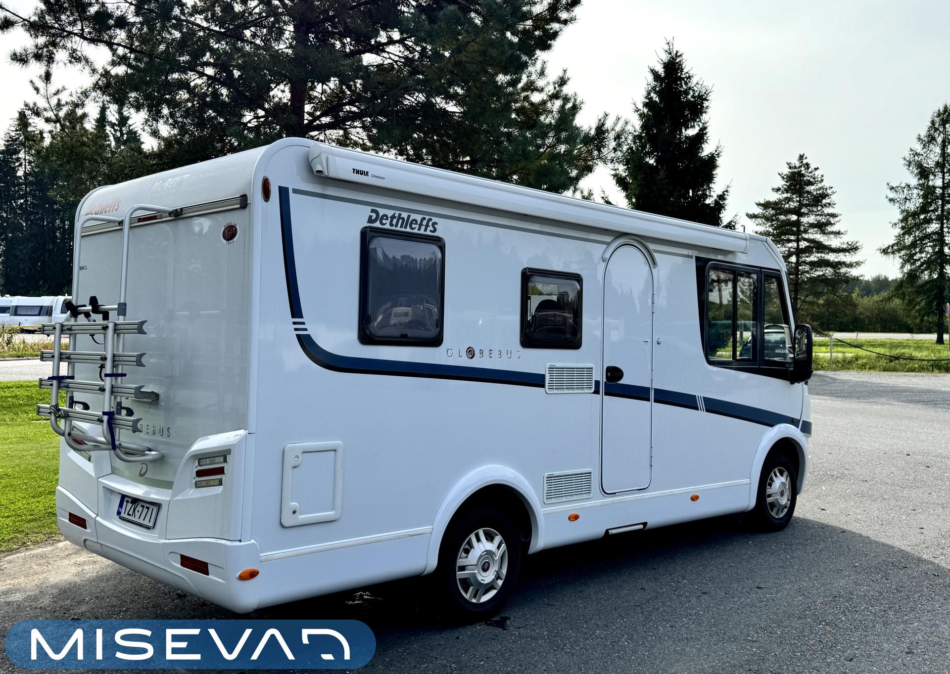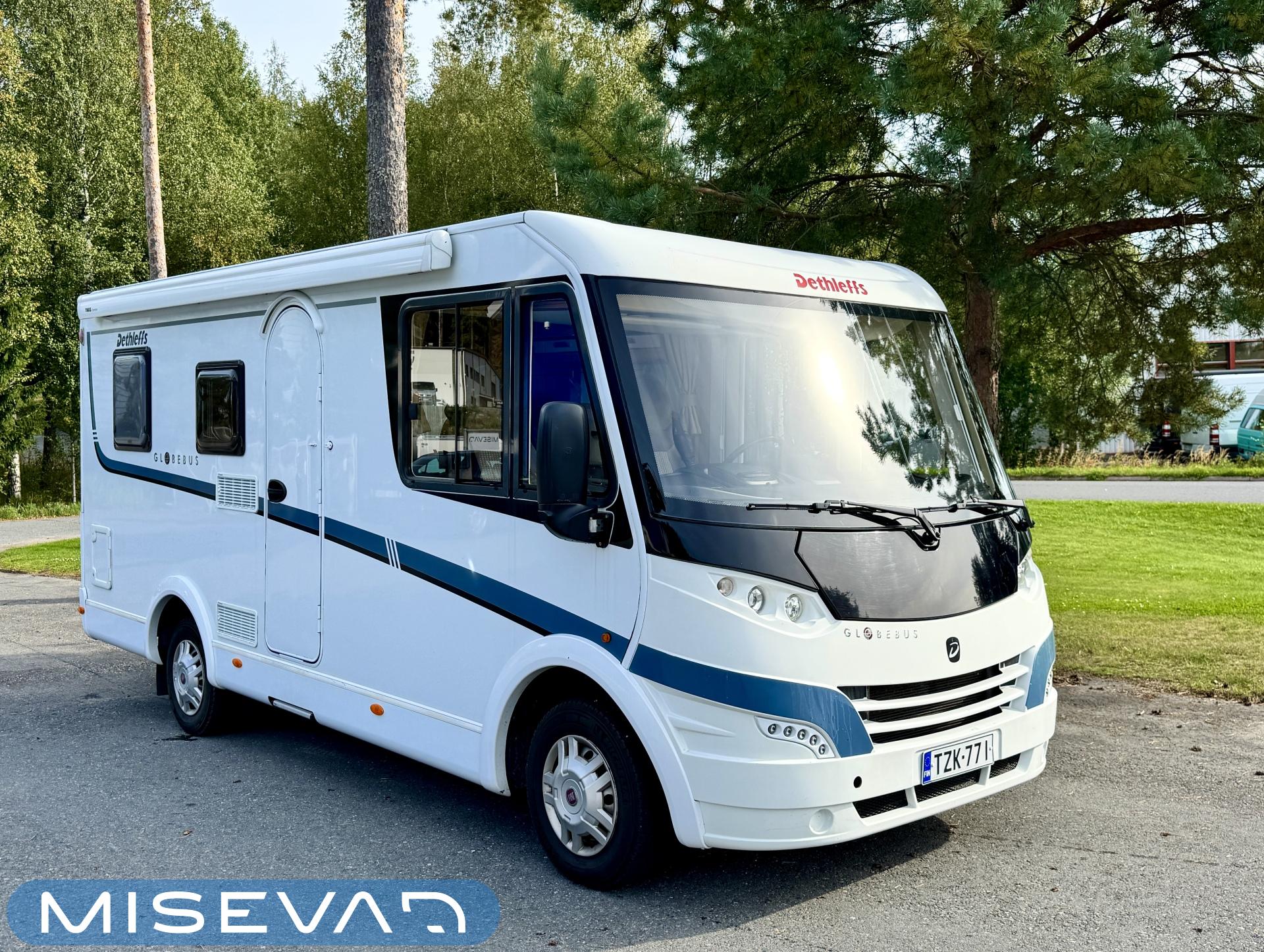 Tosi hieno lyhyt integroitu Dethleffs Globebus joka on kapeampi ja siten melkein retkeilyauton kokoinen.