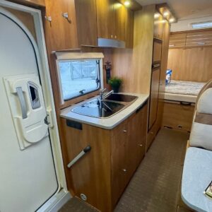 Auton keskivaiheilta löytyy isolla jääkaappi- pakastimella varustettu keittiö ja pesuhuone/ WC.