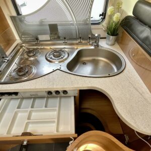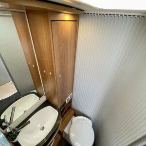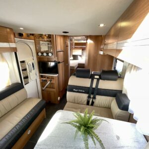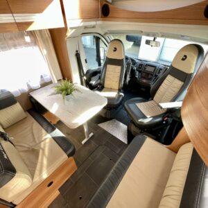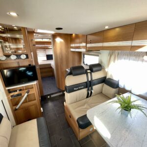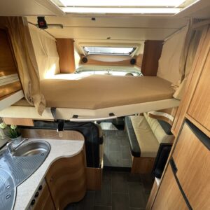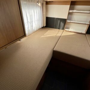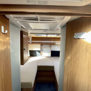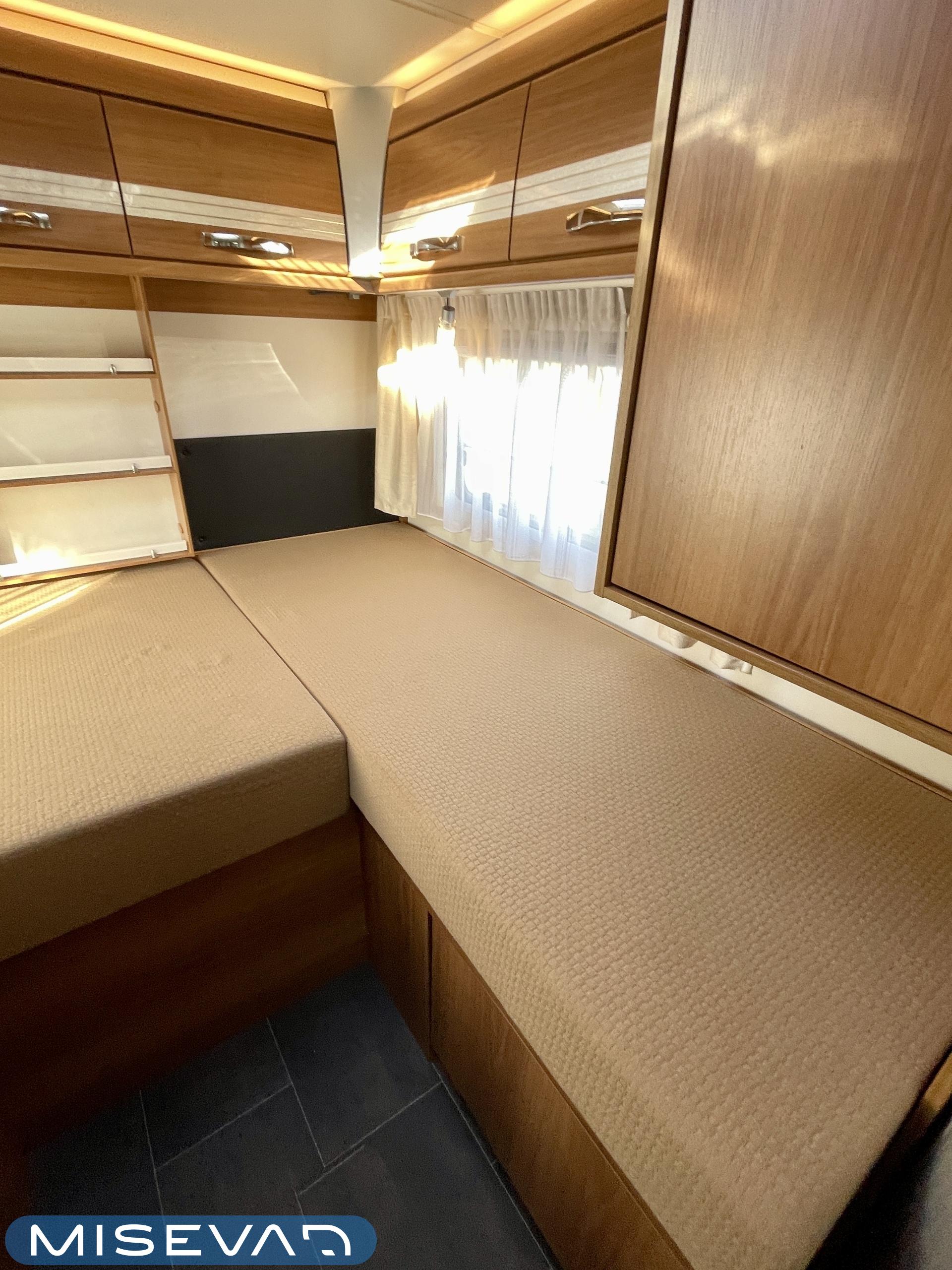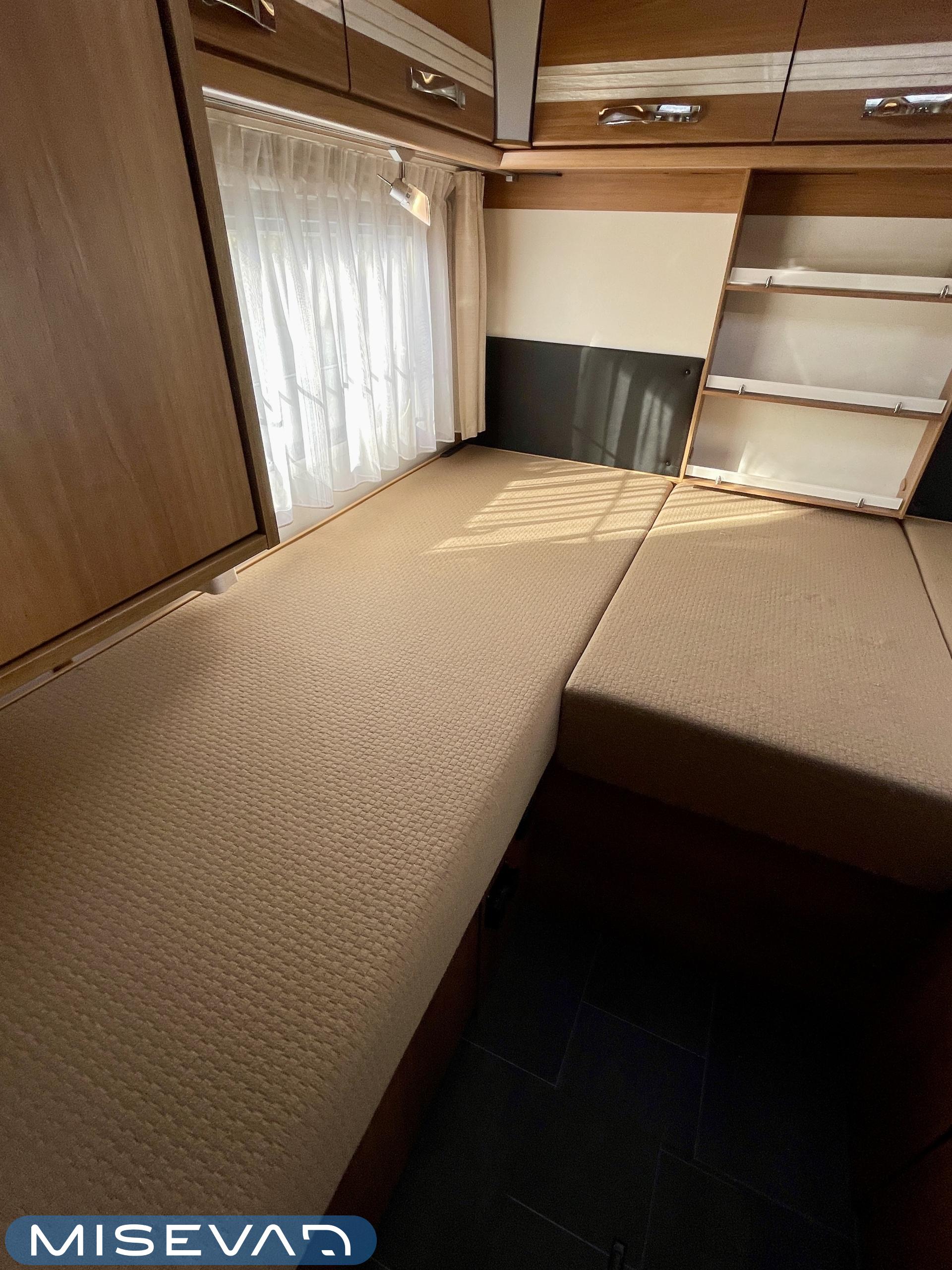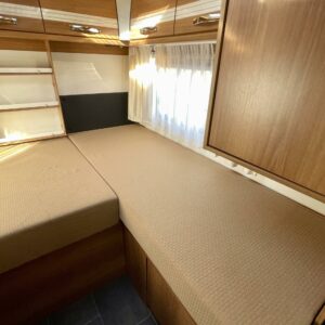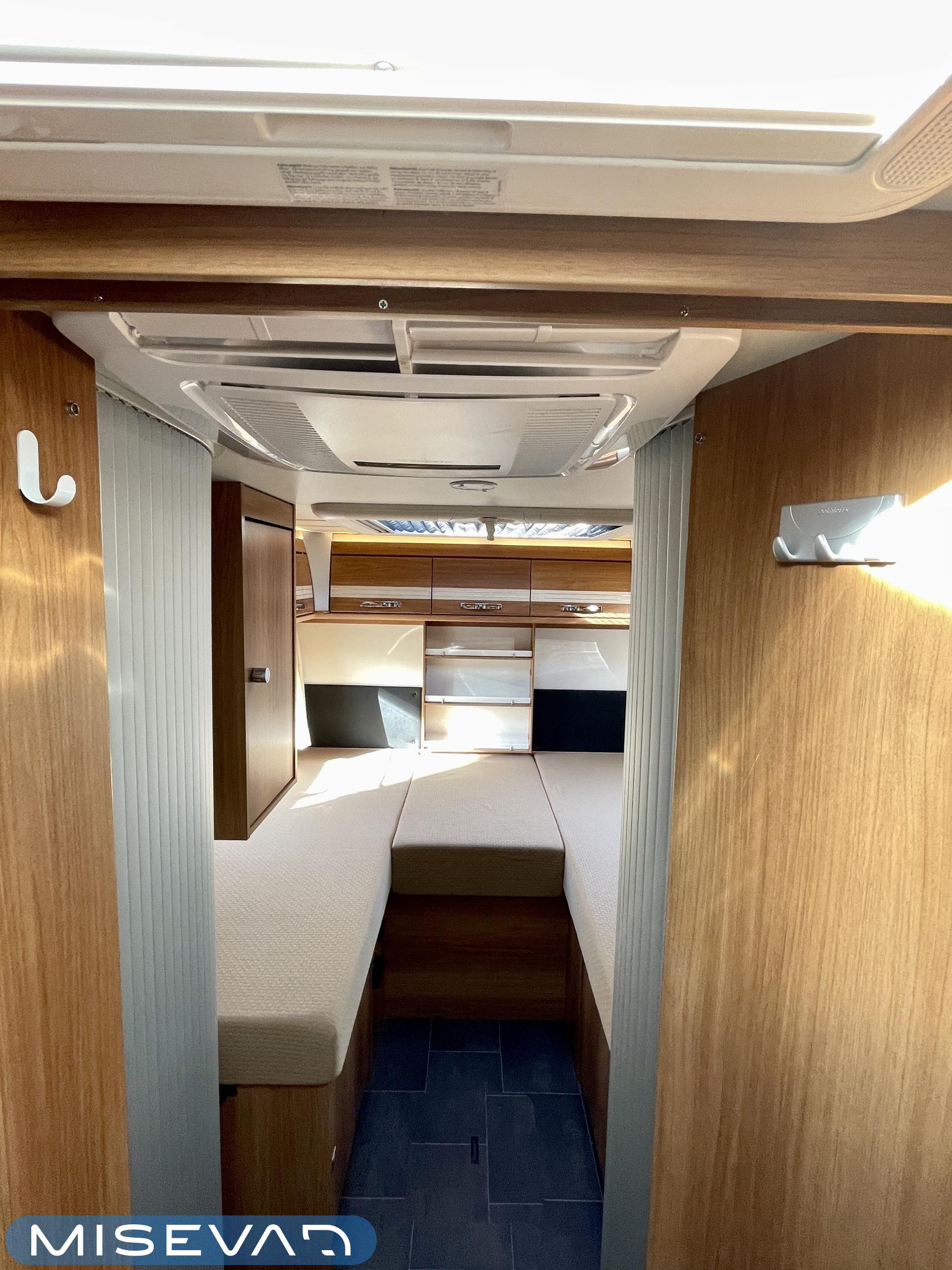 Tilava ja käytännöllinen ratkaisu vaikka perheelle. Tässä mallissa matkustusmukavuus ja asumisen helppous on asetettu etusijalle: erillisvuoteet takaavat rauhalliset yöunet ja mukavan istuinryhmän yläpuolelle kätkeytyvä laskusänky tuo lisää nukkumapaikkoja.