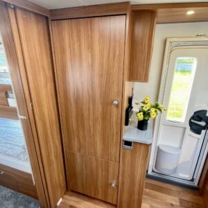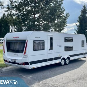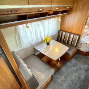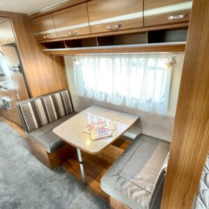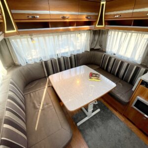 Vaunun takaosaa hallitsee ison pöytäryhmän lisäksi hyvin varusteltu keittiö suurella jenkkikaapilla. Keskeltä vaunua löytyy kerrosvuoteet kahdelle ja pienempi pöytäryhmä joka muuntautuu käden käänteessä vuoteeksi. Vaunun keulassa on tilava parivuode sekä wc ja kylpyhuone tilat.