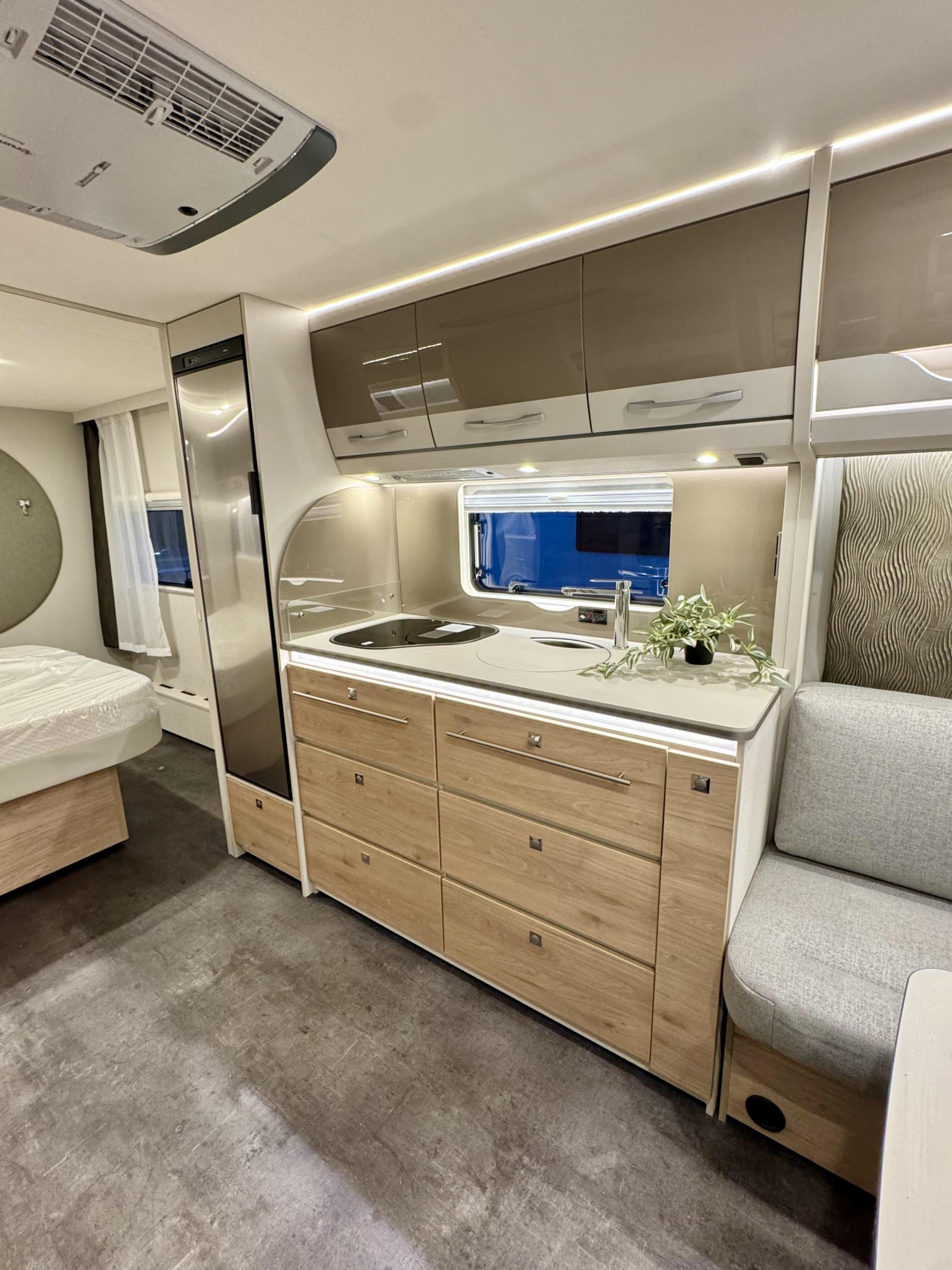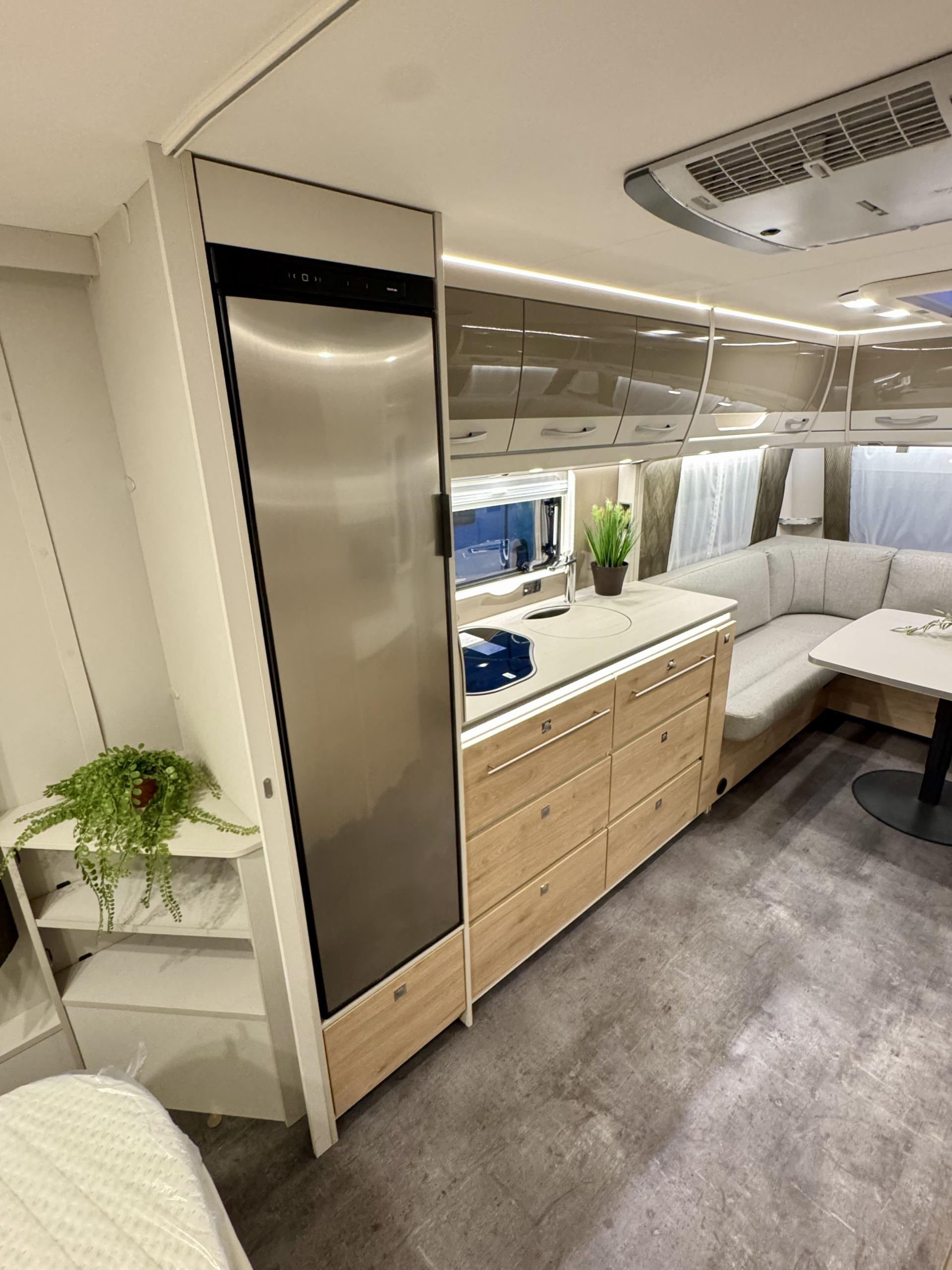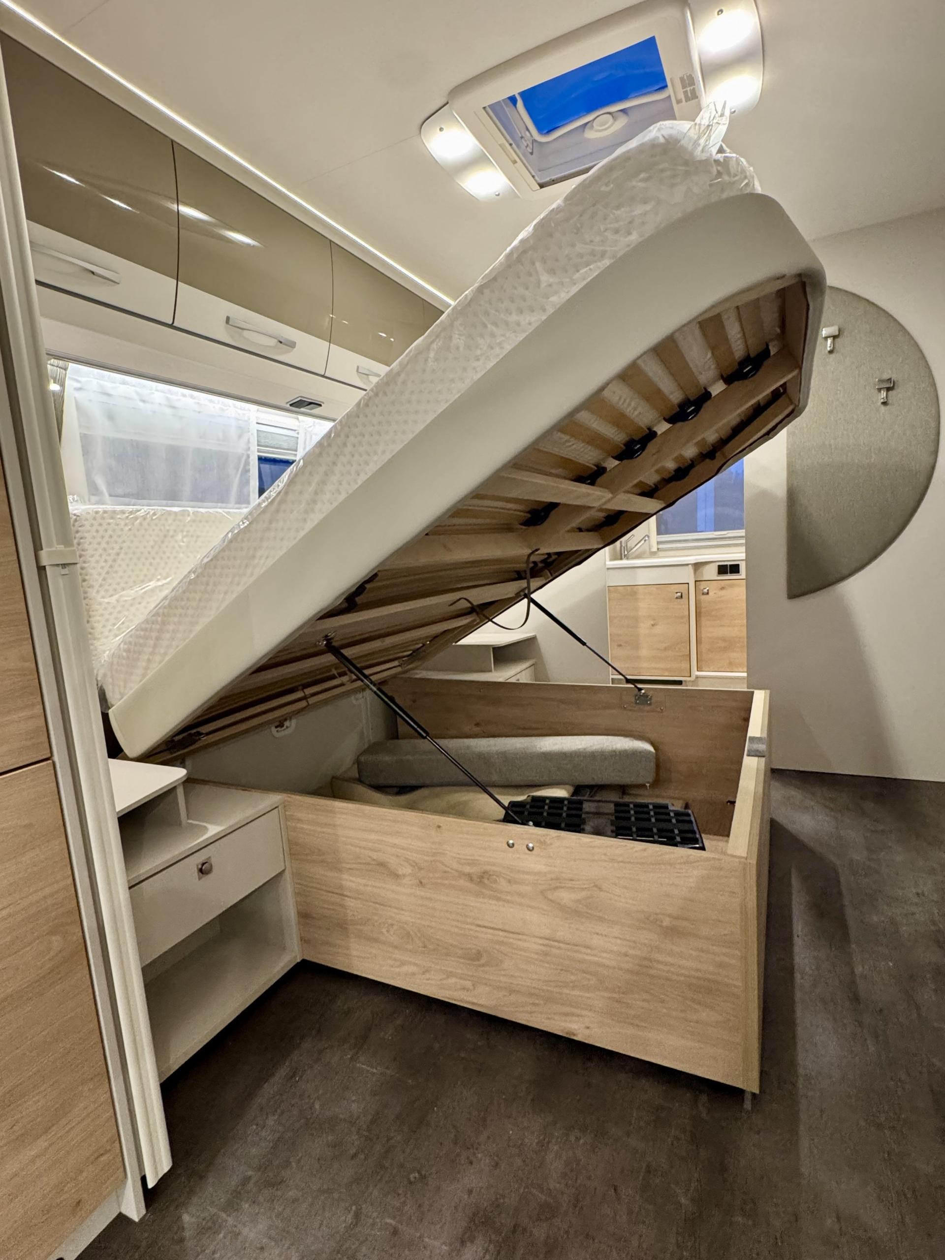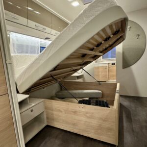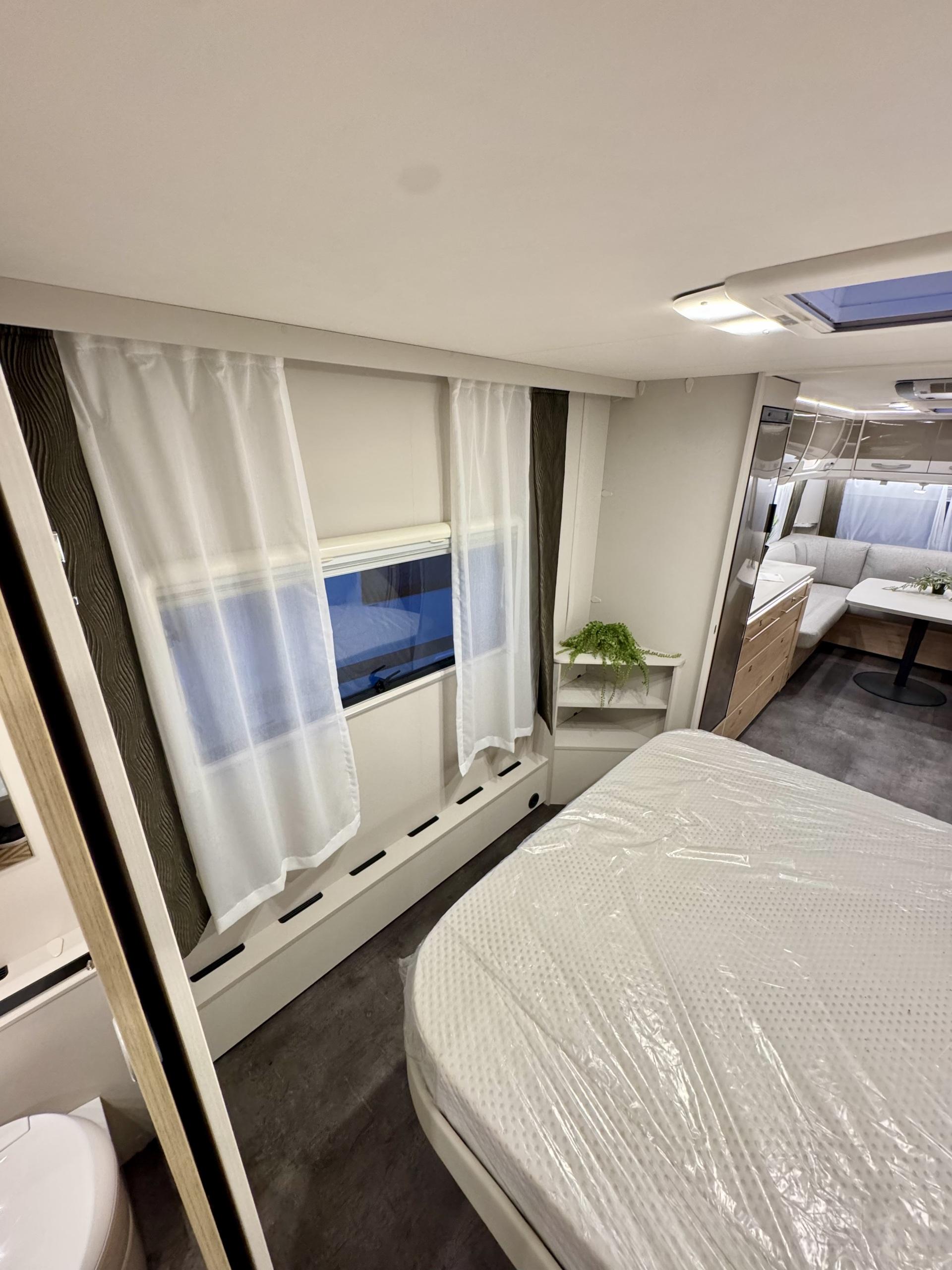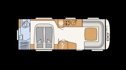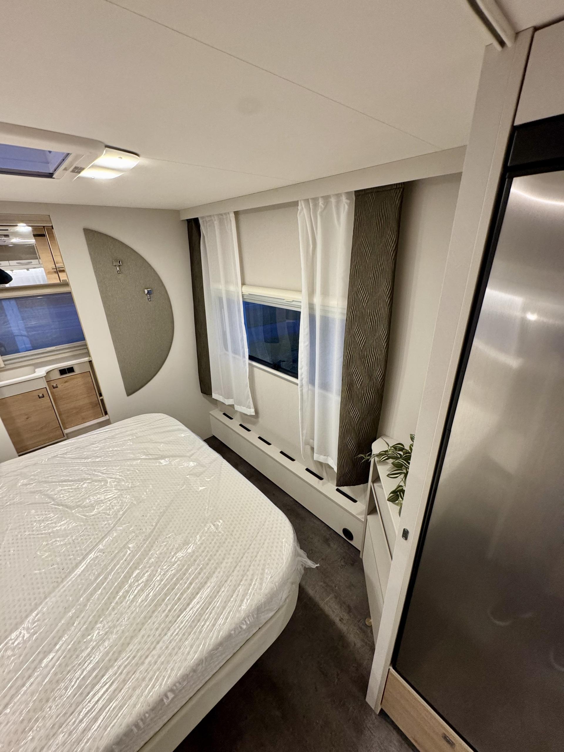 Edessä suuri istuinryhmä joka sijattavissa parivuoteeksi. Keskellä avara keittiö, jossa kivasti laskutilaa, suuri jääkaappipakastin -yhdistelmä ja vastapuolella suuri vaatekaappi sekä ulkovaate kaappi oven vieressä. Taaempana leveä saarekevuode, josta helppo nousta molemmin puolin. Vuoteen alla suuri säilytystila, jonne ulkoluukku. Ulkoluukusta mahtuvat helposti sisään retkipöydät ja sukset.