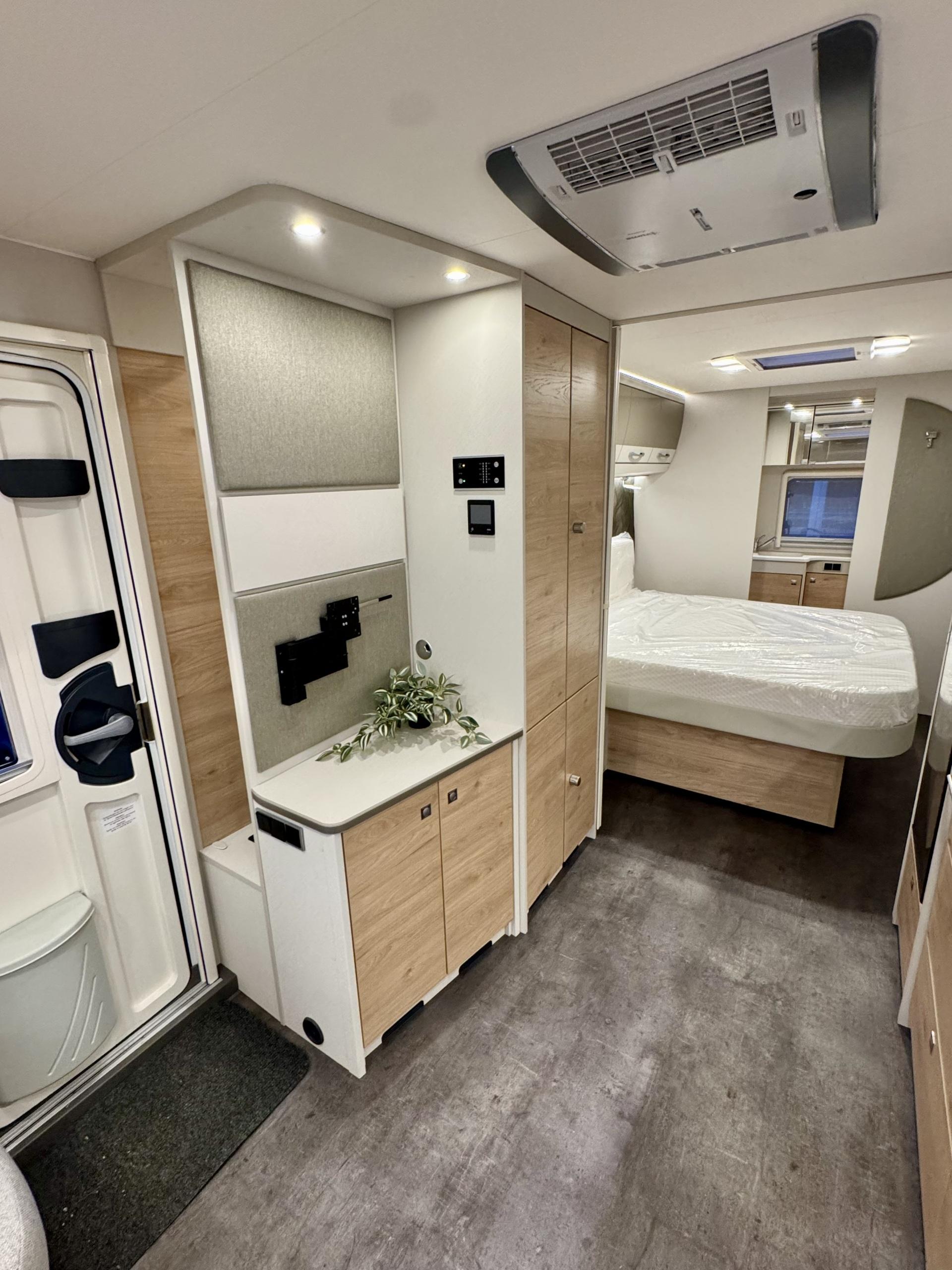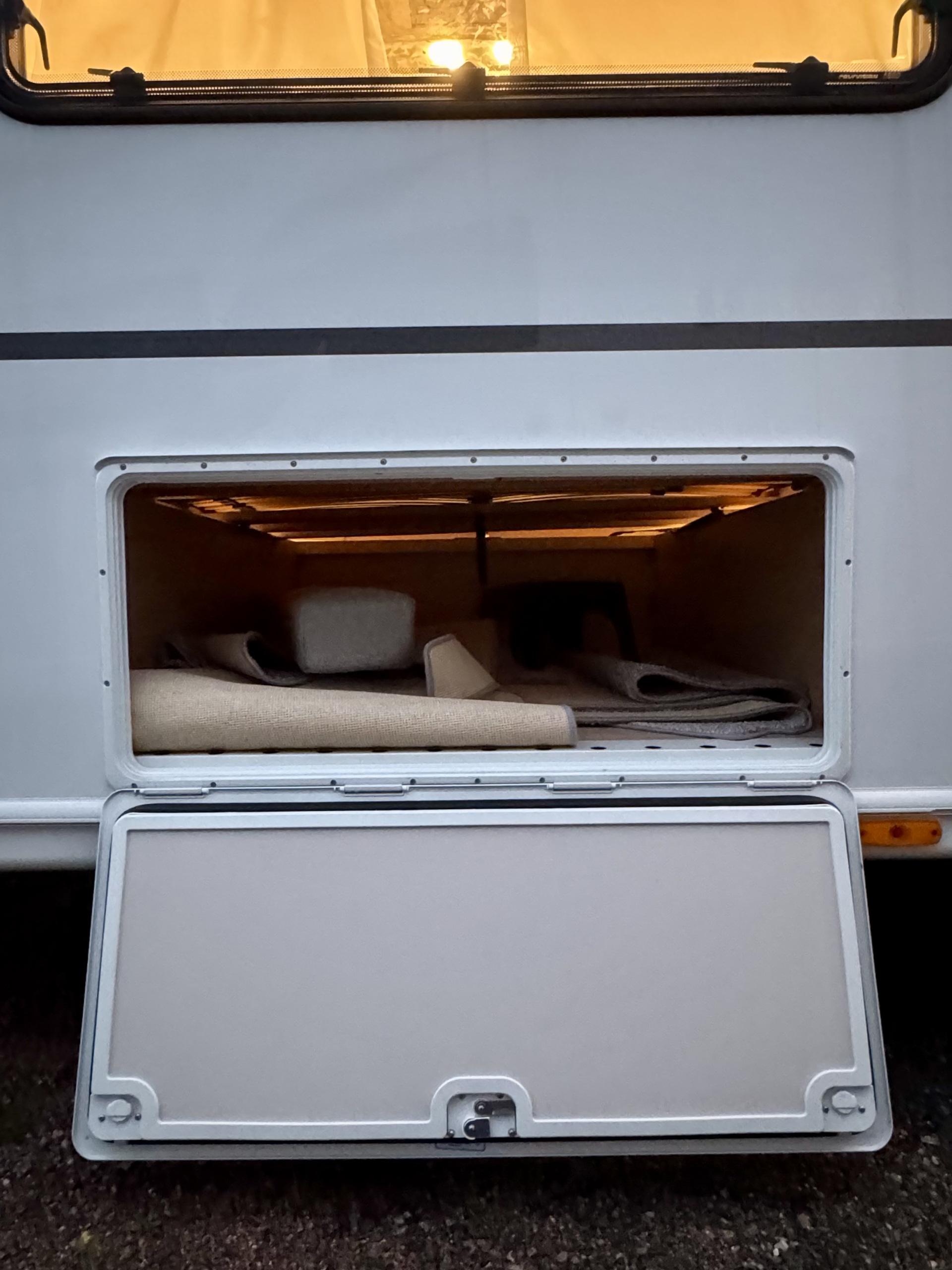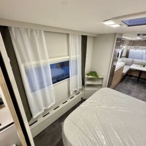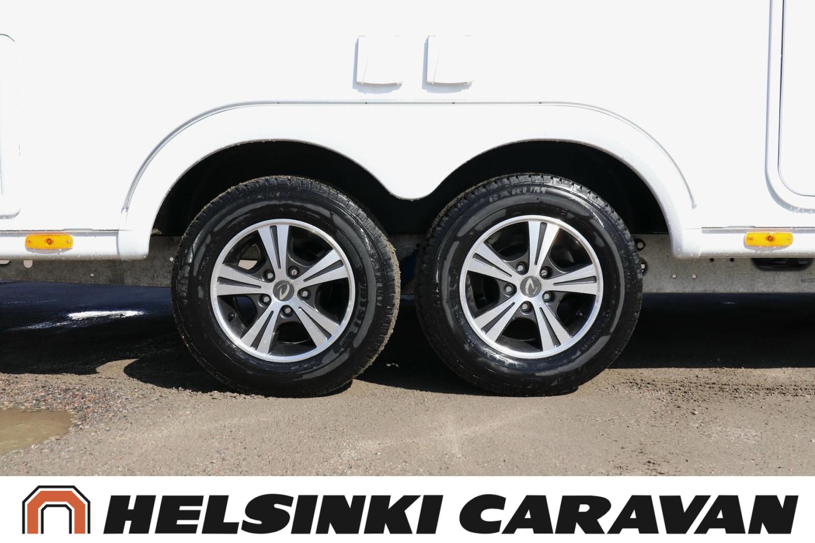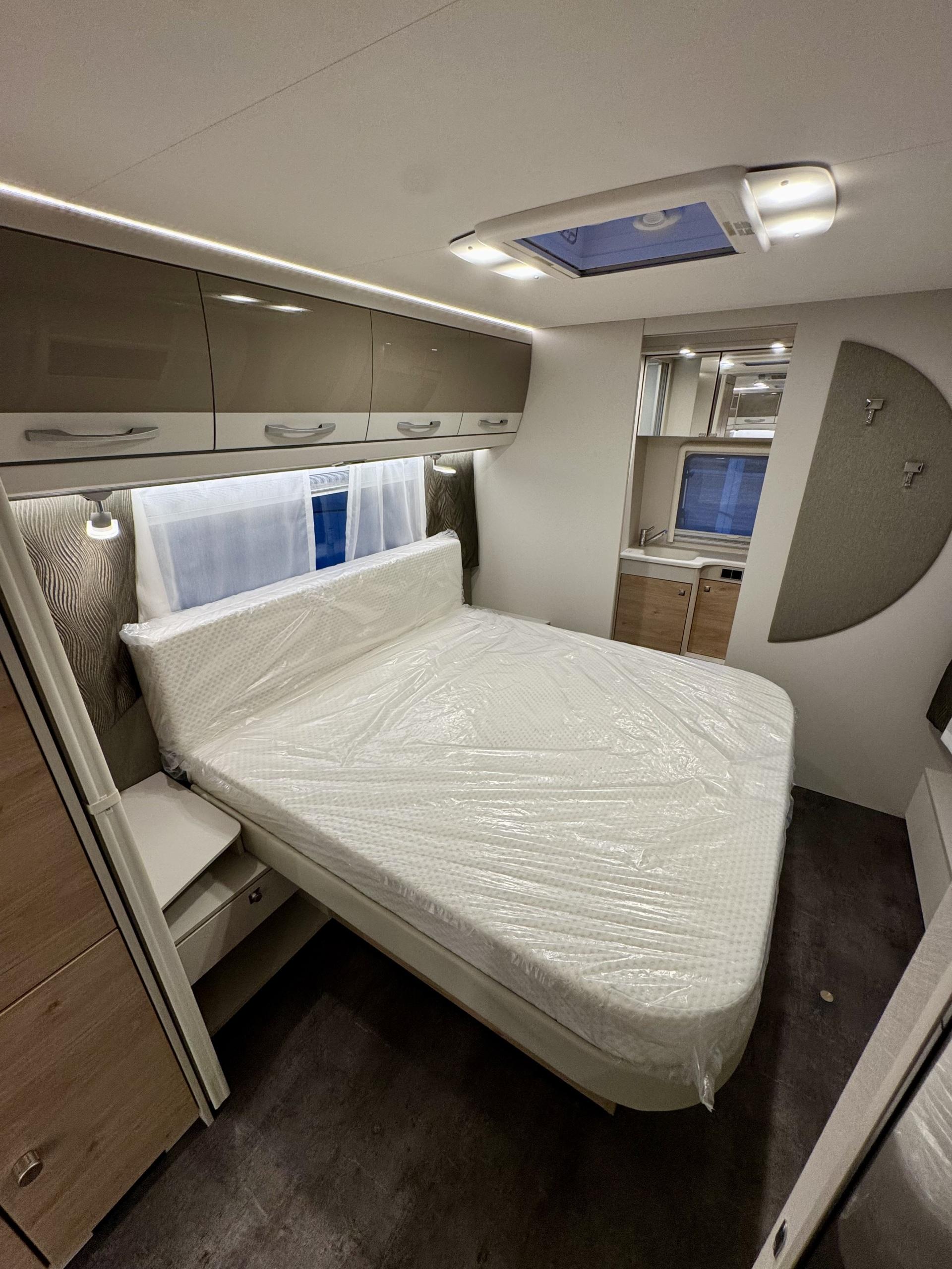 Edessä suuri istuinryhmä joka sijattavissa parivuoteeksi. Keskellä avara keittiö, jossa kivasti laskutilaa, suuri jääkaappipakastin -yhdistelmä ja vastapuolella suuri vaatekaappi sekä ulkovaate kaappi oven vieressä. Taaempana leveä saarekevuode, josta helppo nousta molemmin puolin. Vuoteen alla suuri säilytystila, jonne ulkoluukku. Ulkoluukusta mahtuvat helposti sisään retkipöydät ja sukset.