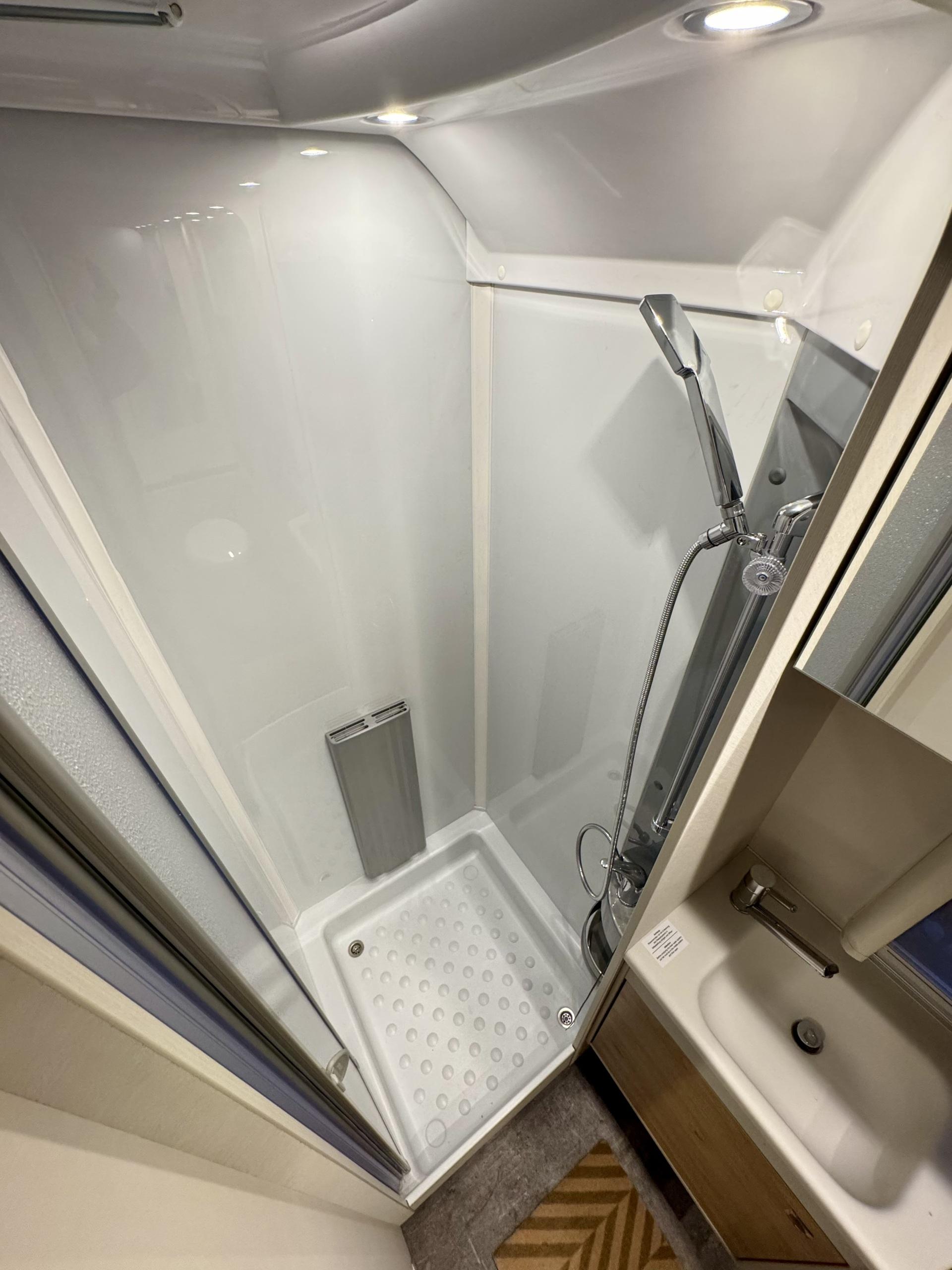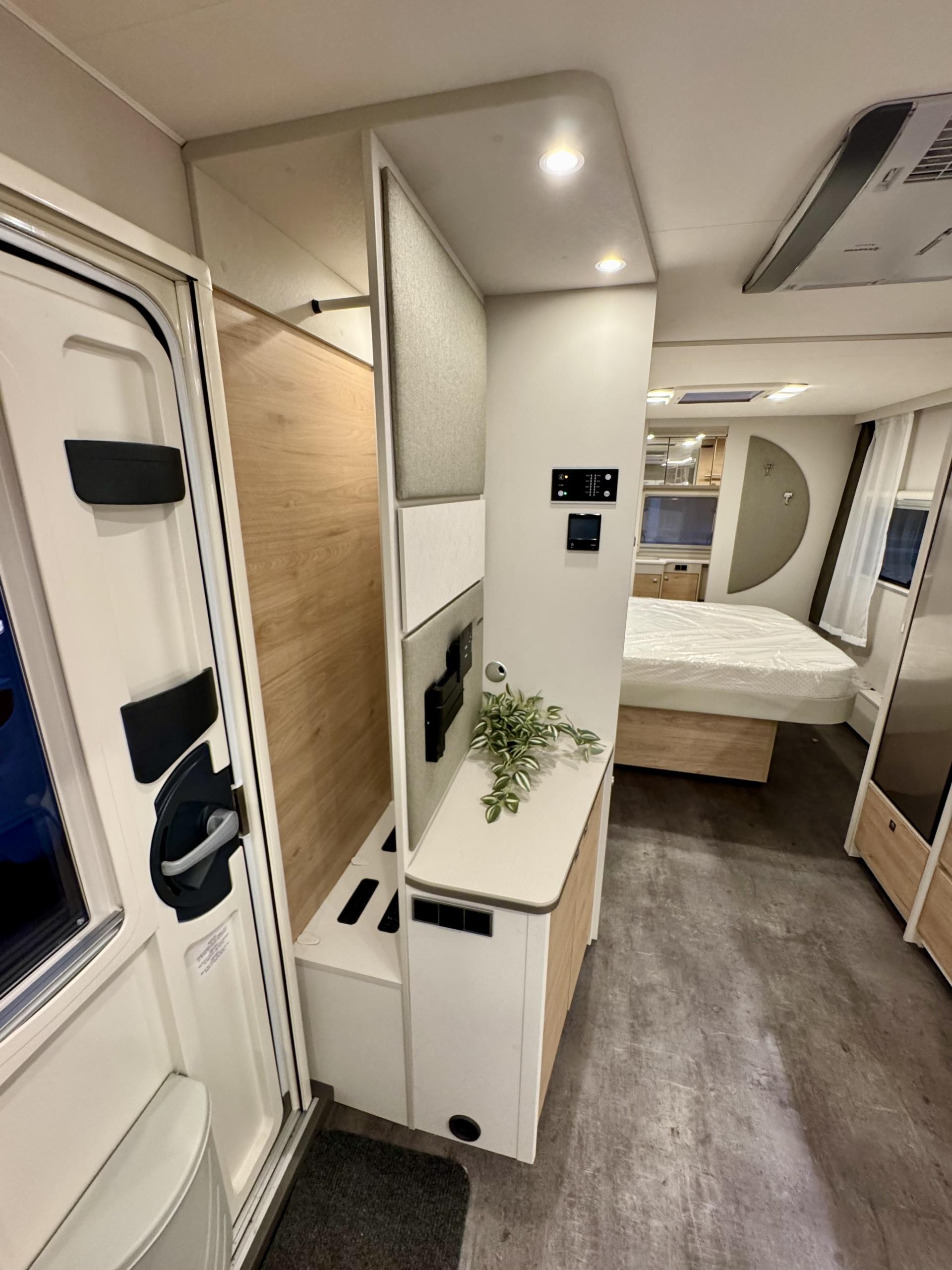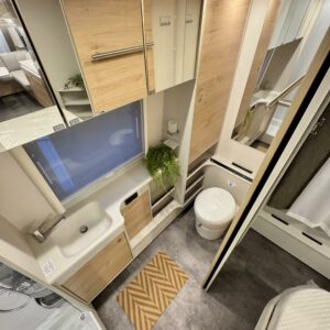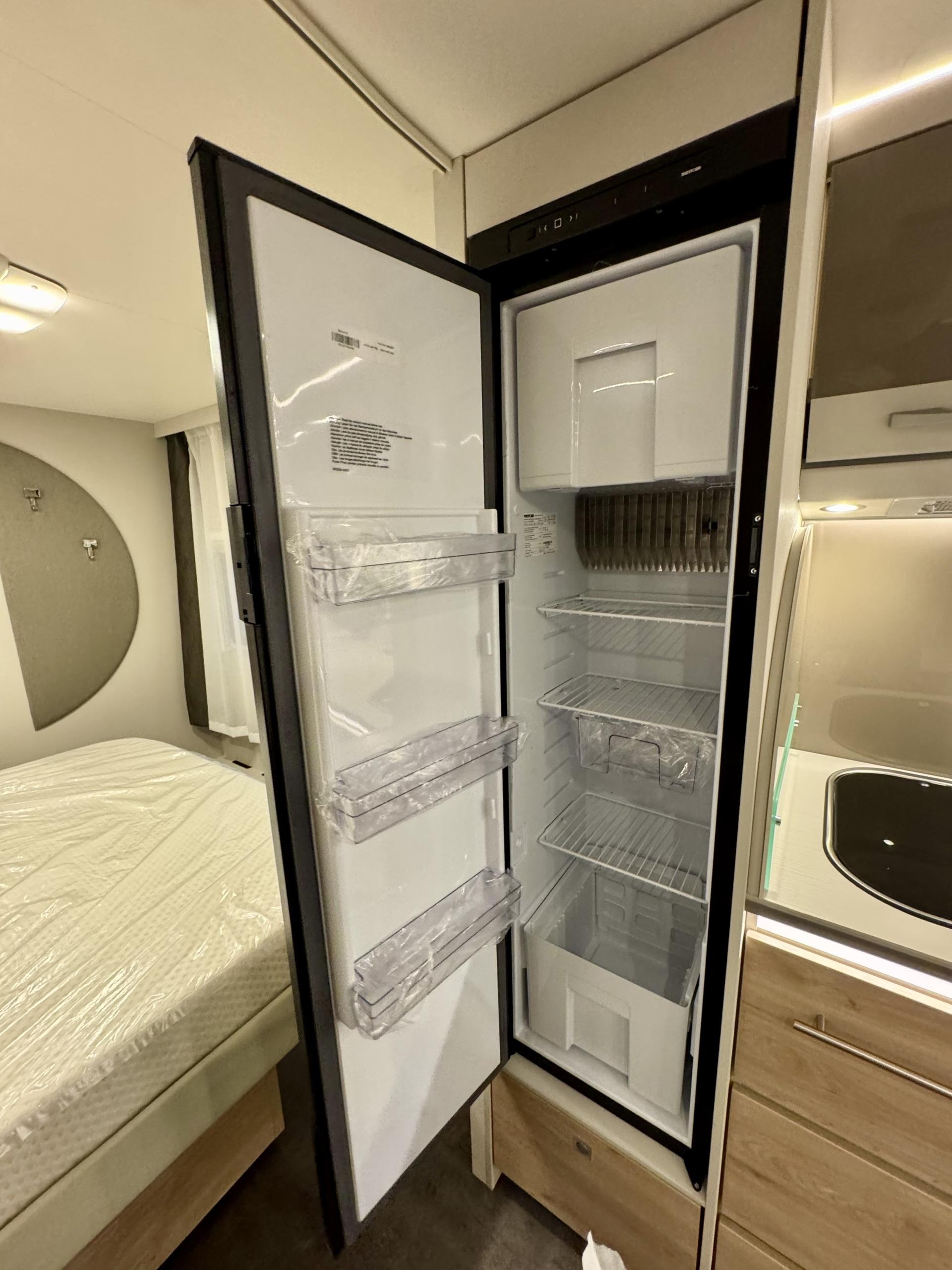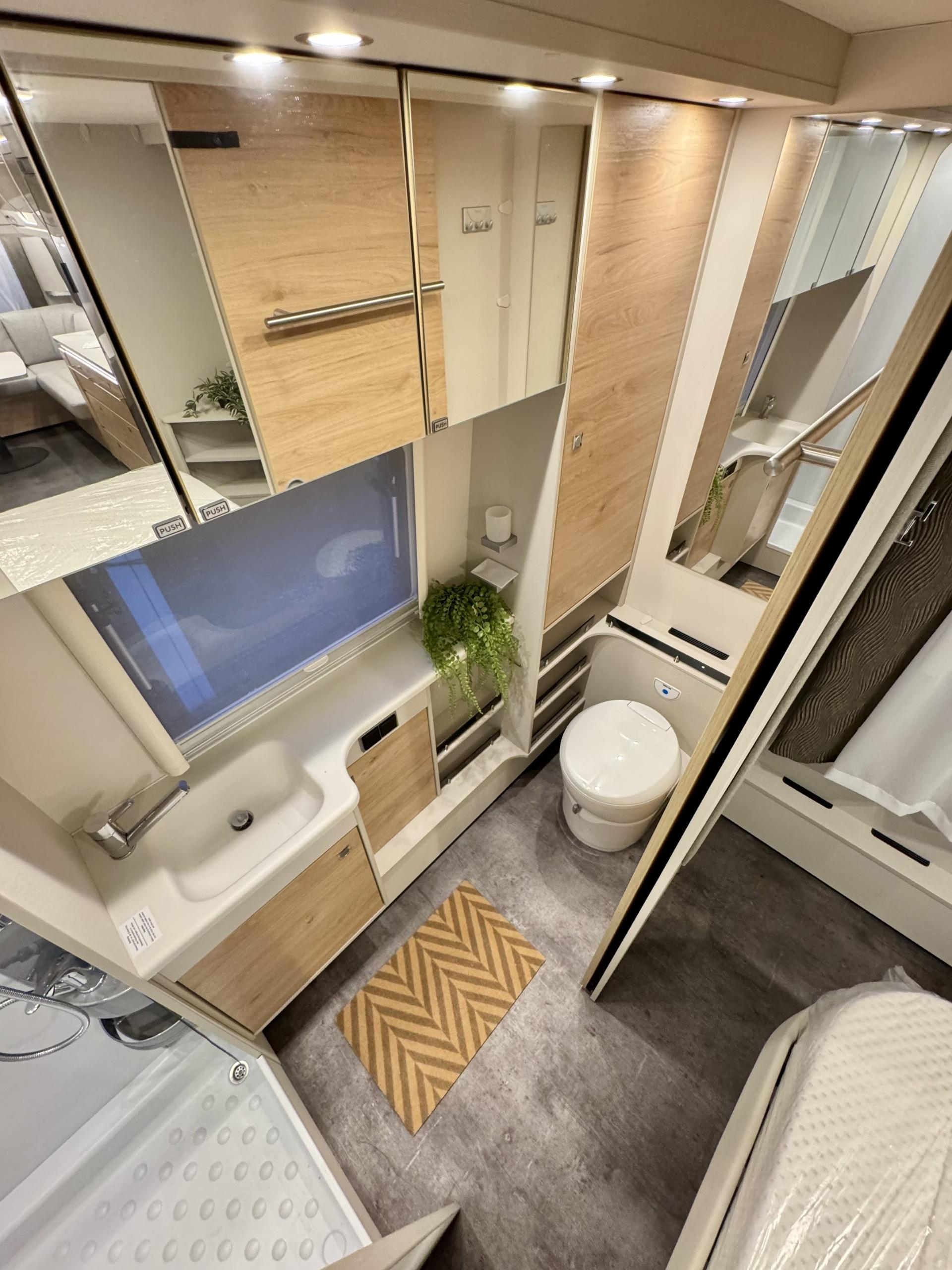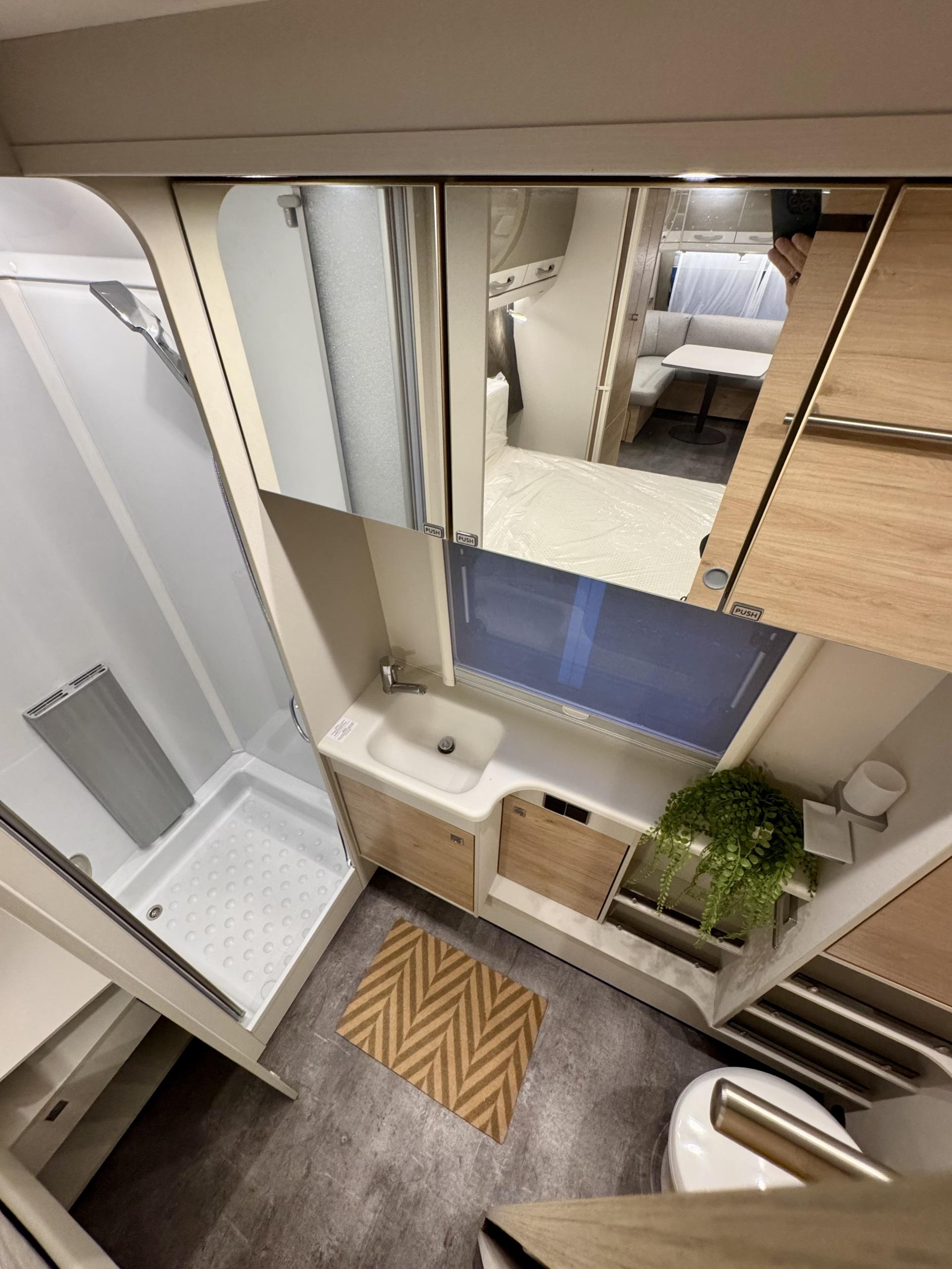 Edessä suuri istuinryhmä joka sijattavissa parivuoteeksi. Keskellä avara keittiö, jossa kivasti laskutilaa, suuri jääkaappipakastin -yhdistelmä ja vastapuolella suuri vaatekaappi sekä ulkovaate kaappi oven vieressä. Taaempana leveä saarekevuode, josta helppo nousta molemmin puolin. Vuoteen alla suuri säilytystila, jonne ulkoluukku. Ulkoluukusta mahtuvat helposti sisään retkipöydät ja sukset.