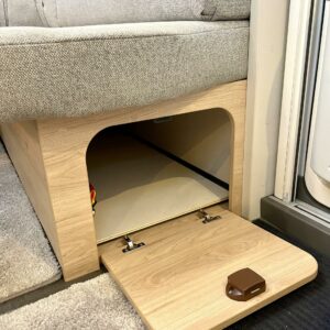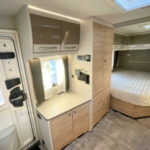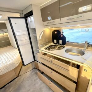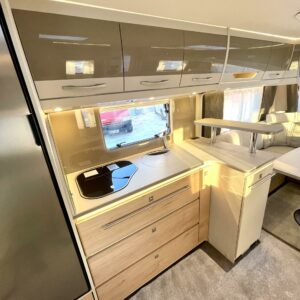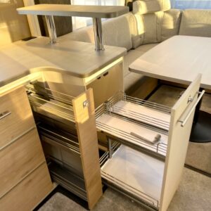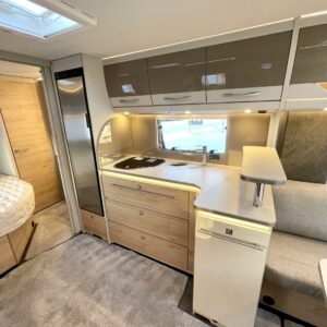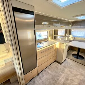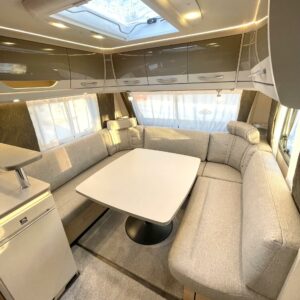 Keskellä vaunua sijaitsee tilava keittiö isolla jääkaapilla ja pakastelokerolla. Takaosassa on iso U:n muotoinen sohvaryhmä, joka toimii olohuoneena päivällä ja tarjoaa iltaisin nukkumatiloja levitettävänä sänkynä.