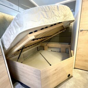 Etuosassa on pitkittäinen parivuode, jossa voit nauttia rauhallisista yöunista.