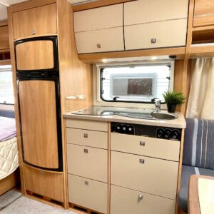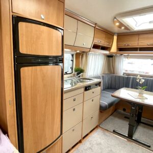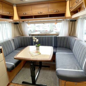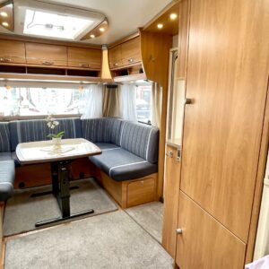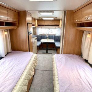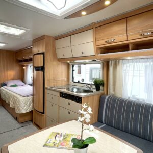 Vaunun etuosassa on tilava istuinryhmä, keskellä keittiö, missä suuri jääkaappi pakastelokeroineen sekä runsaasti kaappitilaa. Vaunun takaosasta löytyy erilliset pitkittäiset vuoteet sekä koko vaunun levyinen WC – suihkutila.