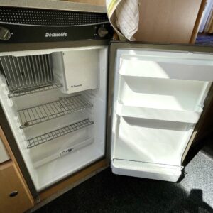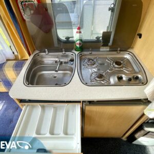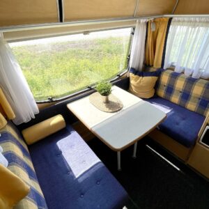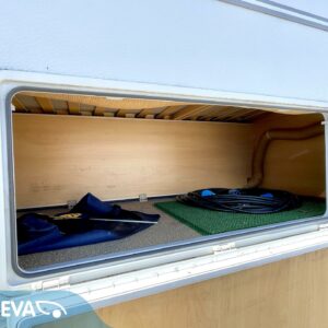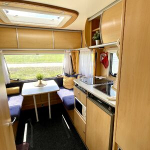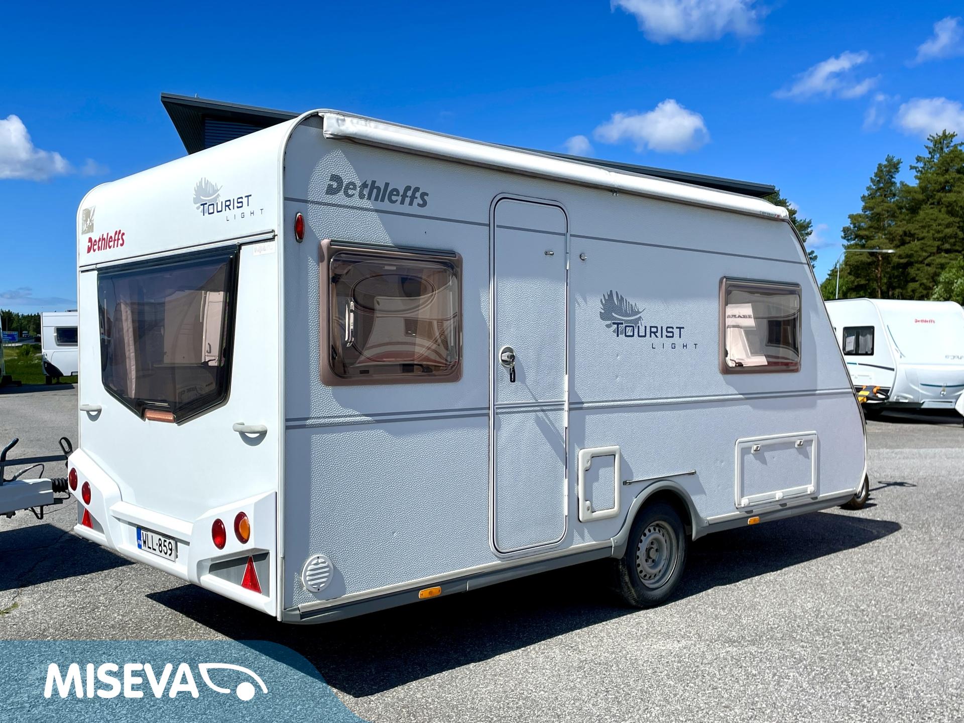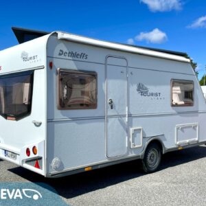 Kevyt lyhyt erillisvuoteinen Dethleffs. Vähän erillainen pohjaratkaisu. mUkavalla korkeudella olevat vuoteet ja pikkainen olohuone takapäässä.