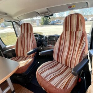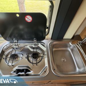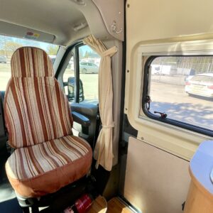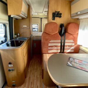 Auton etuosassa on valoisa pöytäryhmä neljälle. Pöytäryhmästä on mahdollista sijata lisävuode pienemmän ihmisen nukkumapaikaksi.