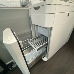 Takana poikittainen parivuode minkä alapuolella mukavasti säilytystilaa. Keskellä WC/kylpyhuonetilat sekä keittiö. Edessä pöytäryhmä minne yhdistyvät kääntyvät ohjaamon penkit. Pöytäryhmän yläpuolella camber ylävuode kahdelle henkilölle.