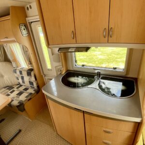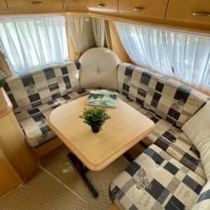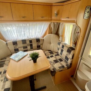 Oikein näpsäkkä (kok.paino 1300kg) hienon kunnon omaava erillisvuoteinen Hobbyn matkailuvaunu. Edessä on molemmilla sivuilla pitkittäis-suuntaiset erillisvuoteet. Vuoteiden alle jää säilytystiloja ja niihin on käynti myös ulkopuolisten luukkujen kautta. Keskelle on sijoitettu keittiö normaalilla matkailuvaunun keittiövarustuksella. Etuosaa hallitsee U-ryhmä, mistä saadaan tarpeen vaatiessa sijattua vuode kahdelle henkilölle. Lämmitysjärjestelmänä on Trumaticin ilmakeskuslämmitys ja sähkövastuksilla (sähköpatruuna) varustettuna. Juuri tarkastettu ja katsastettu vaunu valmiina kohti uusia seikkailuja.