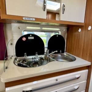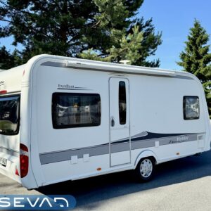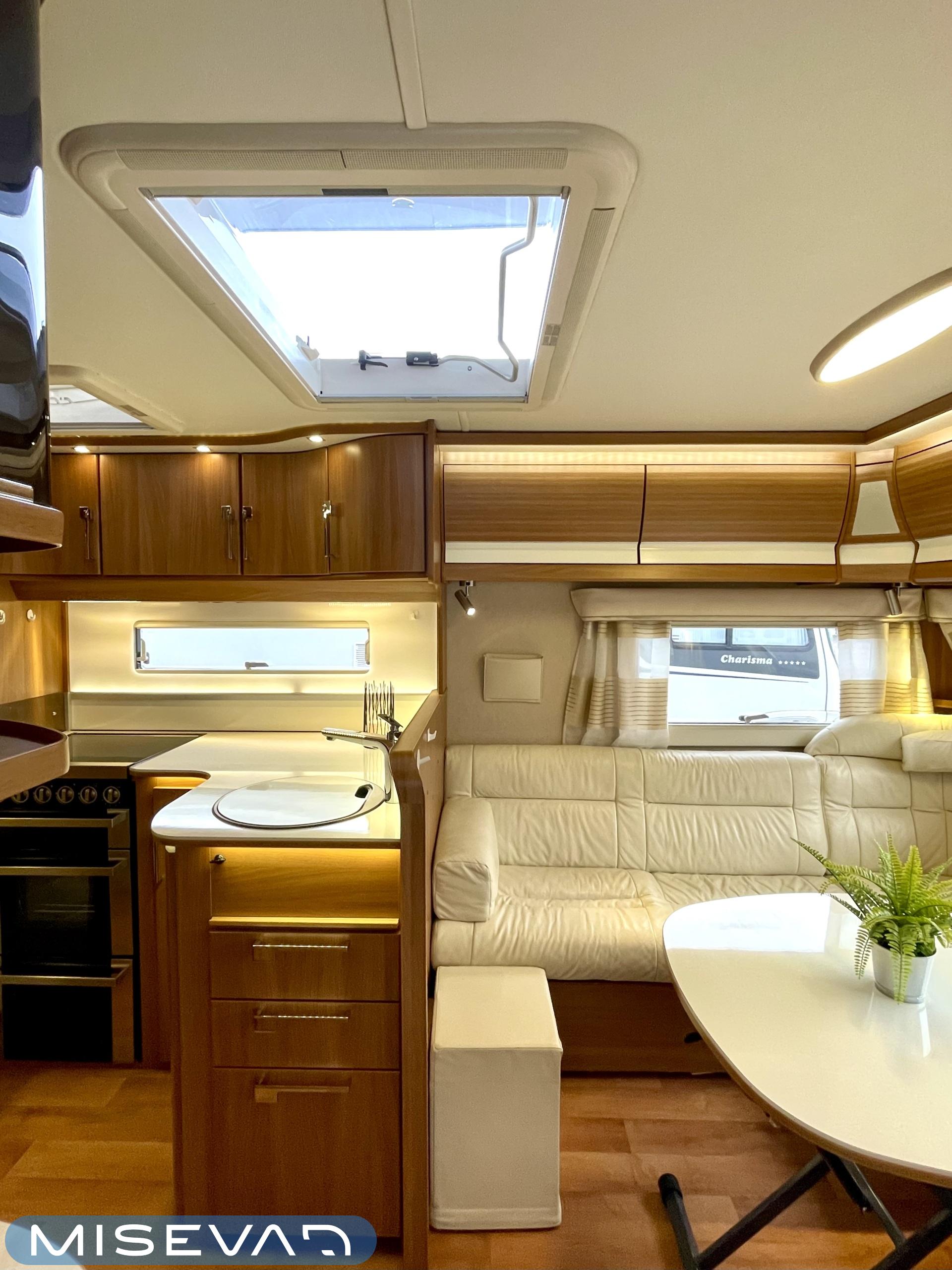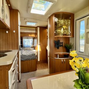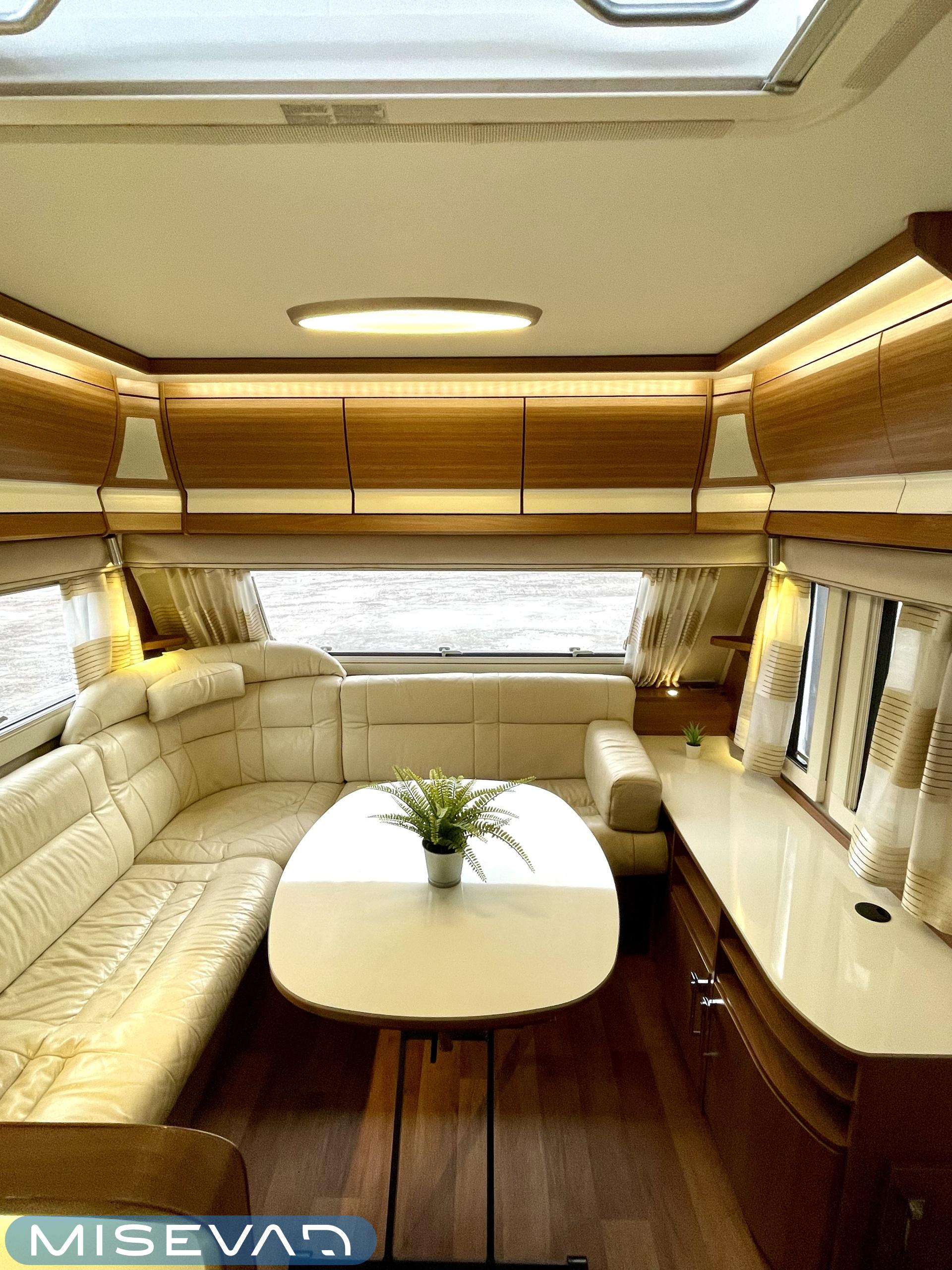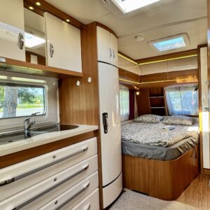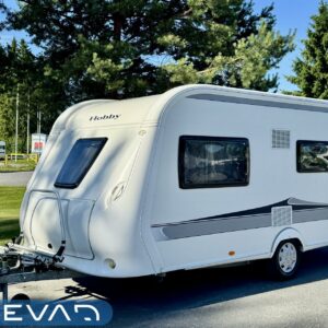 Vaunussa on käytetty pinta-ala tehokkaasti ja silti se on vielä tilava. Edessä löytyy mukava parisänky, jonka alla reilun kokoinen säilytystila. Vaunun Wc-tila on varustettu myös suihkulla. Ja ikkunan avaamalla ulkosuihkuttelukin onnistuu. Keskeltä löytyy keittiö isoilla vetolaatikoilla ja pitkä jääkaappi pakastinlokerolla. Etuosan valtaa pöytäryhmä, jonka ympärille mahtuu ainakin kuusi henkilöä ruokailemaan. Tila muuttuu myös sängyksi ja vaunu tarjoaa nukkumapaikat neljälle. Lämmityksen hoitaa nestekiertoinen Alde. Kaikenkaikkiaan Hobby on siisti kokonaisuus ja täydellinen reissukaveri minne vain menetkin!