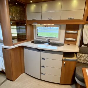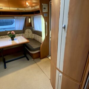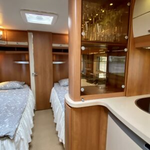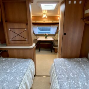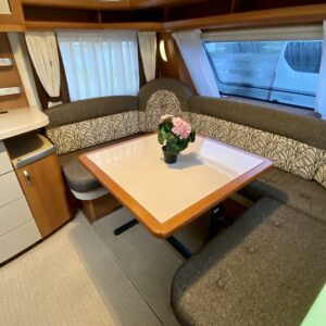 Vaunun etuosasta löytyy valoisa ja viihtyisä U-sohvalla varustettu pöytäryhmä. Keskeltä löytyy keittiön lisäksi paljon kaappitilaa säilytystä varten. Takaosasta löytyy ylivoimaisesti suosituin sänkyvaihtoehto eli erillissängyt! Näiden sänkyjen välistä pääsee näppärästi todella tilavaan pesutilaan, joka jakautuu kätevästi omaan suihku- ja WC-nurkkaukseen.