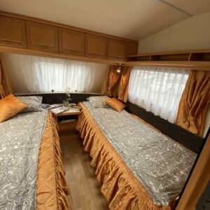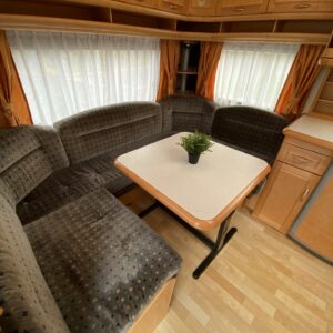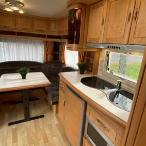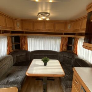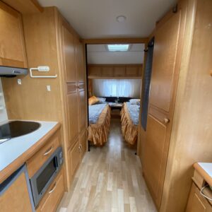 Vaunun etuosassa on erillisvuoteet. Keskeltä vaunua löytyy kattavasti varusteltu keittiö, sekä wc. Vaunun peräpäässä on pöytäryhmä.