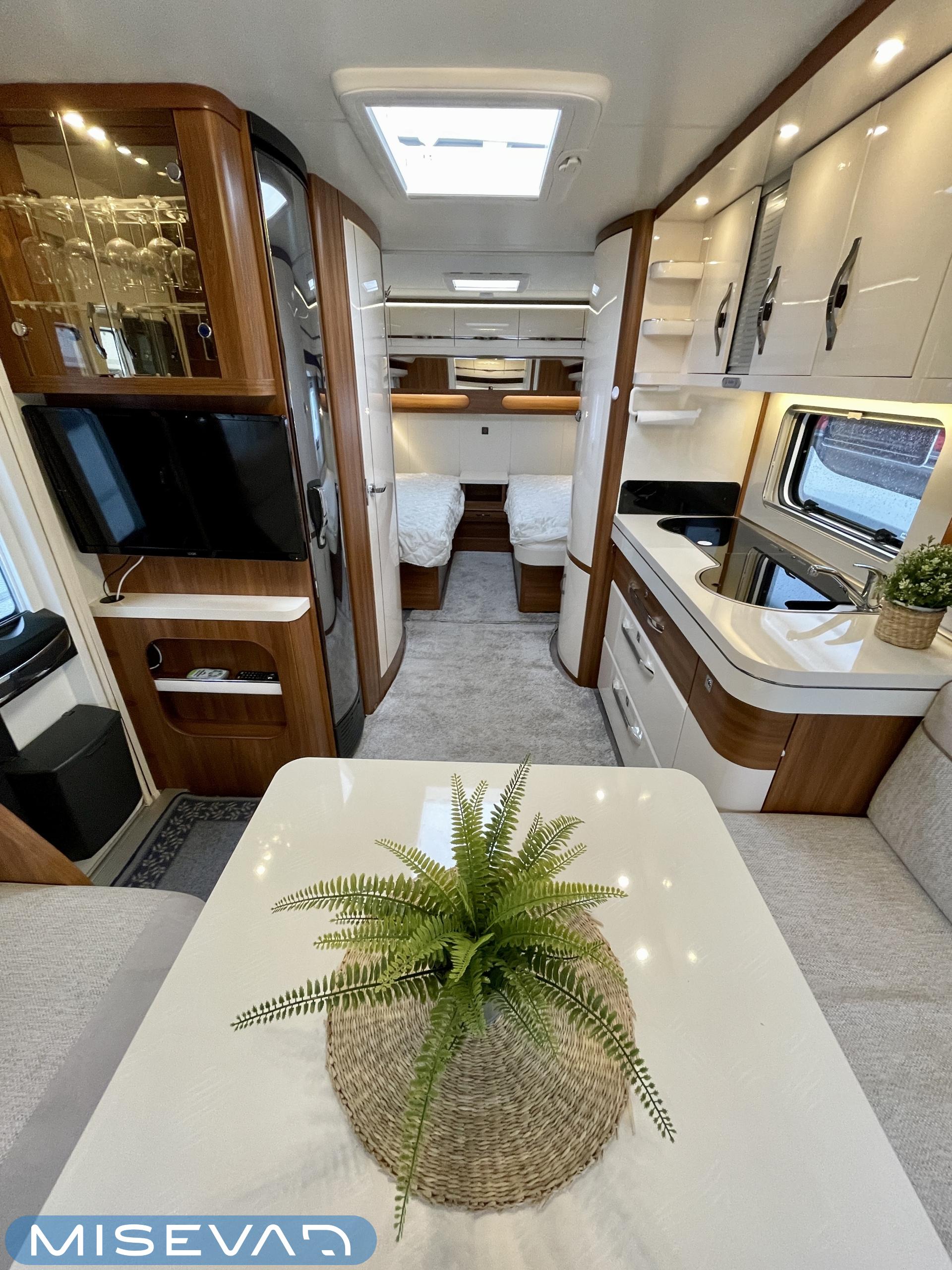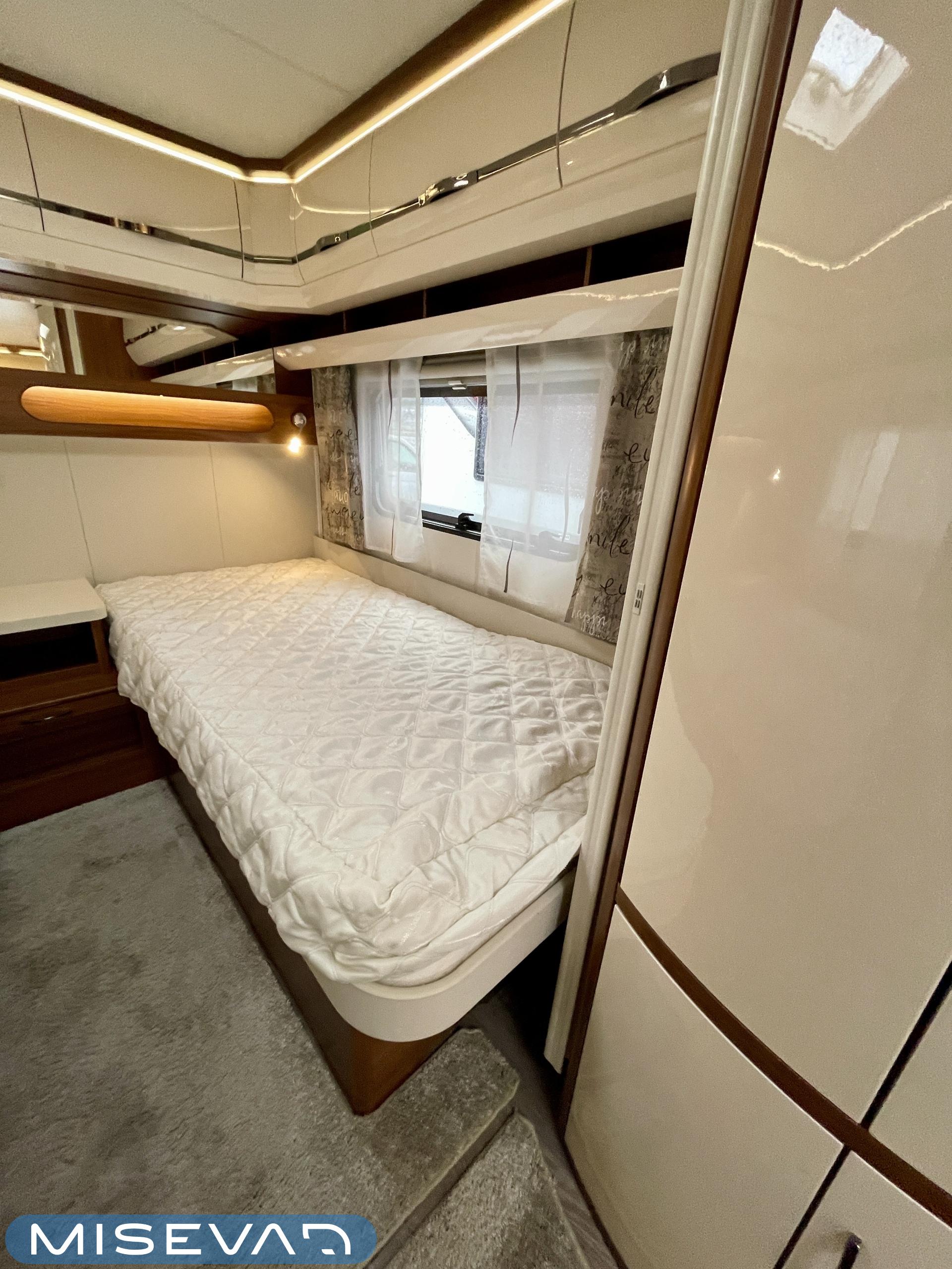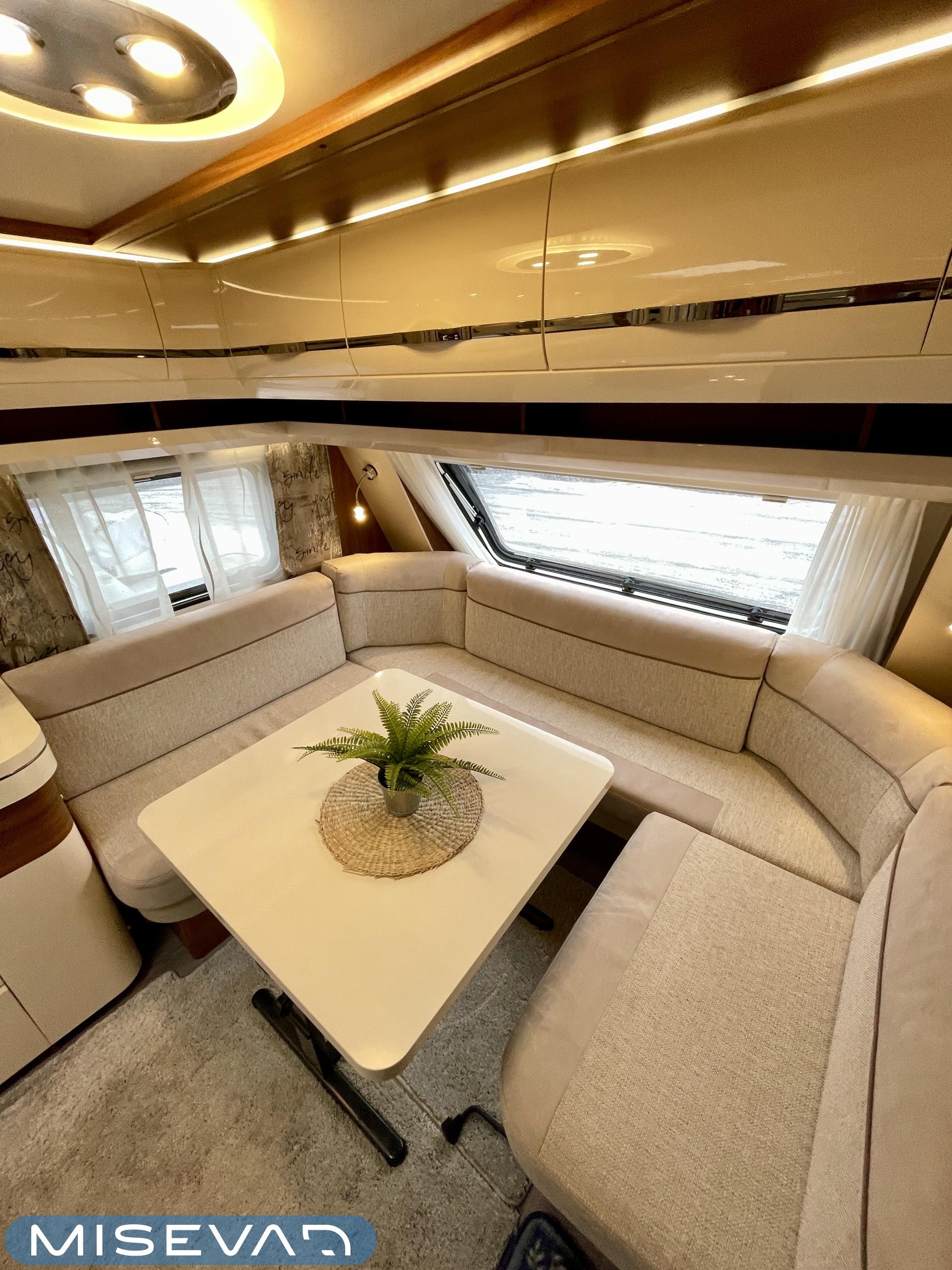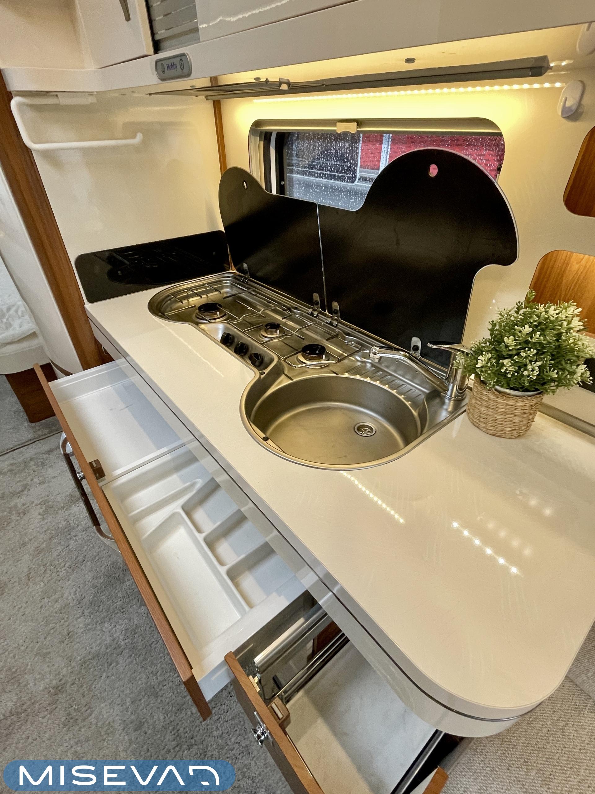Erillisvuoteet, Alde- nestekiertoinen keskuslämmitys, Sähköpatruuna, Tukijalat, Pesuallas, Pakastelokero, Nestekiertolämmitys, Liesi, Lämminvesiboileri, Markiisi, Kasetti WC, mover, jenkkijääkaappi, liesituuletin, sähkön ulosotto, Kasettiverhot, Kattoluukku, Lattialämmitys (sähkö), Asuinosan hyttysovi/verho