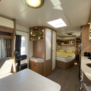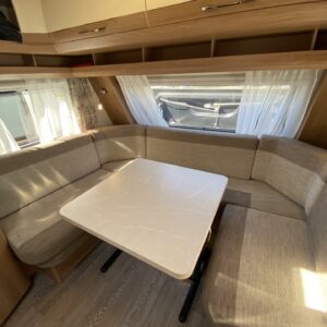 Hieno ilmastoitu teli- Hobby Alden nestekeskuslämmityksellä ja kattoilmastoinnilla. Tämä tyylikäs vaunu tarjoaa mukavat tilat kuudelle hengelle ja tämähän toimittaa kausipaikkavaunun virkaa vaikkapa ympärivuotisessa käytössä. Vaunun etuosaa hallitsee tilava U-ryhmä ja tästä saadaan tarvittaessa sijattua vuode kahdelle henkilölle. Taakse päin siirryttäessä seuraavana on keittiö ja WC/kylpyhuonetilat. Keittiöstä löytyy mm. täyskorkea jääkaappi, eli evästä mahtuu mukaan isommallekin ryhmälle. Seuraavaksi saavumme makuuhuoneeseen. Siellä on pitkittäinen parivuode ja pieni ”työpöytä”, sekä säilytystiloja. Vaunun takaosa on pyhitetty lasten valtakunnaksi. Siellä on poikittinen kerrosvuode, sekä oma pieni pöytäryhmä lasten askarteluja varten. Nämä kaikki eri osat saadaan väliovien avulla erotettua omiksi tiloiksi. Lämmityksenä on tehokas ja tasaisen lämmön tuottava Alden nestekeskuslämmitys ja vieläpä lattiakiertoisena. Lisäksi löytyy tietysti sähkövastukset, sekä lämminvesiboileri. Kesällä torpan sopivaan lämpötilaan viilentää kattoilmastointi. Tämä on erityisen hyvä varuste etenkin jos on lemmikit mukana reissussa. Ulkopuolen varusteina mm. markiisi, ja kaasun ulosotto. Tyylikäs peli kaikenkaikkiaan. Varmasti tutustumisen arvoinen tapaus.